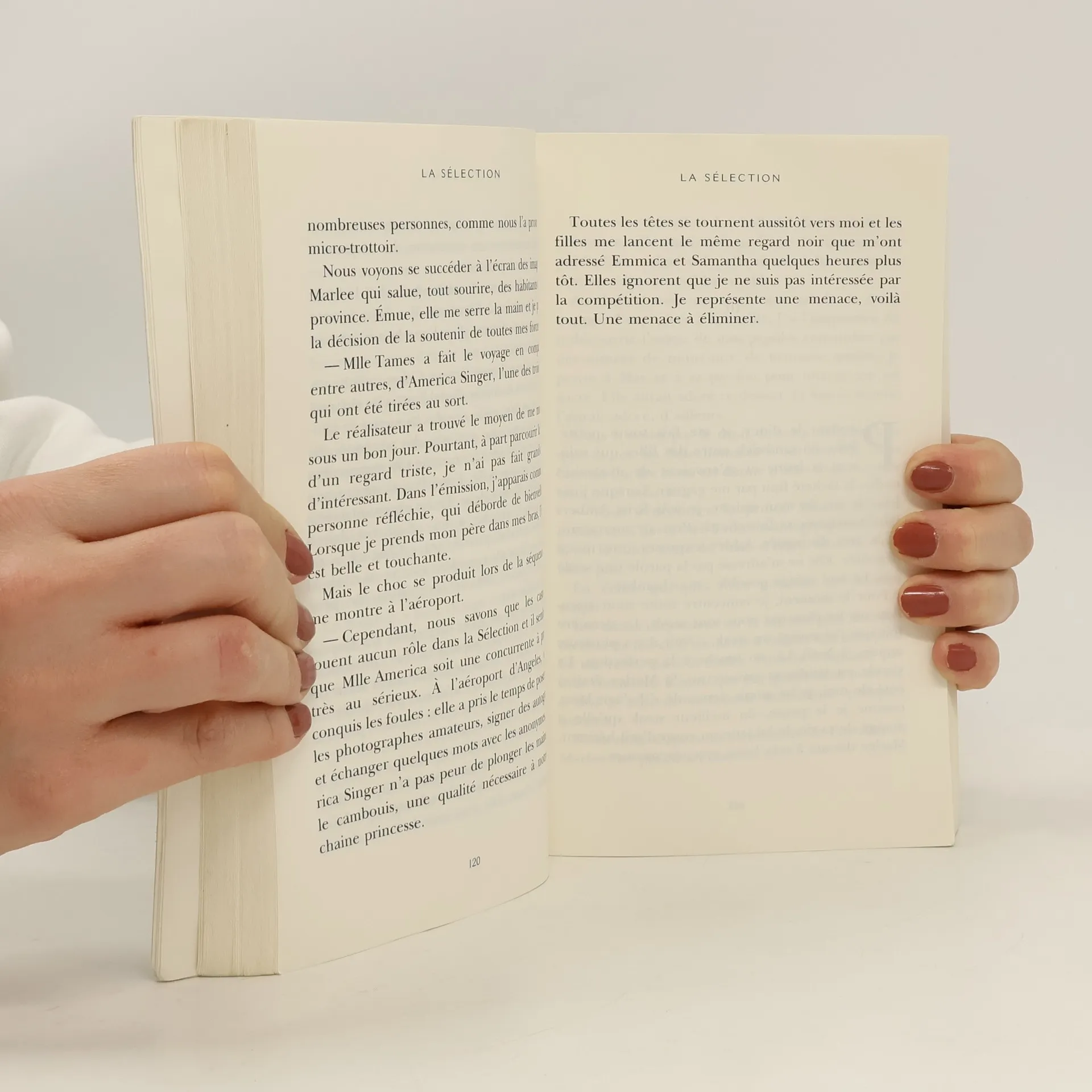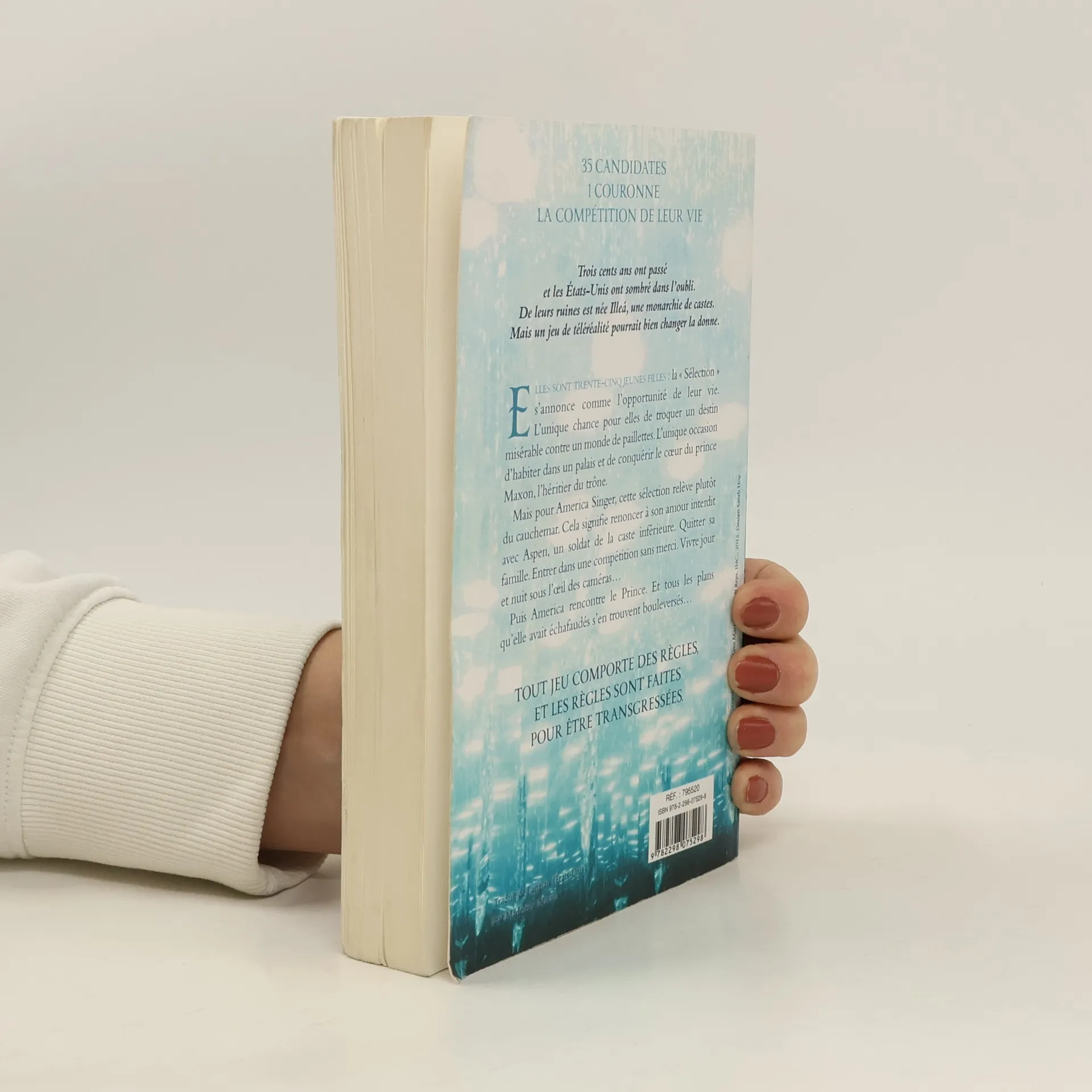 Elles sont trente cind jeunes filles : la "Sélection" s'annonce comme l'opportunité de leur vie. L'unique chance pour elles de troquer un destin misérable contre un monde de paillettes. L'unique occasion d'habiter dans un palais et de conquérir le coeur du prince Maxon, l'héritier du trône. Mais pour America Singer, cette sélection relève plutôt du cauchemar. Cela signifie renoncer à son amour interdit avec Aspen, un soldat de la caste inférieure. Quitter sa famille. Entrer dans une compétition sans merci. Vivre jour et nuit sous l'oeil des caméras. Puis America rencontre le Prince. Et tous les plans qu'elle avait échafaudés s'en trouvent bouleversés...