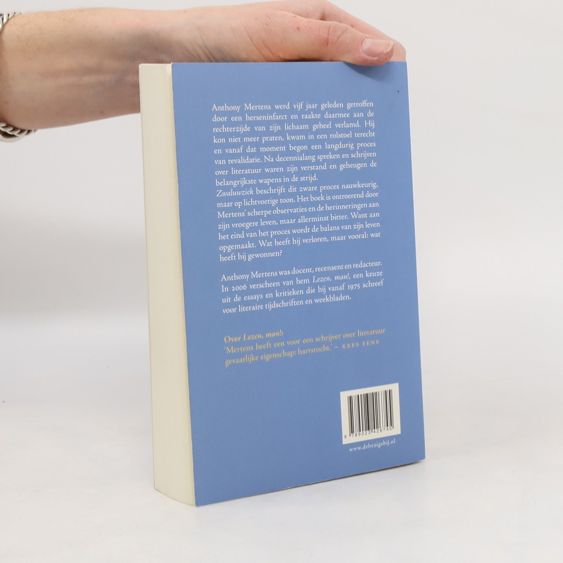 Autobiografisch verhaal van Anthony Mertens over de periode waarin hij een herseninfarct kreeg. Met observaties en herinneringen aan zijn vroegere leven die door het verhaal heen gevlochten zijn. Mertens schrijft dichtbij de ervaring, boeiend, vlot, oprecht, zichzelf niet ontziend en met een losse toon. Dat is knap, want het is ook een ontroerend boek over het menselijk leed van een ontregeld persoon. Een persoon die chaotisch en emotioneel op zoek is naar een nieuw evenwicht en een, door verandering van karakter, – gedeeltelijk- nieuw ‘ik’.