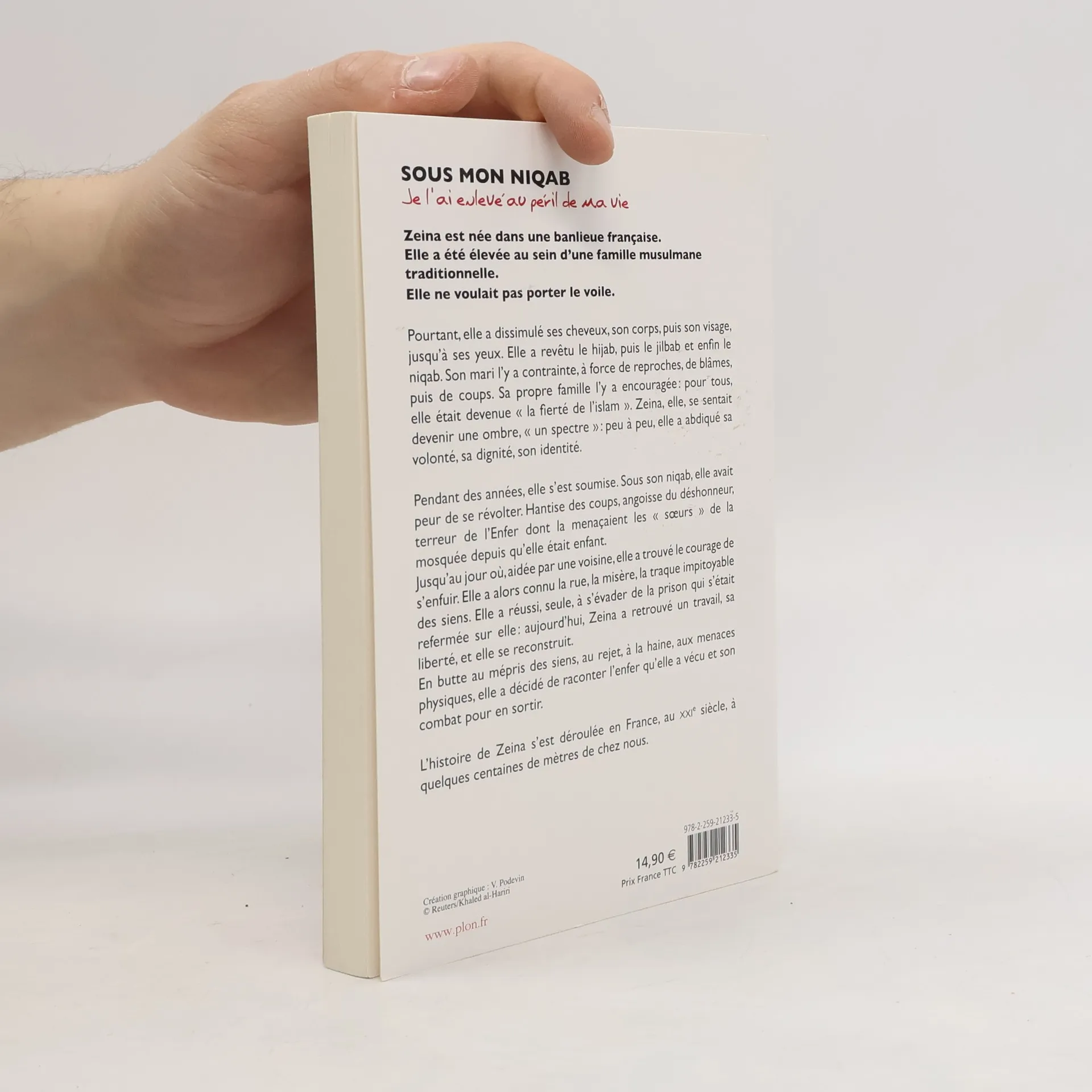 "Zeina est née dans une banlieue française. Elle a été élevée au sein d'une famille musulmane traditionnelle. Elle ne voulait pas porter le voile. Pourtant, elle a dissimulé ses cheveux, son corps, puis son visage, jusqu'à ses yeux. Elle a revêtu le hijab, puis le jilbab et enfin le niqab. Son mari l'y a contrainte, à force de reproches, de blâmes, puis de coups. Sa propre famille l'y a encouragée : pour tous, elle était devenue la fierté de l'Islam. Zeina, elle, se sentait devenir une ombre, un spectre : peu à peu, elle a abdiqué sa volonté, sa dignité, son identité. Pendant des années, elle s'est soumise. Sous son niqab, elle avait peur de se révolter. Hantise des coups, angoisse du déshonneur, terreur de l'Enfer dont la menaçaient les sœurs de la mosquée depuis qu'elle était enfant. Jusqu'au jour où, aidée par une voisine, elle a trouvé le courage de s'enfuir. Elle a alors connu la rue, la misère, la traque impitoyable des siens. Elle a réussi, seule, à s'évader de la prison qui s'était refermée sur elle : aujourd'hui, Zeina a retrouvé un travail, sa liberté, et elle se reconstruit. En butte au mépris des siens, au rejet, à la haine, aux menaces physiques, elle a décidé de raconter l'enfer qu'elle a vécu et son combat pour en sortir. L'histoire de Zeina s'est déroulée en France, au XXIème siècle, à quelques centaines de mètre de chez nous" -- from book cover.