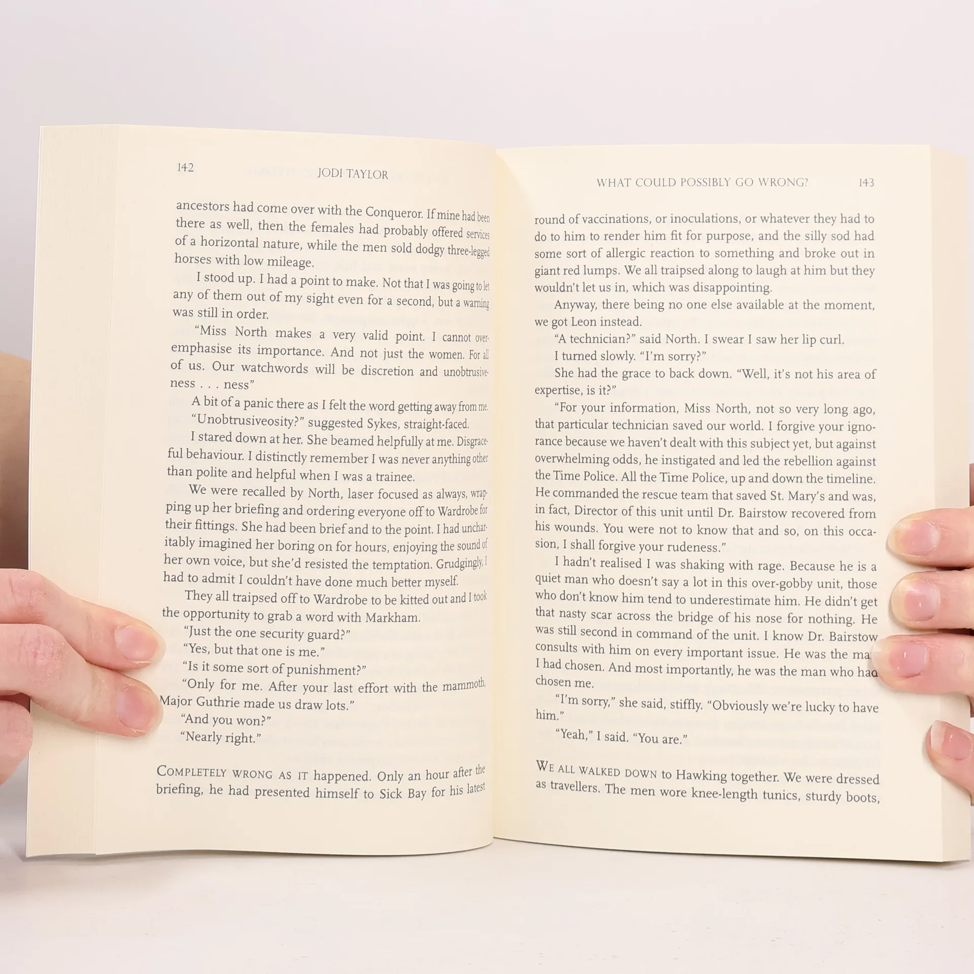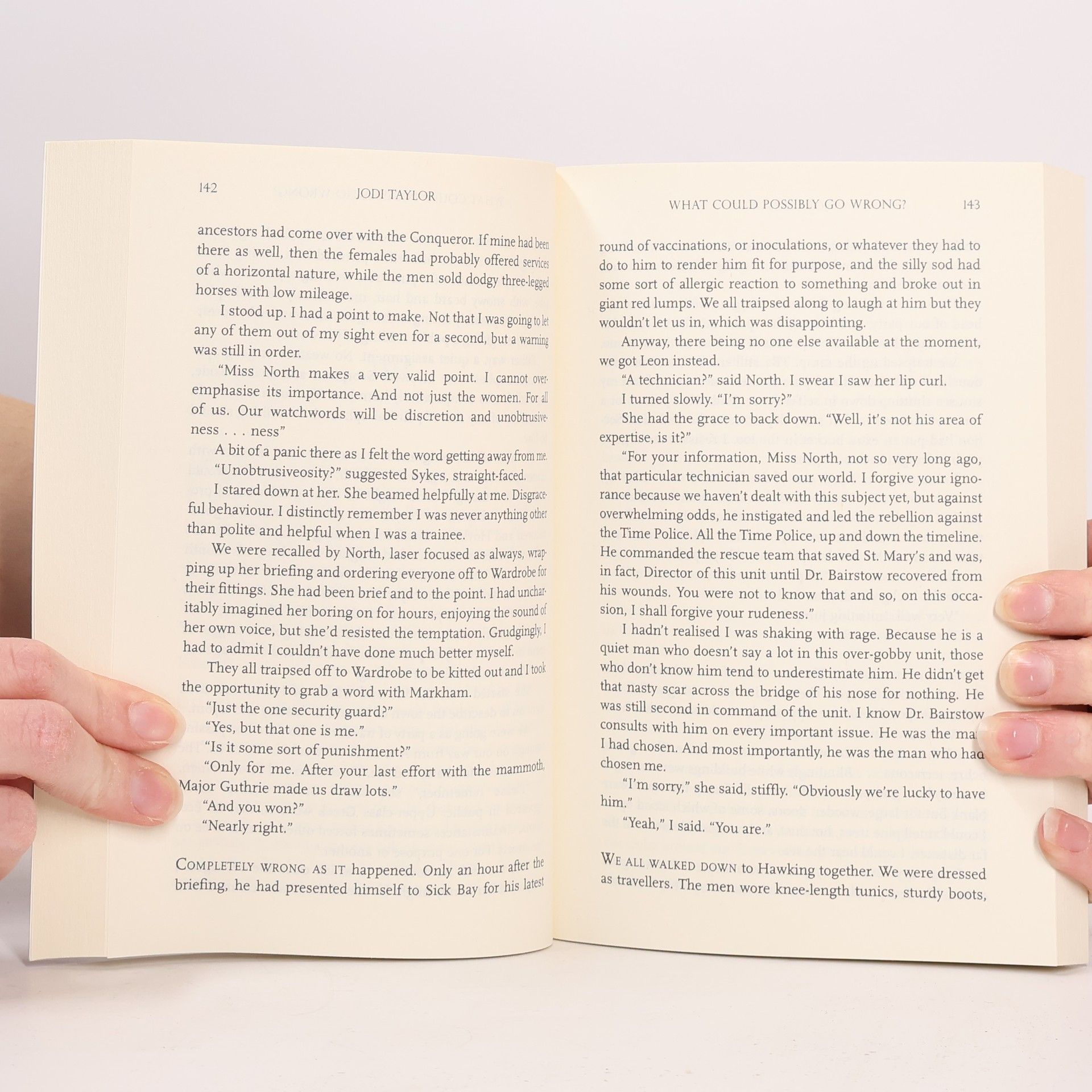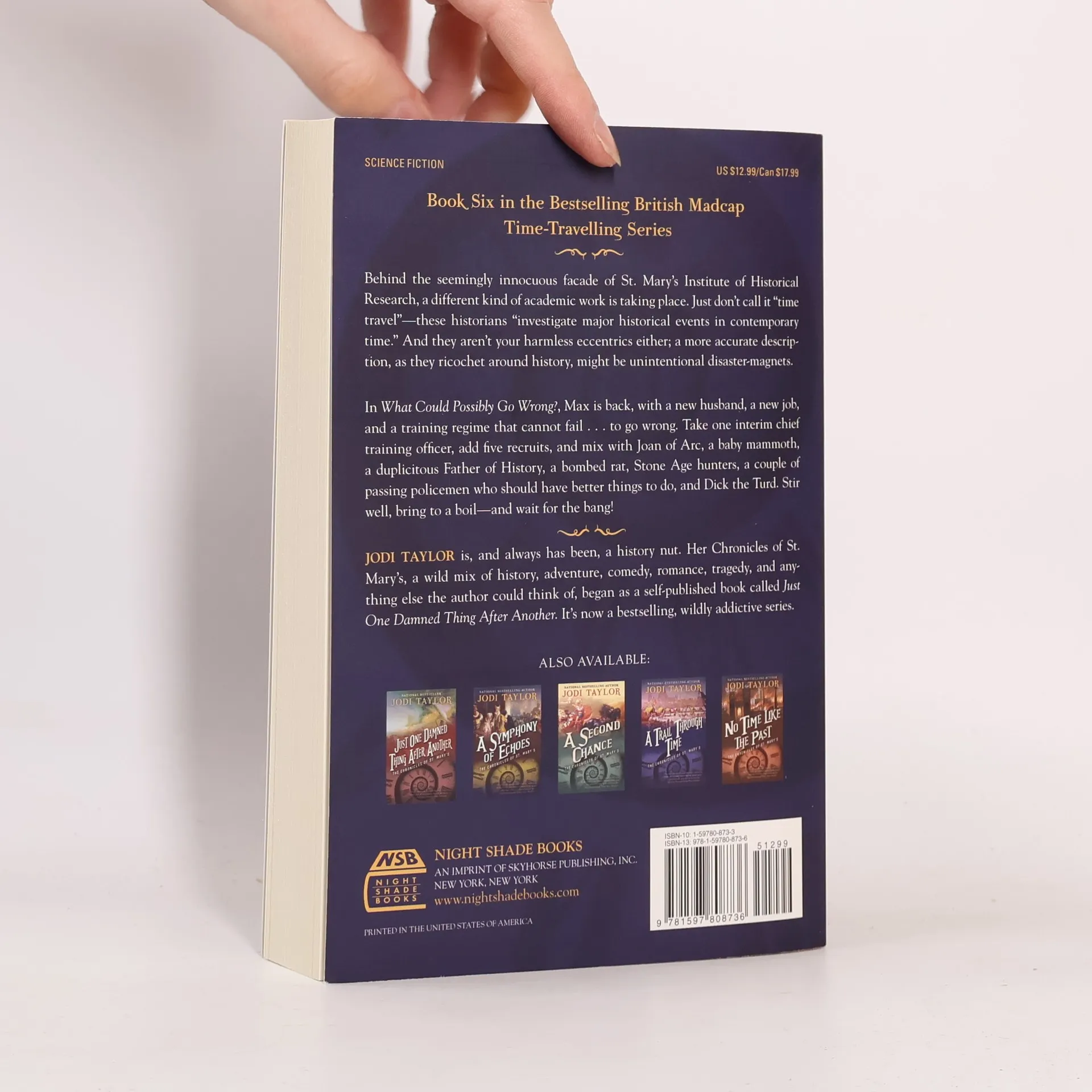 The sixth book in the bestselling British madcap time-travelling series, served with a dash of wit that seems to be everyone’s cup of tea. Behind the seemingly innocuous facade of St. Mary’s Institute of Historical Research, a different kind of academic work is taking place. Just don’t call it “time travel”—these historians “investigate major historical events in contemporary time.” And they aren’t your harmless eccentrics either; a more accurate description, as they ricochet around history, might be unintentional disaster-magnets. The Chronicles of St. Mary’s tells the madcap adventures of Madeleine Maxwell and her compatriots—Director Bairstow, Leon “Chief” Farrell, Mr. Markham, and many more—as they travel through time, saving the St. Mary’s Institute (too often by the very seat of their pants) and thwarting time-travelling terrorists, all the while leaving plenty of time for tea. In What Could Possibly Go Wrong? Max is back, with a new husband, a new job, and a training regime that cannot fail . . . to go wrong. Take one interim chief training officer, add five recruits, and mix with Joan of Arc, a baby mammoth, a duplicitous Father of History, a bombed rat, Stone Age hunters, a couple of passing policemen who should have better things to do, and Dick the Turd. Stir well, bring to a boil—and wait for the bang!
