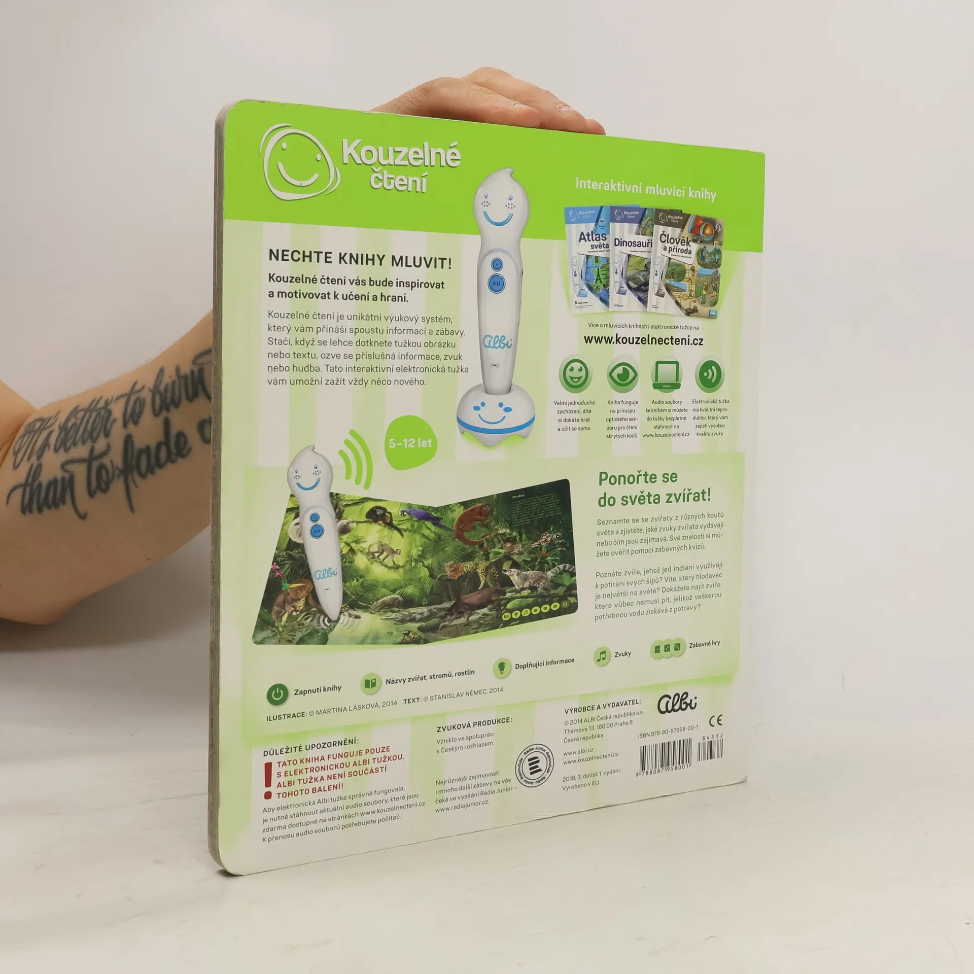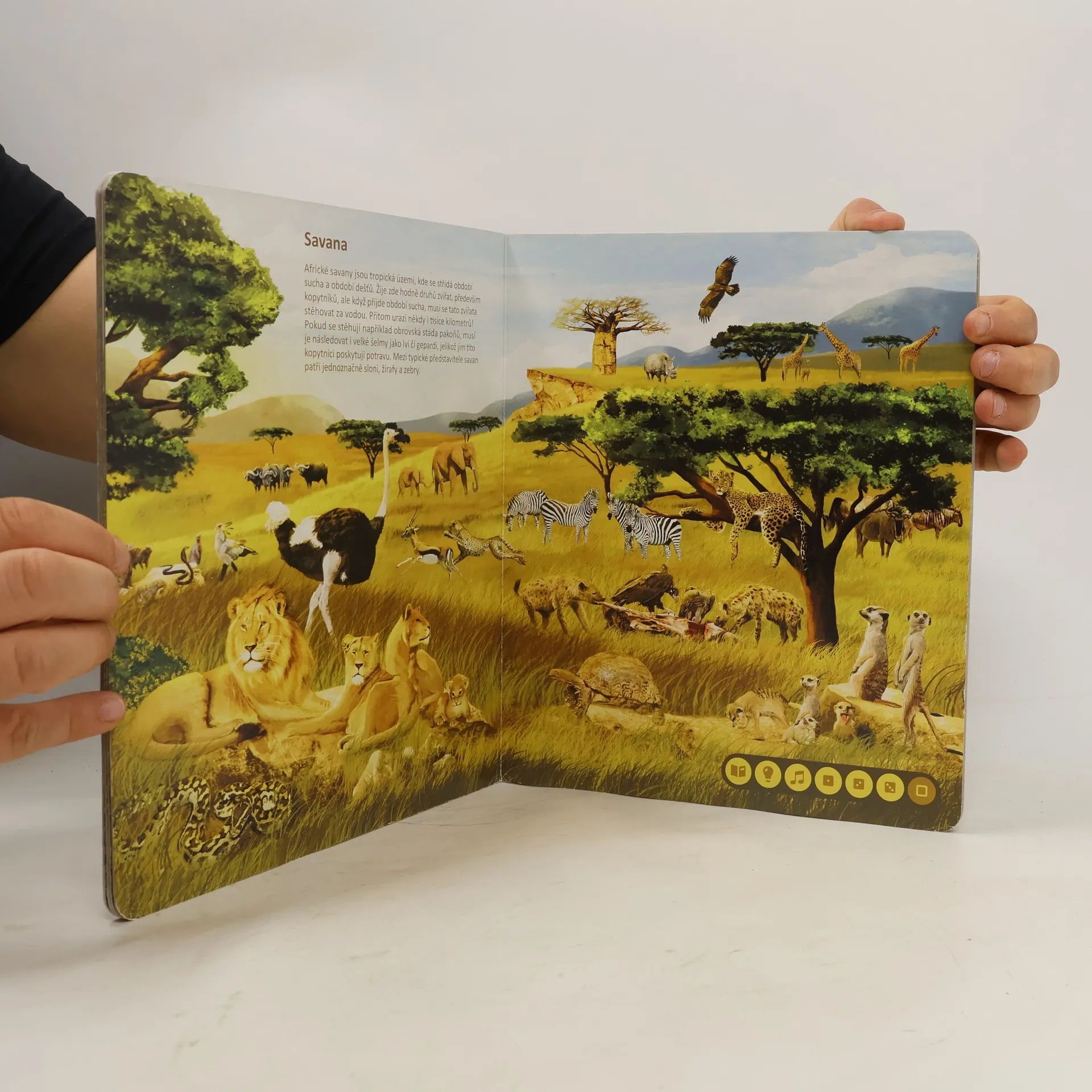 Ponořte se do světa zvířat! Seznamte se se zvířaty ze všech koutů světa a zjistěte, jaké zvuky vydávají, čím se živí nebo čím jsou jedinečná. Kniha vás tématicky provede osmi různými prostředími z naší planety, jako je les, savana, poušť, moře a další. Na každé straně se dozvíte, jaká zvířata v daném prostředí žijí, jak se jmenují, jaké zvuky vydávají a čím jsou zajímavá. Své znalosti si pak můžete ověřit pomocí zábavných kvízů, které jsou vždy rozděleny do tří kategorií: najdi zvíře podle názvu, najdi zvíře podle zvuku, najdi zvíře podle zajímavosti. Kniha je namluvena známým českým hercem Otakarem Brouskem ml. Kniha obsahuje přes 900 zvuků a textů. Kniha vznikla ve spolupráci s Českým rozhlasem.