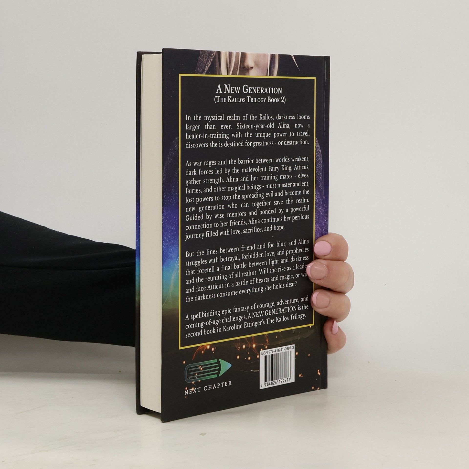 In the mystical realm of the Kallos, darkness looms larger than ever. Sixteen-year-old Alina, now a healer-in-training with the unique power to travel, discovers she is destined for greatness - or destruction. As war rages and the barrier between worlds weakens, dark forces led by the malevolent Fairy King, Atticus, gather strength. Alina and her training mates - elves, fairies, and other magical beings - must master ancient, lost powers to stop the spreading evil and become the new generation who can together save the realm. Guided by wise mentors and bonded by a powerful connection to her friends, Alina continues her perilous journey filled with love, sacrifice, and hope. But the lines between friend and foe blur, and Alina struggles with betrayal, forbidden love, and prophecies that foretell a final battle between light and darkness and the reuniting of all realms. Will she rise as a leader and face Atticus in a battle of hearts and magic, or will the darkness consume everything she holds dear? A spellbinding epic fantasy of courage, adventure, and coming-of-age challenges, A NEW GENERATION is the second book in Karoline Ettinger's The Kallos Trilogy.