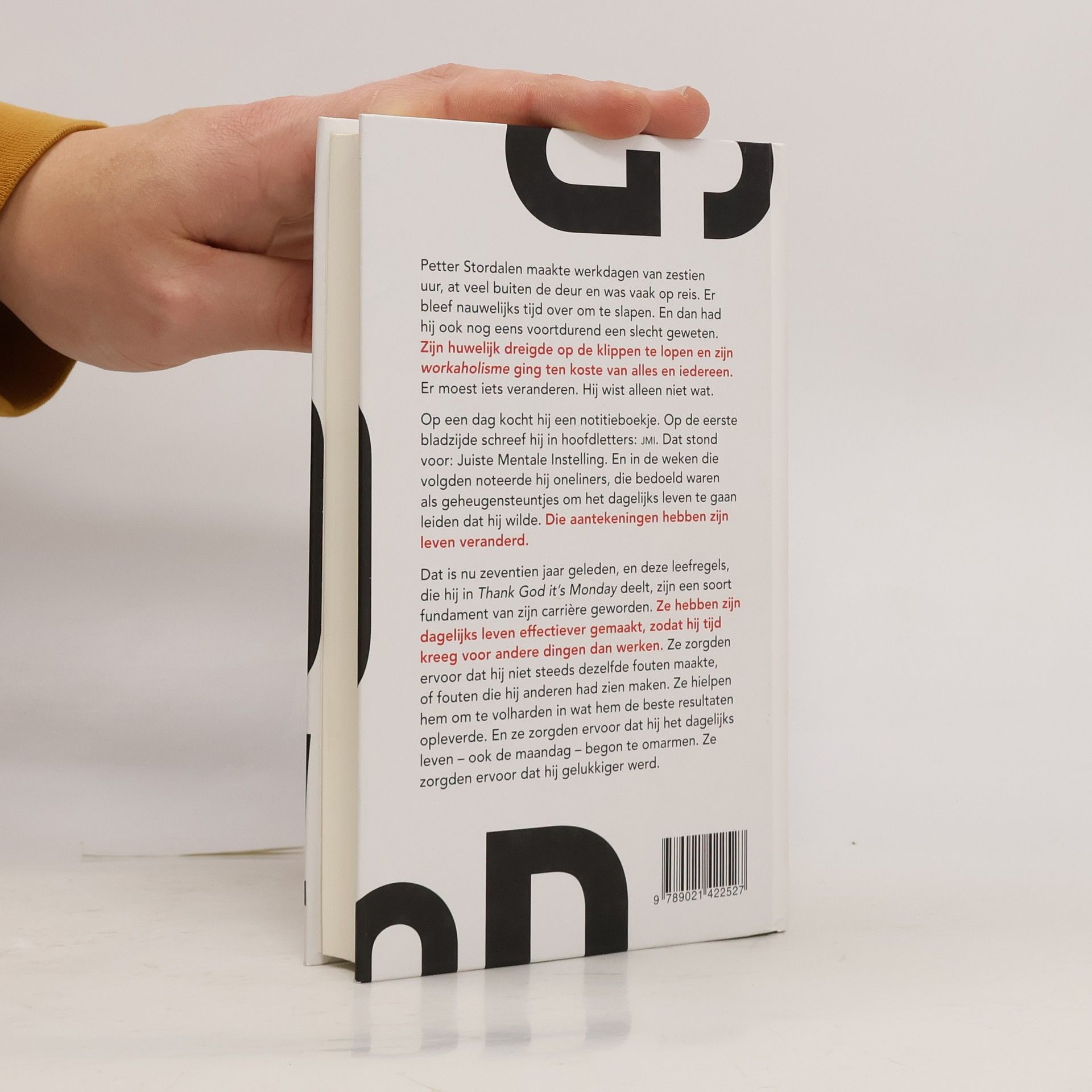 Petter Stordalen maakte werkdagen van zestien uur, at veel buiten de deur en was vaak op reis. Er bleef nauwelijks tijd over om te slapen. En dan had hij ook nog eens voortdurend een slecht geweten. Zijn huwelijk dreigde op de klippen te lopen en zijn workaholisme ging ten koste van alles en iedereen. Er moest iets veranderen. Hij wist alleen niet wat. Op een dag kocht hij een notitieboekje. Op de eerste bladzijde schreef hij in hoofdletters: JMI. Dat stond voor: Juiste Mentale Instelling. En in de weken die volgden noteerde hij oneliners, die bedoeld waren als geheugensteuntjes om het dagelijks leven te gaan leiden dat hij wilde. Die aantekeningen hebben zijn leven veranderd. Dat is nu zeventien jaar geleden, en deze leefregels, die hij in Thank God it's Monday deelt, zijn een soort fundament van zijn carrière geworden. Ze hebben zijn dagelijks leven effectiever gemaakt, zodat hij tijd kreeg voor andere dingen dan werken. Ze zorgden ervoor dat hij niet steeds dezelfde fouten maakte, of fouten die hij anderen had zien maken. Ze hielpen hem om te volharden in wat hem de beste resultaten opleverde. En ze zorgden ervoor dat hij het dagelijks leven – ook de maandag – begon te omarmen. Ze zorgden ervoor dat hij gelukkiger werd.