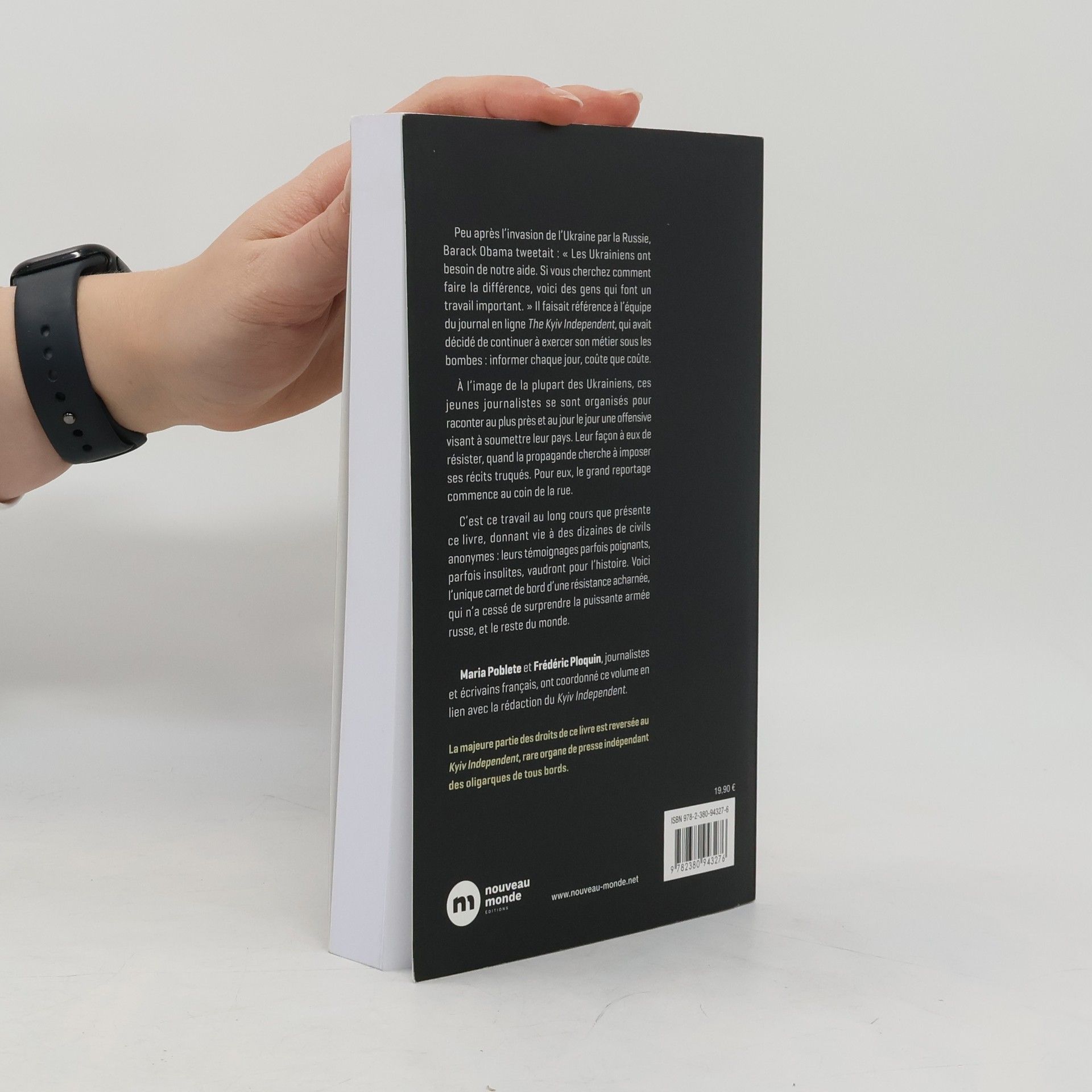 Peu après l’invasion de l’Ukraine par la Russie, Barack Obama tweetait : « Les Ukrainiens ont besoin de notre aide. Si vous cherchez comment faire la différence, voici des gens qui font un travail important. » Il faisait référence à l’équipe du journal en ligne The Kyiv Independent , qui avait décidé de continuer à exercer son métier sous les bombes : informer chaque jour, coûte que coûte. À l’image de la plupart des Ukrainiens, ces jeunes journalistes se sont organisés pour raconter au plus près et au jour le jour une offensive visant à soumettre leur pays. Leur façon à eux de résister, quand la propagande cherche à imposer ses récits truqués. Pour eux, le grand reportage commence au coin de la rue.C’est ce travail au long cours que présente ce livre, donnant vie à des dizaines de civils anonymes : leurs témoignages parfois poignants, parfois insolites, vaudront pour l’Histoire. Voici l’unique carnet de bord d’une résistance acharnée, qui n’a cessé de surprendre la puissante armée russe, et le reste du monde. Maria Poblete et Frédéric Ploquin, journalistes et écrivains français, ont coordonné ce volume en lien avec la rédaction du Kyiv Independent . La majeure partie des droits de ce livre est reversée au Kyiv Independent , rare organe de presse indépendant des oligarques de tous bords.