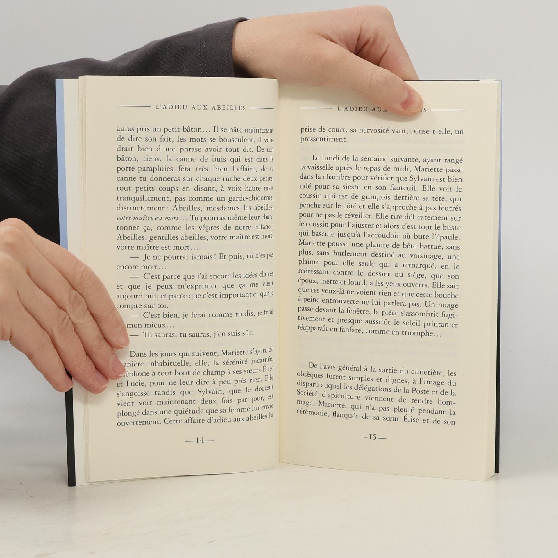 Elle a expliqué à Maurice ce qu'étaient les instructions, étranges peut-être mais impératives, de Sylvain à propos du cérémonial des abeilles. L'adieu aux abeilles qu'il était grand temps d'accomplir. Bah ! dit l'autre, la belle affaire, je m'en occuperai, moi, de tes abeilles. Mariette objecte que c'est à elle qu'on a demandé d'assumer, pas à lui, de telle sorte qu'une substitution de personne serait inconvenante. Mais l'autre, le fier-à-bras, est de ceux qui n'ont jamais hésité devant les obstacles... Quand il se présente, le matin suivant, devant les sept ruches avec la trique trouvée dans la remise, Maurice affiche une fierté de chevalier partant pour la croisade. Levant son bâton au-dessus de la première ruche, il en assène un solide coup et s'exclame : Votre maître est mort ! Il aborde à peine la troisième qu'il est submergé d'abeilles, sa tête et ses épaules soudain disparaissant sous un essaim visiblement furieux. Il se débat tant bien que mal, choisit heureusement la fuite qui lui épargnera le pire et, au bout du compte, il s'en tire avec quelques piqûres qui valent instantanément leçon d'humilité. Et ces dames lui prodiguent compresses et réconfort, décidément que deviendrait-on sans elles ?