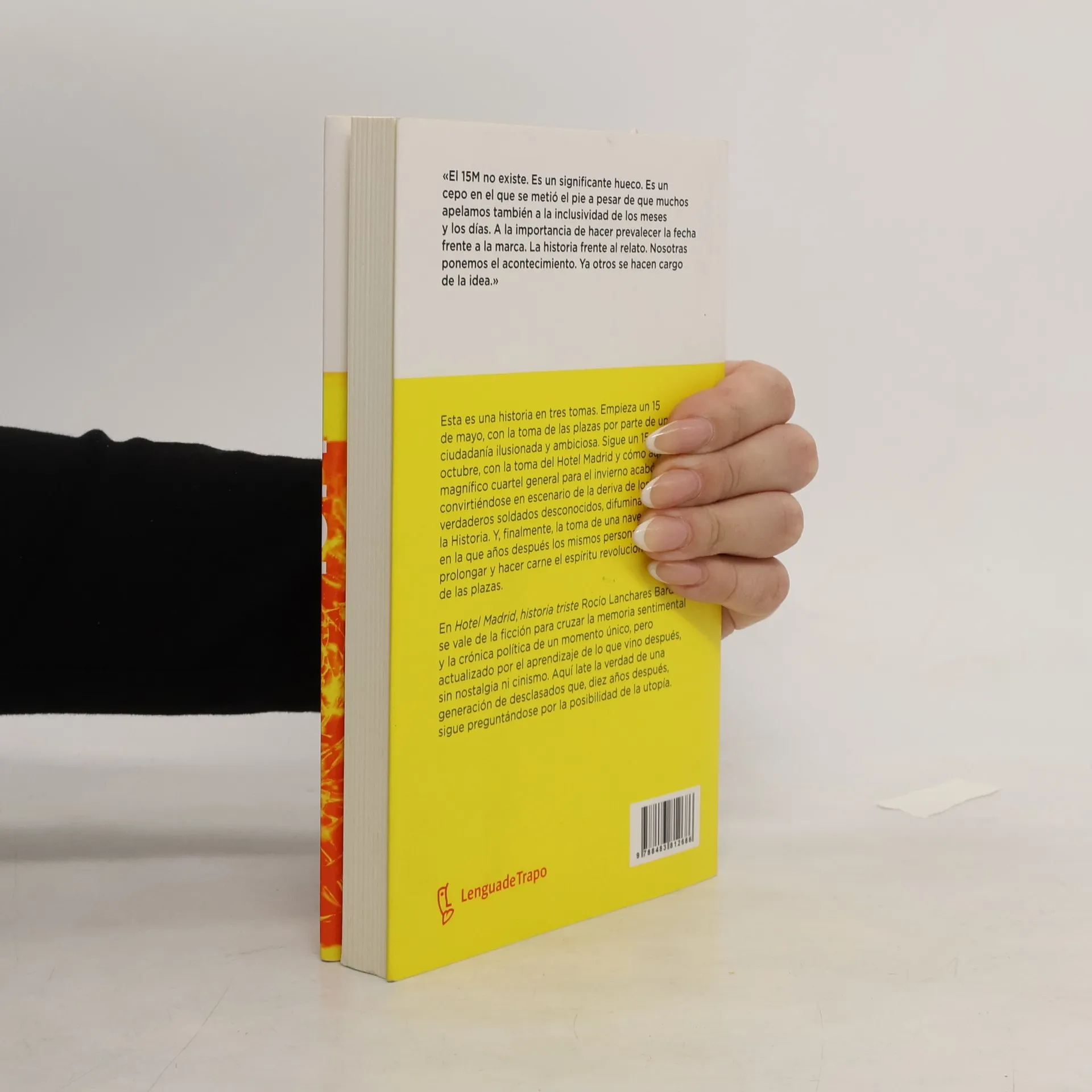 «El 15M no existe. Es un significante hueco. Es un cepo en el que se metió el pie a pesar de que muchos apelamos también a la inclusividad de los meses y los días. A la importancia de hacer prevalecer la fecha frente a la marca. La historia frente al relato. Nosotras ponemos el acontecimiento. Ya otros se hacen cargo de la idea.» Esta es una historia en tres tomas. Empieza un 15 de mayo, con la toma de las plazas por parte de una ciudadanía ilusionada y ambiciosa. Sigue un 15 de octubre, con la toma del Hotel Madrid y cómo aquel magnífico cuartel general para el invierno acabó convirtiéndose en escenario de la deriva de los walker, verdaderos soldados desconocidos, difuminados por la Historia. Y, finalmente, la toma de una nave industrial, en la que años después los mismos personajes intentan prolongar y hacer carne el espíritu revolucionario de las plazas. En Hotel Madrid, historia triste Rocío Lanchares Bardají se vale de la ficción para cruzar la memoria sentimental y la crónica política de un momento único, pero actualizado por el aprendizaje de lo que vino después, sin nostalgia ni cinismo. Aquí late la verdad de una generación de desclasados que, diez años después, sigue preguntándose por la posibilidad de la utopía.