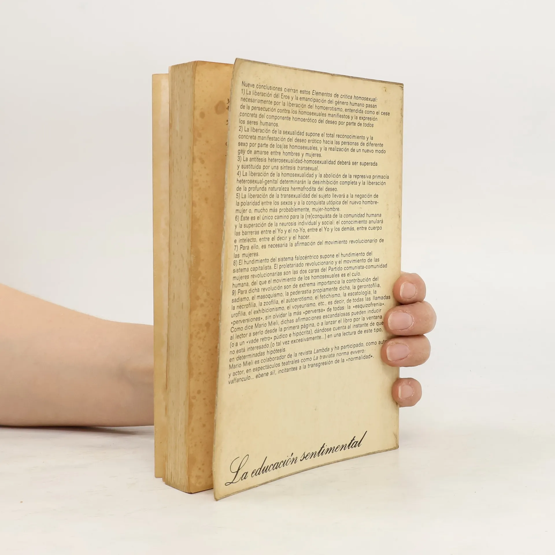 Nueve conclusiones cierran estos Elementos de crítica homosexual: 1) La liberación del Eros y la emancipación del género humano pasann ecesariamente por la liberación del homoerotismo, entendida como el cese de la persecución contra los homosexuales manifiestos y la expresión concreta del componente homoerótico del deseo por parte de todos los seres humanos. 2) La liberación de la sexualidad supone el total reconocimiento y la concreta manifestación del deseo erótico hacia las personas de diferente sexo por parte de los/as homosexuales, y la realización de un nuevo modo gay de amarse entre hombres y mujeres. 3) La antítesis heterosexualidad-homosexualidad deberá ser superada y sustituida por una sintesis transexual. 4) La liberación de la homosexualidad y la abolición de la represiva primacia heterosexual-genital determinarán la desinhibición completa y la liberación de la profunda naturaleza hermafrodita del deseo. 5) La liberación de la transexualidad del sujeto llevará a la negación de la polaridad entre los sexos y a la conquista utópica del nuevo hombre-mujer o, mucho más probablemente, mujer-hombre. 6) Este es el único camino para la (re)conquista de la comunidad humana y la superación de la neurosis individual y social: el conocimiento anulará las barreras entre el Yo y el no-Yo, entre el Yo y los demás, entre cuerpo e intelecto, entre el decir y el hacer. 7) Para ello, es necesaria la afirmación del movimiento revolucionario de las mujeres. 8) El hundimiento del sistema falocéntrico supone el hundimiento del sistema capitalista. El proletariado revolucionario y el movimiento de las mujeres revolucionarias son las dos caras del Partido comunista-comunidad humana, del que el movimiento de los homosexuales es el culo. 9) Para dicha revolución son de extrema importancia la contribución del sadismo, el masoquismo, la pederastia propiamente dicha, la gerontofilia, la necrofilia, la zoofilia, el autoerotismo, el fetichismo, la escatología, la urofilia, el exhibicionismo, el voyeurismo, etc., es decir, de todas las llamadas «perversiones», sin olvidar la más «perversa» de todas: la «esquizofrenia». Como dice Mario Mieli, dichas afirmaciones escandalosas pueden inducir al lector a serlo desde la primera página, o a lanzar el libro por la ventana (o a un «vade retro» púdico e hipócrita), dándose cuenta al instante de que no está interesado (o tal vez excesivamente...) en una lectura de este tipo, en determinadas hipótesis. Mario Mieli es colaborador de la revista Lambda y ha participado, como autor y actor, en espectáculos teatrales como La traviata norma evvero: vaffanculo... ebene si!, incitantes a la transgresión de la «normalidad».