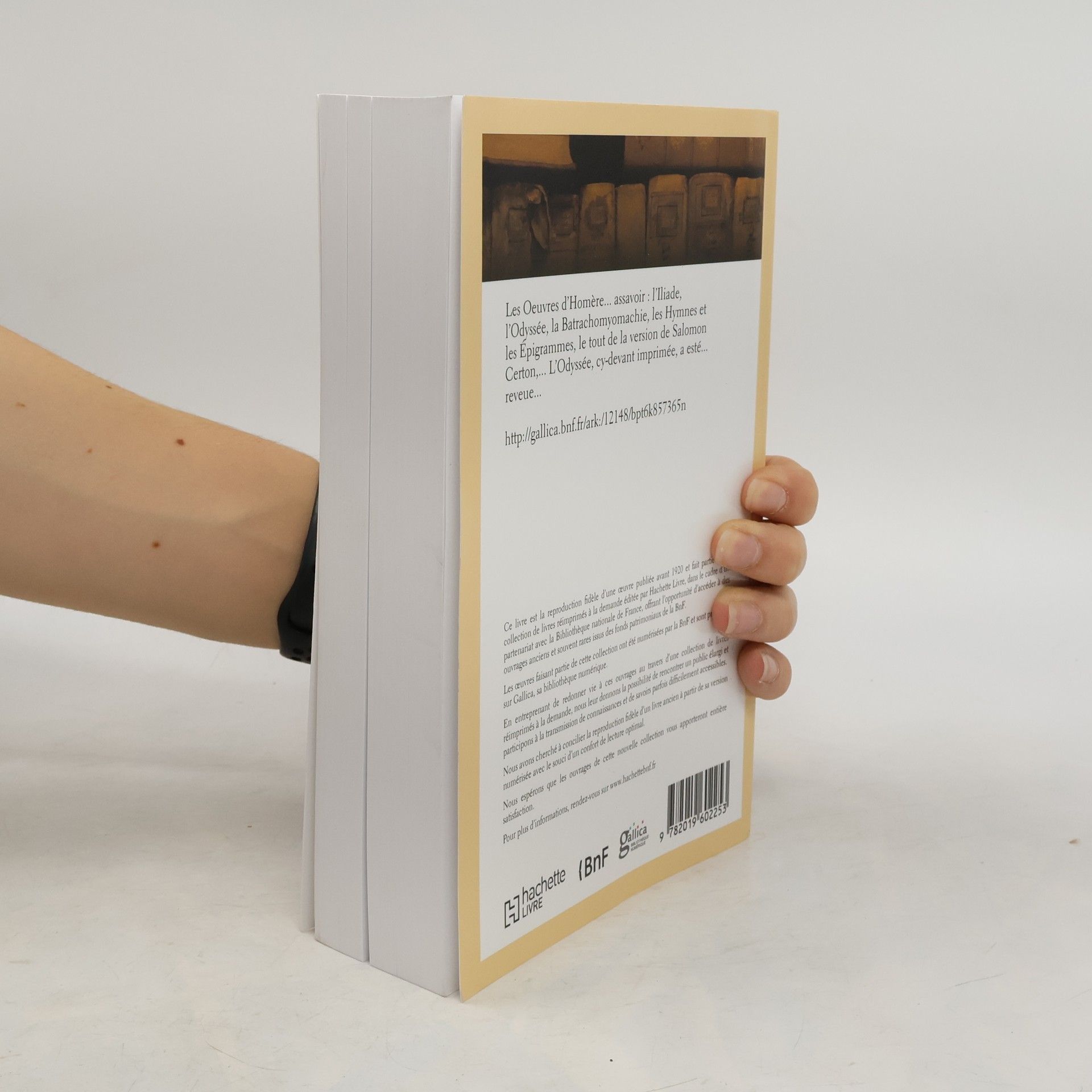 Les Oeuvres d'HomA]re... assavoir: l'Iliade, l'OdyssA(c)e, la Batrachomyomachie, les Hymnes et les A0/00pigrammes, le tout de la version de Salomon Certon, ... L'OdyssA(c)e, cy-devant imprimA(c)e, a estA(c)... reveue... Date de l'A(c)dition originale: 1615 Ce livre est la reproduction fidA]le d'une oeuvre publiA(c)e avant 1920 et fait partie d'une collection de livres rA(c)imprimA(c)s A la demande A(c)ditA(c)e par Hachette Livre, dans le cadre d'un partenariat avec la BibliothA]que nationale de France, offrant l'opportunitA(c) d'accA(c)der A des ouvrages anciens et souvent rares issus des fonds patrimoniaux de la BnF. Les oeuvres faisant partie de cette collection ont A(c)tA(c) numA(c)risA(c)es par la BnF et sont prA(c)sentes sur Gallica, sa bibliothA]que numA(c)rique. En entreprenant de redonner vie A ces ouvrages au travers d'une collection de livres rA(c)imprimA(c)s A la demande, nous leur donnons la possibilitA(c) de rencontrer un public A(c)largi et participons A la transmission de connaissances et de savoirs parfois difficilement accessibles. Nous avons cherchA(c) A concilier la reproduction fidA]le d'un livre ancien A partir de sa version numA(c)risA(c)e avec le souci d'un confort de lecture optimal. Nous espA(c)rons que les ouvrages de cette nouvelle collection vous apporteront entiA]re satisfaction. Pour plus d'informations, rendez-vous sur www.hachettebnf.fr