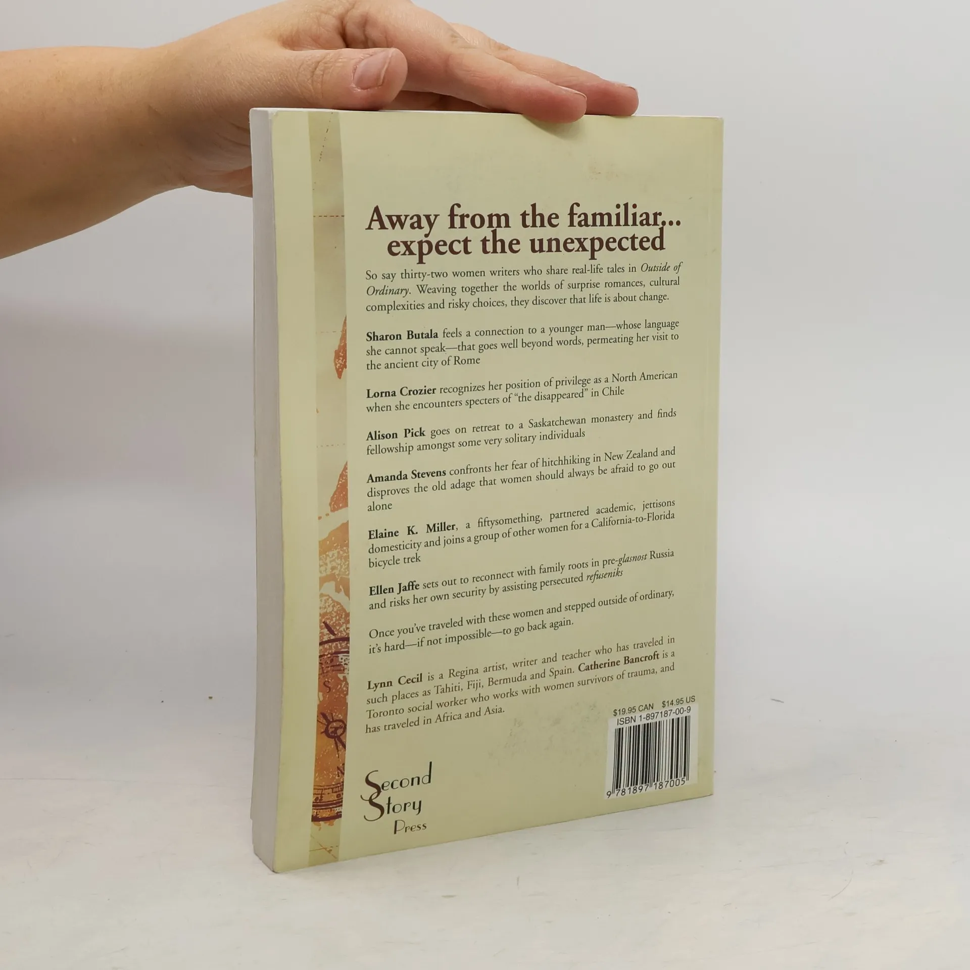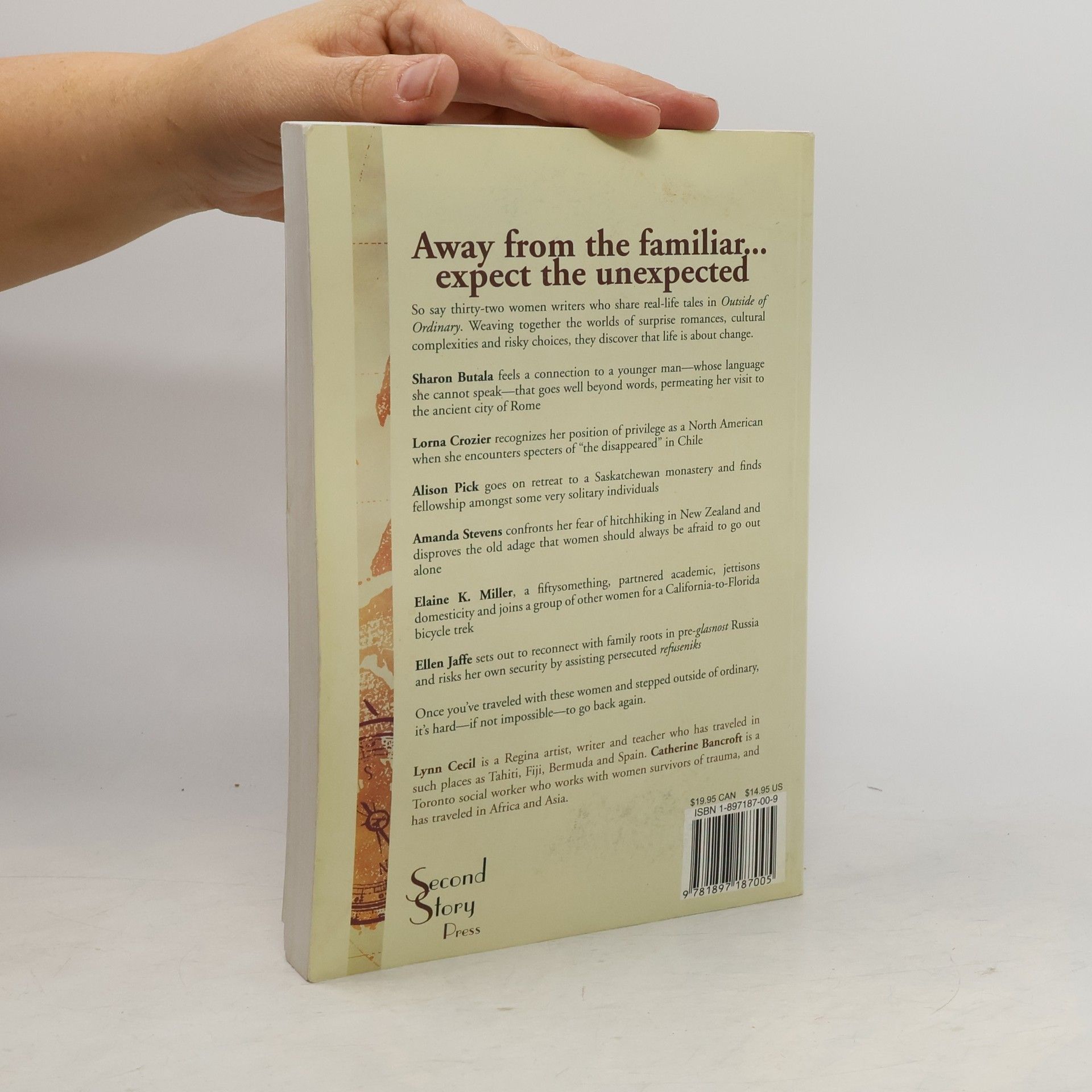 Outside of Ordinary is Dropped Threads meets Around the World in 80 Days. Thirty-two women writers, including CanLit luminaries Sharon Butala (Lilac Moon, The Perfection of Morning), Lorna Crozier (Whetstone, Apocrypha of Light), and Alison Pick (The Sweet Edge) speak frankly about real-life travel experiences. Whether around the corner or around the globe, each woman explores both the inner and outer journeys that they have undertaken. From muddled romance to illegal smuggling, and isolated retreats to rigorous development work, these women have done it -- unexpectedly, sometimes, but always without regret.Suspended in solitude / Kathie Sutherland --Bocca della Verità / Sharon Butala --Jaws in a bowl / Jane Eaton Hamilton --Sundowners in the Cockpit / Jeananne Kathol Kirwin --Roads to Iowa (... and a few other places not on the map) / Alison Lohans --Traveling: poetic notes / Holly Luhning --Shifting Gears / Elaine K. Miller --The Hero(ine)'s journey / Janet Greidanus --A Russian journey: Cold War and fragile peace / Ellen S. Jaffe --Fear of hitchhiking / Amanda Stevens --Chilean winter / Lorna Crozier --I Was a Swami in Mexico / Linda Pelton --The rule / Alison Pick --A healing beauty / Charlotte Caron --Ways of knowing / Jan MacKie --Lautan / Jody Wood --Passages / Catherine Bancroft --The edge of risk / Chris Marin --Made in Taiwan / Angèle M.C. Palmer --Journey / Amy / Coupal --"I'm not just here to take a walk, you know ...!" / Christine McKenzie --The missionary and her mission / Sarahmaya Hamilton --Growing up in Shanghai / Marion Jones --Indelible gifts / Anne M. Sasso --Gift of whimsy / Carole TenBrink --Day and night in the Horn of Africa / Cheryl Mahaffy --Andalusian admissions: becoming my mother's daughter / Larissa L. McWhinney --Travels to Momostenango: every day has a face / Gillian Steward --From Thailand to Japan / Christina Owens --Yukon Odyssey / Aprille Janes --Calle 55: notes from the Canada-Mexico writing/photography exchange / Shelley A. Leedahl --Separate spheres / Lynn Cecil