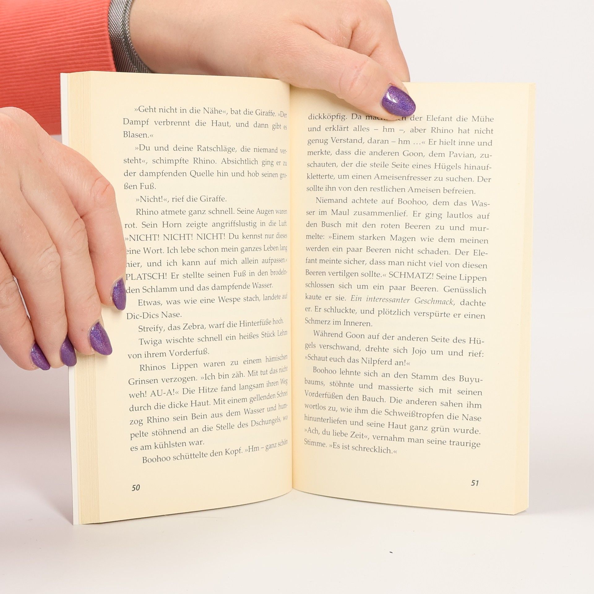 Rhino, das Nashorn, ist der Größte. Niemand hat ihm etwas zu sagen, nicht einmal der Elefant Nhembo. 'Ich tue, was ich will, wann ich es will und wie ich es will' ist sein Wahlspruch. Das kann man sich ja wohl auch leisten, wenn man so dicke Muskeln und so ein langes Horn hat! Aber pass auf, Rhino! Sonst merkst du nicht, wie du dir gleich dein Horn verbeulst.