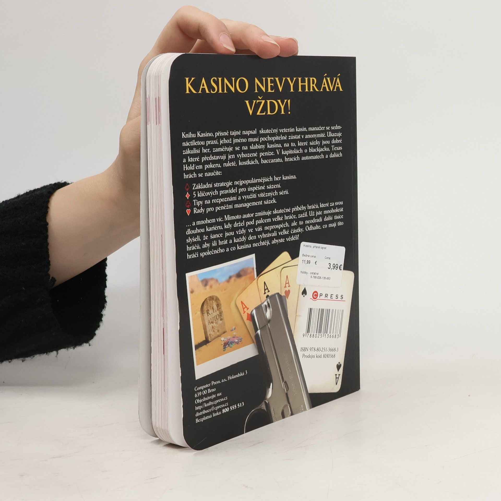 Knihu Kasino - přísně tajné napsal zkušený manažer her v kasinu, jehož jméno musí pochopitelně zůstat v anonymitě. Ukazuje zákulisí her, zaměřuje se na slabiny kasina, na to, které sázky jsou dobré a které představují jen vyhozené peníze. V kapitolách o blackjacku, Texas Hold´em pokeru, ruletě, kostkách, baccaratu, hracích automatech a dalších hrách se naučíte: -Základní strategie nejpopulárnějších her kasina -5 klíčových pravidel pro úspěšné sázení -Tipy na rozpoznání a využití vítězných sérií -Rady pro peněžní management sázek … a mnohem víc. Mimoto autor zmiňuje skutečné příběhy hráčů, které za svou dlouhou kariéru, kdy držel pod palcem velké hráče, zažil. Už jste mnohokrát slyšeli, že šance jsou vždy ve váš neprospěch, ale to neodradí další tisíce hráčů, aby šli hrát a každý den vyhrávali velké částky. Odhalte, co mají tito hráči společného a co kasina nechtějí, abyste věděli. Autor má za sebou více než sedmnáctiletou praxi jako dealer a později také jako manažer v kasinu.