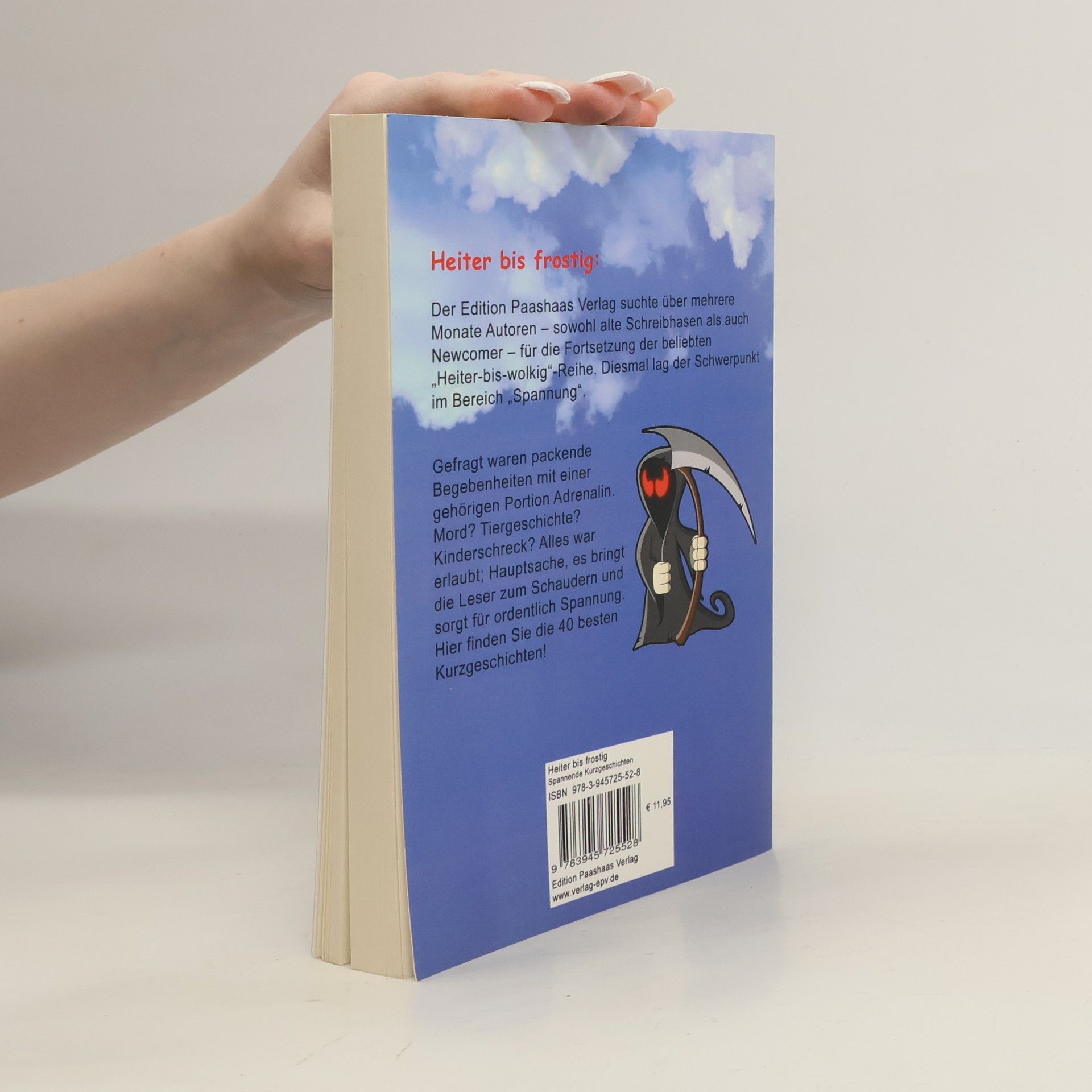 40 spannende Kurzgeschichten - 40 Autoren: Der Edition Paashaas Verlag suchte über mehrere Monate Autoren – sowohl alte Schreibhasen als auch Newcomer – für die Fortsetzung der beliebten „Heiter-bis-wolkig“-Reihe. Diesmal lag der Schwerpunkt im Bereich „Spannung“. Wir suchten packende Begebenheiten mit einer gehörigen Portion Adrenalin. Mord? Tiergeschichte? Kinderschreck? Alles war erlaubt; Hauptsache, es bringt die Leser zum Schaudern und sorgt für ordentlich Spannung. Hier finden Sie die 40 besten Kurzgeschichten! Die Autoren: Renate Behr; Anita Mosebach; Anja Kubica; Anna Neocleous; Astrid Schwikardi; Britta Voß; Cornelia Theda; Daniela Noitz; Raphael Blischke; Dörte Müller; Elke Siegrist; Frank Rathke; Frank Vollmann; Raymonde Graber; Felix Huber; Katrin Thiele; Volker Kosznitzki; Kristin Lange; Isabel Kritzer; Lisa Wiezorreck; Lukas Vering; Martina Eberle; Mike Gromberg; Nicole Prior; Olaf Lahayne; Paul Sanker; Peter J. Scholz; Marcus Watolla; Regina Berger; Sabine Kohlert; Sibyl Quinke; Tara Becker; Susanne Haug; Susanne Weinsanto; Thomas Volkermann; Ulli Engelbrecht; Lucy Fire; Veronika M. Dutz; Violetta Leiker; Manuela Klumpjan.