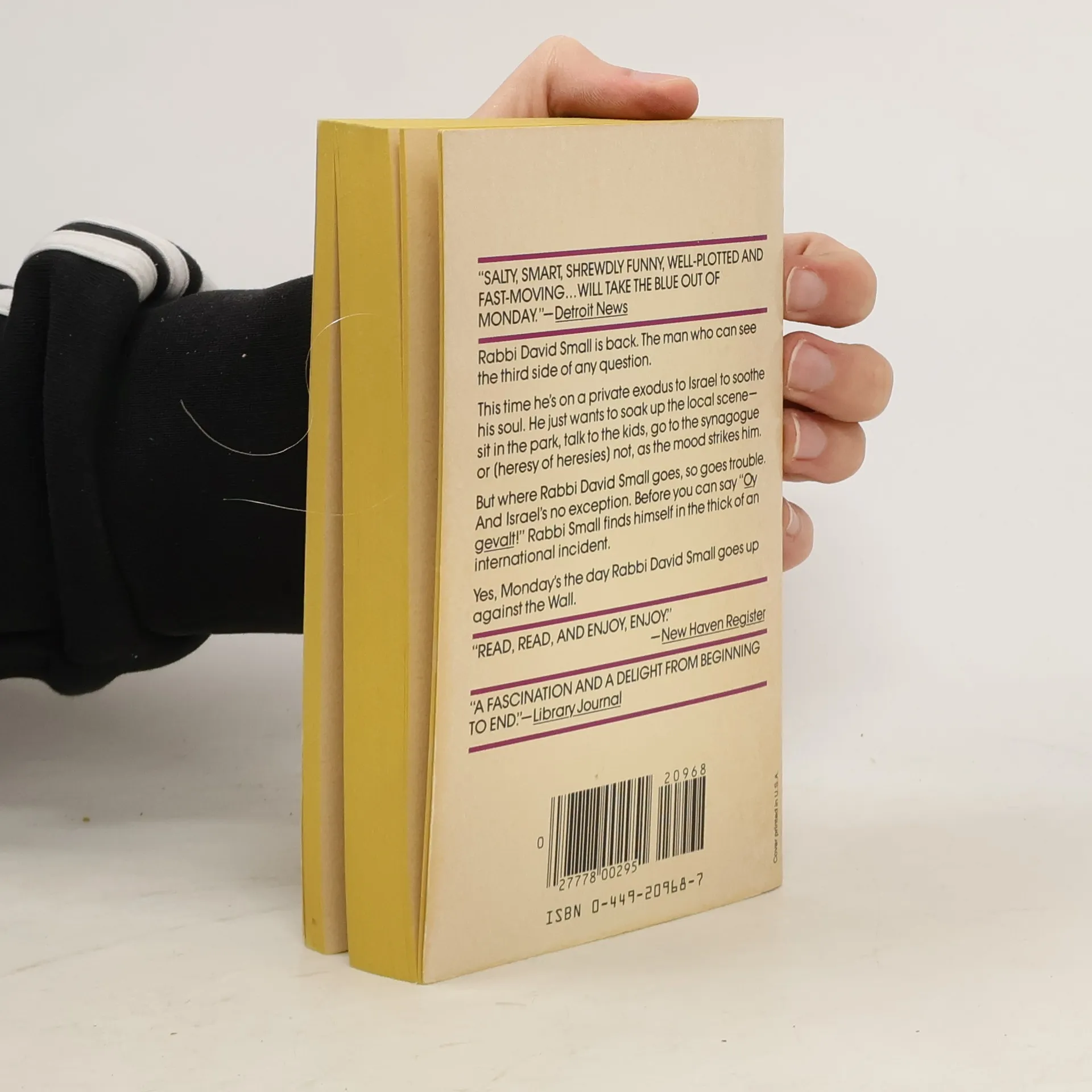 Rabbi David Small is back. The man who can see the third side of any question. This time he's on a private exodus to Israel to soothe his soul. He just wants to soak up the local scene--sit in the park, talk to the kids, go to the synagogue or (heresy of heresies) not, as the mood strikes him. But where Rabbi David Small goes, so goes trouble. And Israel's no exception. Before you can say " Oy gevalt! " Rabbi Small finds himself in the thick of an international incident. Yes, Monday's the day Rabbi David Small goes up against the Wall.