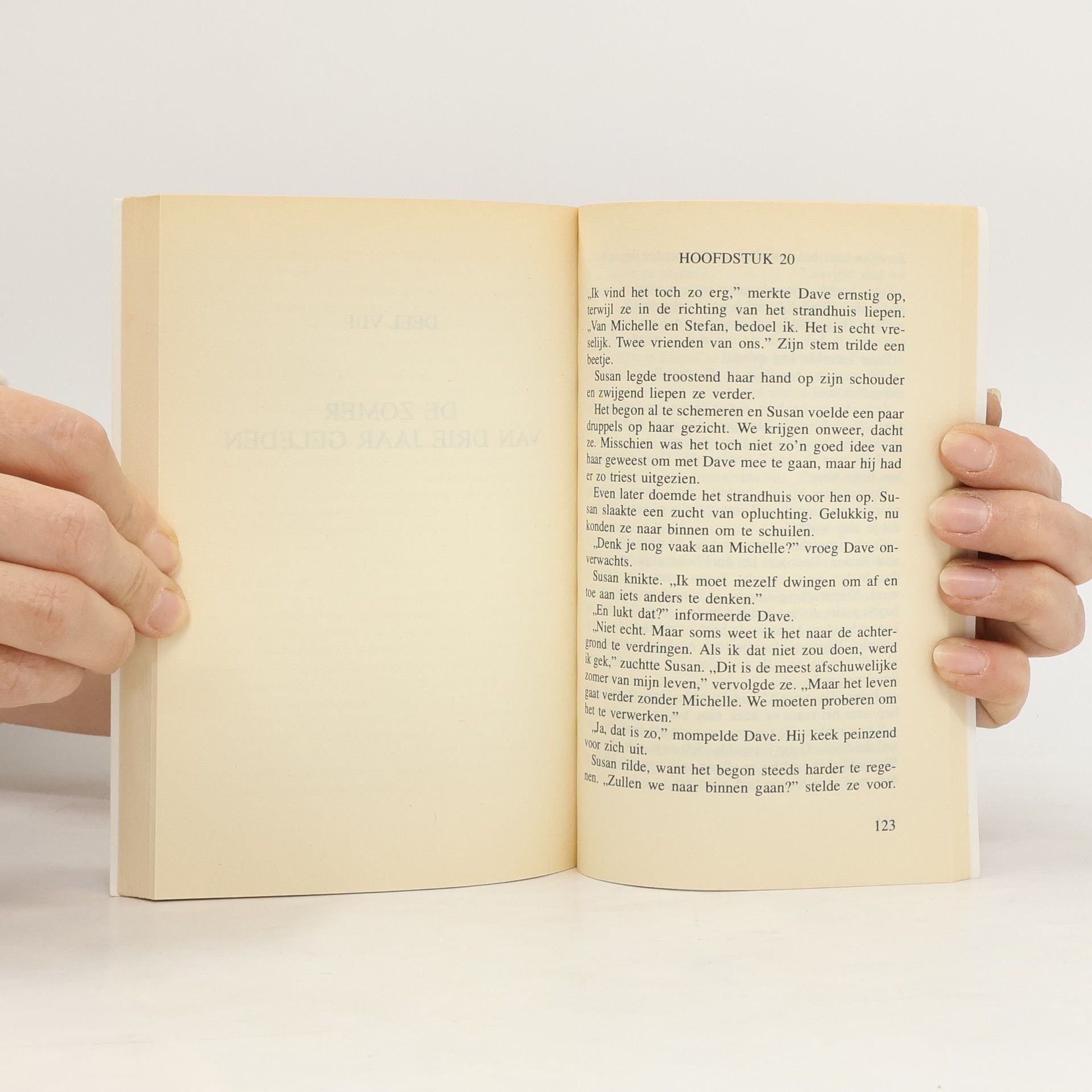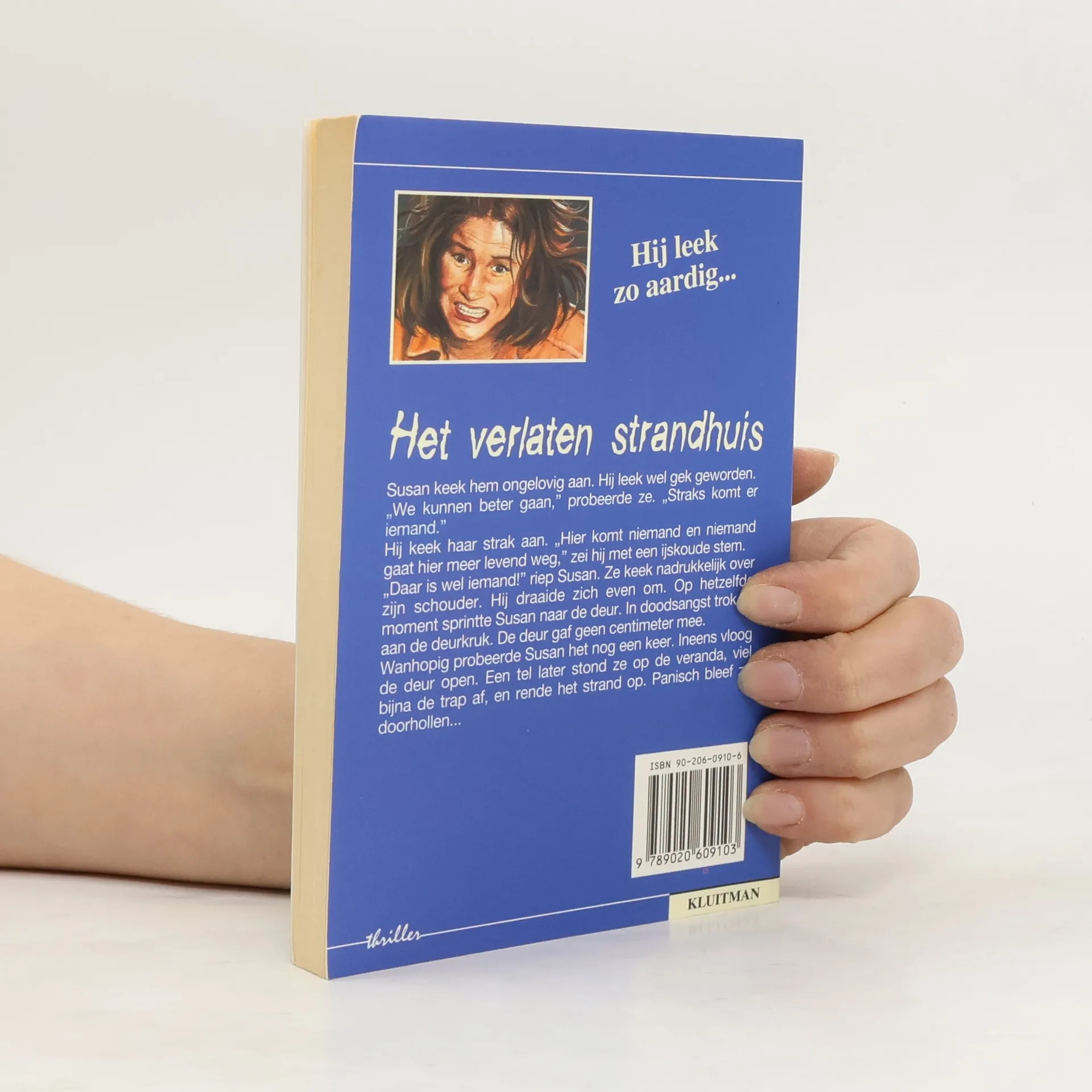 Susan keek hem ongelovig aan. Hij leek wel gek geworden. "We kunnen beter gaan," probeerde ze. "Straks komt er iemand." Hij keek haar strak aan. "Hier komt niemand en niemand gaat hier meer levend weg," zei hij met een ijskoude stem. "Daar is wel iemand!" riep Susan. Ze keek nadrukkelijk over zijn schouder. Hij draaide zich even om. Op hetzelfde moment sprintte Susan naar de deur. In doodsangst trok ze aan de deurkruk. De deur gaf geen centimeter mee. Wanhopig probeerde Susan het nog een keer. Ineens vloog de deur open. Een tel later stond ze op de veranda, viel bijna de trap af, en rende het strand op. Panisch bleef ze doorhollen...