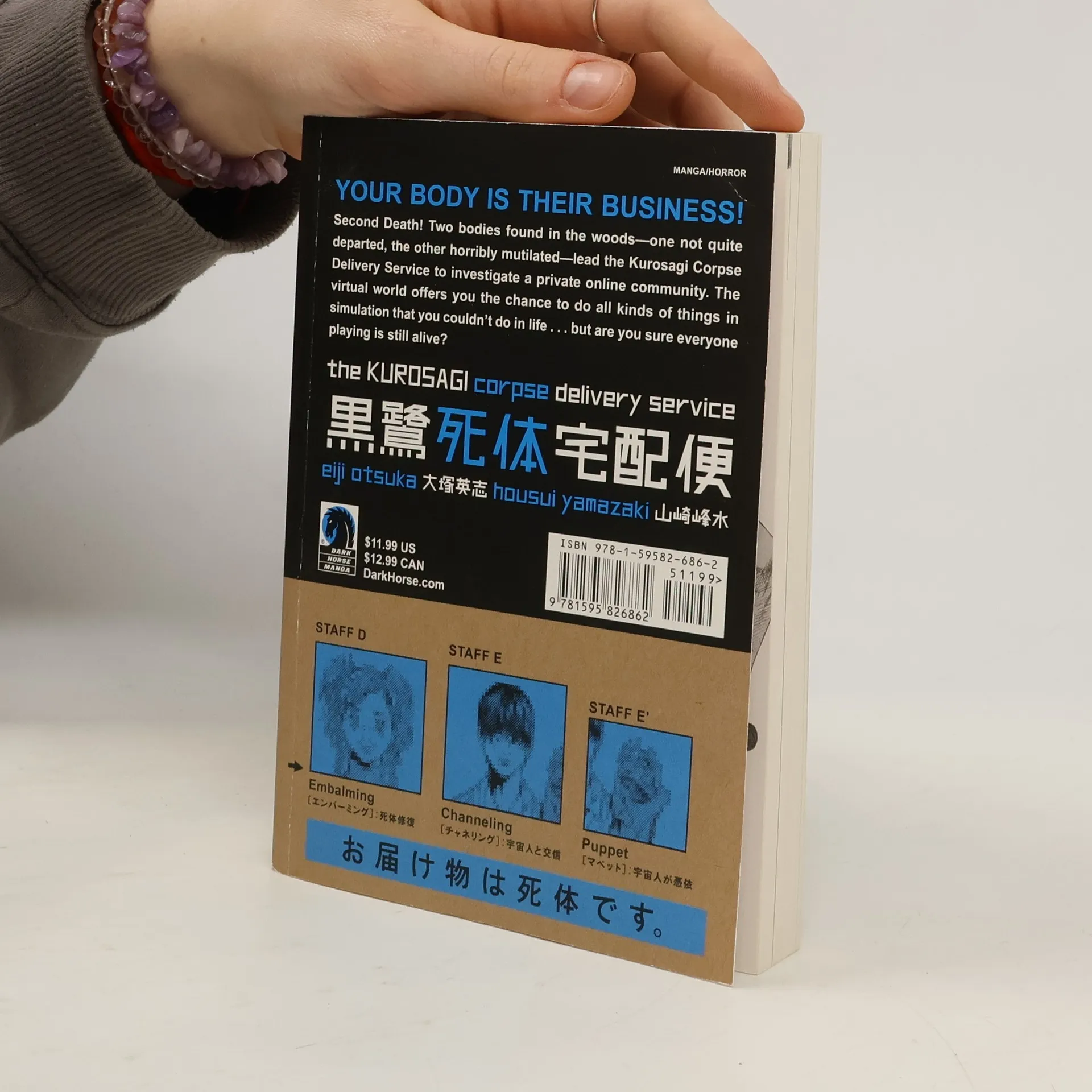 Your body is their business! Five strange, young students at a Buddhist university find little call for their job skills in today's Tokyo... among the living, that is! But all that stuff in college they were told would never pay off gives them a direct line to the dead... the dead who are still trapped in their corpses and can't move on to the next reincarnation. The five form the Kurosagi Corpse Delivery Service: whether suicide, murder, accident, or illness, they'll carry your body wherever it needs to go to free your soul!<p>In Volume 12: Second Death, two bodies found in the woods - one not-quite-departed, the other horribly mutilated - lead the Kurosagi Corpse Delivery Service to investigate a private online community. The virtual world offers you the chance to do all kinds of things in simulation that you couldn't do in life... but are you sure everyone playing is still alive?</p>