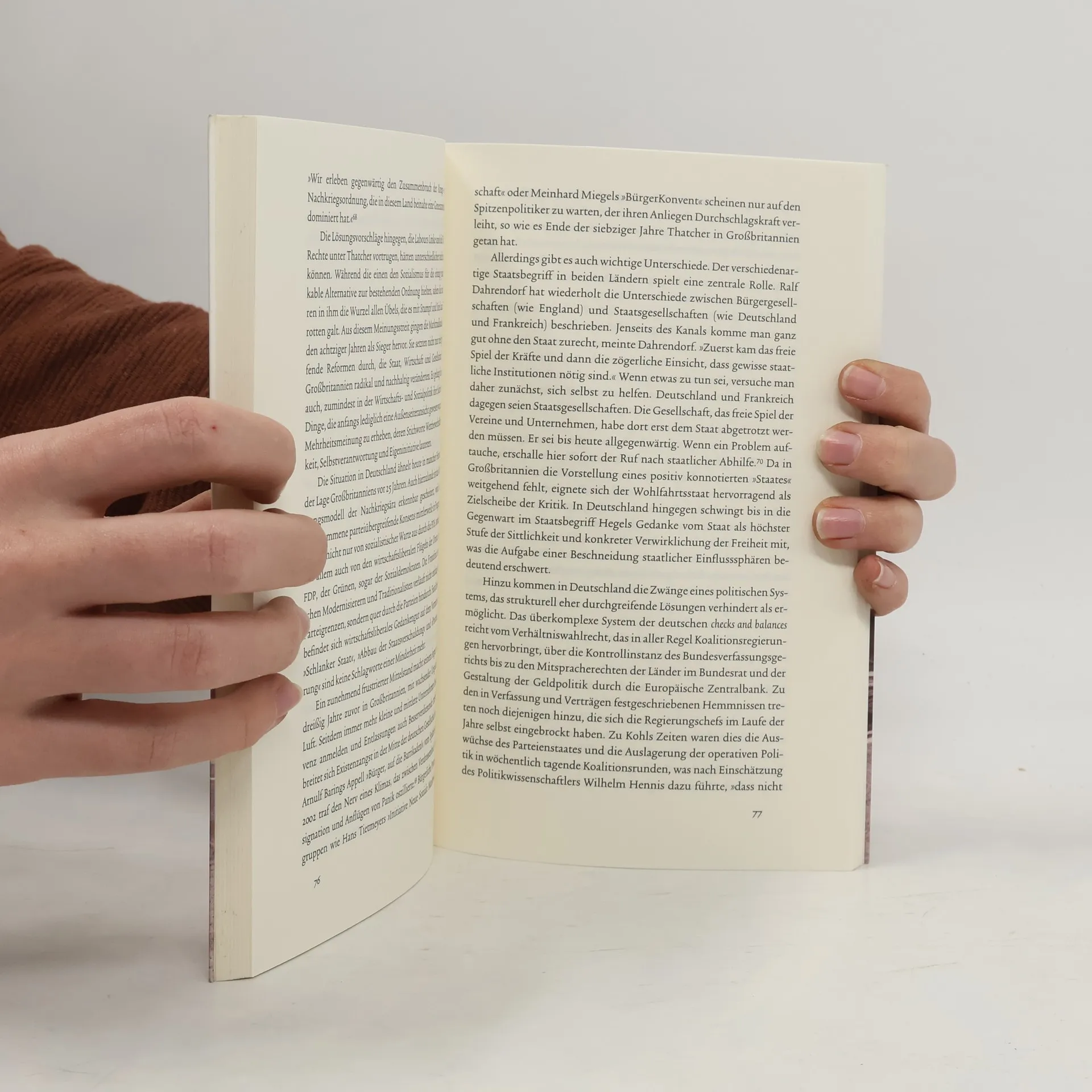 Fast niemand bleibt indifferent, wenn die Rede auf sie kommt. Ihre Anhänger verglichen Margaret Thatcher mit Elizabeth I., Winston Churchill oder Charles de Gaulle. Ihre Gegner bezeichneten sie als weiblichen Rambo oder 'Attila die Henne'. Die Briten zollen ihr in Meinungsumfragen Respekt oder bekunden Abscheu, aber nie Gleichgültigkeit. Helmut Schmidt nannte sie 'ein Rhinozeros', Helmut Kohl pflegte Thatchers England als abschreckendes Beispiel für einen entfesselten Kapitalismus anzuführen. Deutschlands Politiker wagten es lange nicht, den parteiübergreifenden Konsens, der sich in der Bundesrepublik seit 1949 herausgebildet hat, in Frage zu stellen. Seine Voraussetzung war die Gewissheit stetig zunehmender sozialer Sicherheit und immer weiter wachsenden Wohlstands, etwas, was heute fragwürdiger denn je ist. In Britannien schwanden schon in den siebziger Jahren die Grundlagen, auf denen die Gesellschaft der Nachkriegszeit ruhte. Überkommene wirtschaftspolitische Instrumente erwiesen sich als unbrauchbar, um den ökonomischen Niedergang des Landes zu bremsen. Thatcher hat radikale Konsequenzen daraus gezogen und sie so entschlossen wie niemand sonst in die Tat umgesetzt. Dominik Gepperts Essay kontrastiert die britische Krise der siebziger Jahre, ihre Überwindung in den achtziger und deren Folgen in den neunziger Jahren mit den gegenwärtigen Entwicklungen in unserem Land. Was kann man vom britischen Weg lernen?