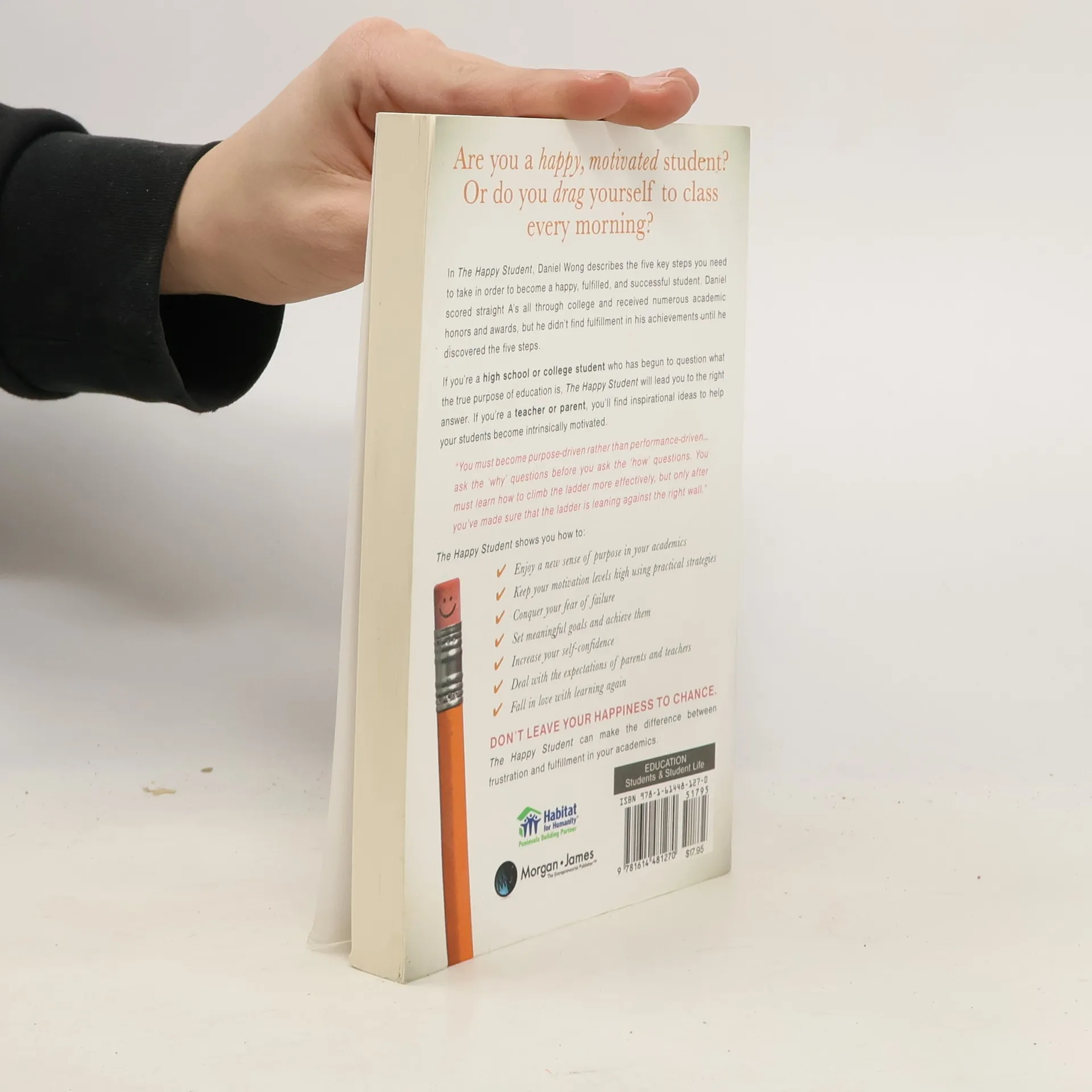 Are you a happy, motivated student? Or do you drag yourself to class every morning? In The Happy Student, Daniel Wong describes the five key steps you need to take in order to become both a successful and happy student. Wong scored straight A’s all through college and received numerous academic honors and awards, but he didn’t find fulfillment in his achievements until he discovered the five steps. Wong draws on his personal journey—from unhappy overachiever to happy straight-A student—to guide you through your own transformational process. If you’re a high school or college student who has begun to question what the true purpose of education is, The Happy Student will lead you to the right answer. If you’re a teacher or parent, The Happy Student will explain how you can help your students become intrinsically motivated. “You must become purpose-driven rather than performance-driven,” says Wong. “You must ask the ‘why’ questions before you ask the ‘how’ questions. You must learn how to climb the ladder more effectively, but only after you’ve made sure that the ladder is leaning against the right wall.” In The Happy Student, Wong shows you how to: Enjoy a new sense of purpose in your academics Keep your motivation levels high every day using practical strategies Conquer your fear of failure Set meaningful goals and achieve them Increase your self-confidence Deal with the expectations of parents and teachers Fall in love with learning again Don’t leave your happiness to chance. The Happy Student can make the difference between frustration and fulfillment in your academics.