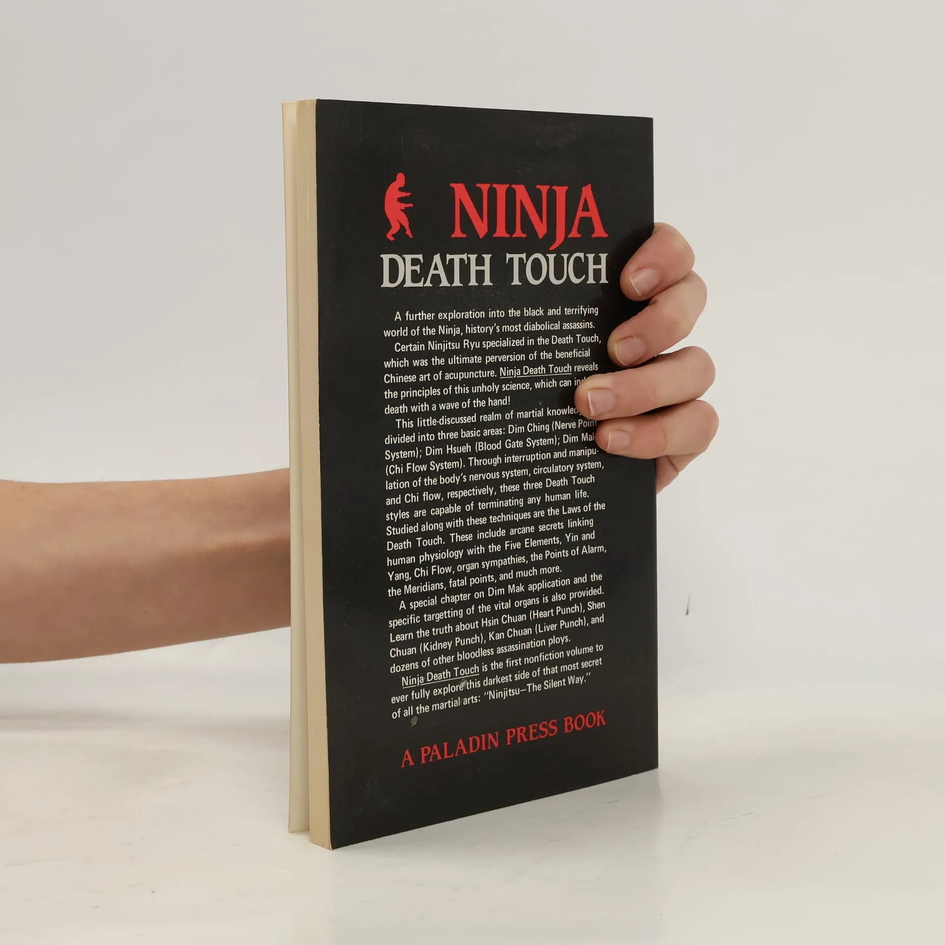 THIS BOOK COULD SAVE YOUR LIFE!!! Back in Print!! Ninja Dim Mak, the Chinese Death Touch. This Unholy Science is based on the same principles as the therapeutic methods of Acupuncture. EXCEPT- they are used to inflict pain or injury or death, depending on the "power" of the strike and the skill of the Assassin Overcome any attacker with fingertip pressure. Includes, Charts and Diagrams of the Vital and Fatal Points of the Human Body; times when they are most vulnerable (Law of Midday-Midnight); fistic "Hand Weapons" common to all martial arts; history and origin; even a Ninja legend. A valuable anatomical study, a self defense must! Learning just one of these fists could save your life!!!
