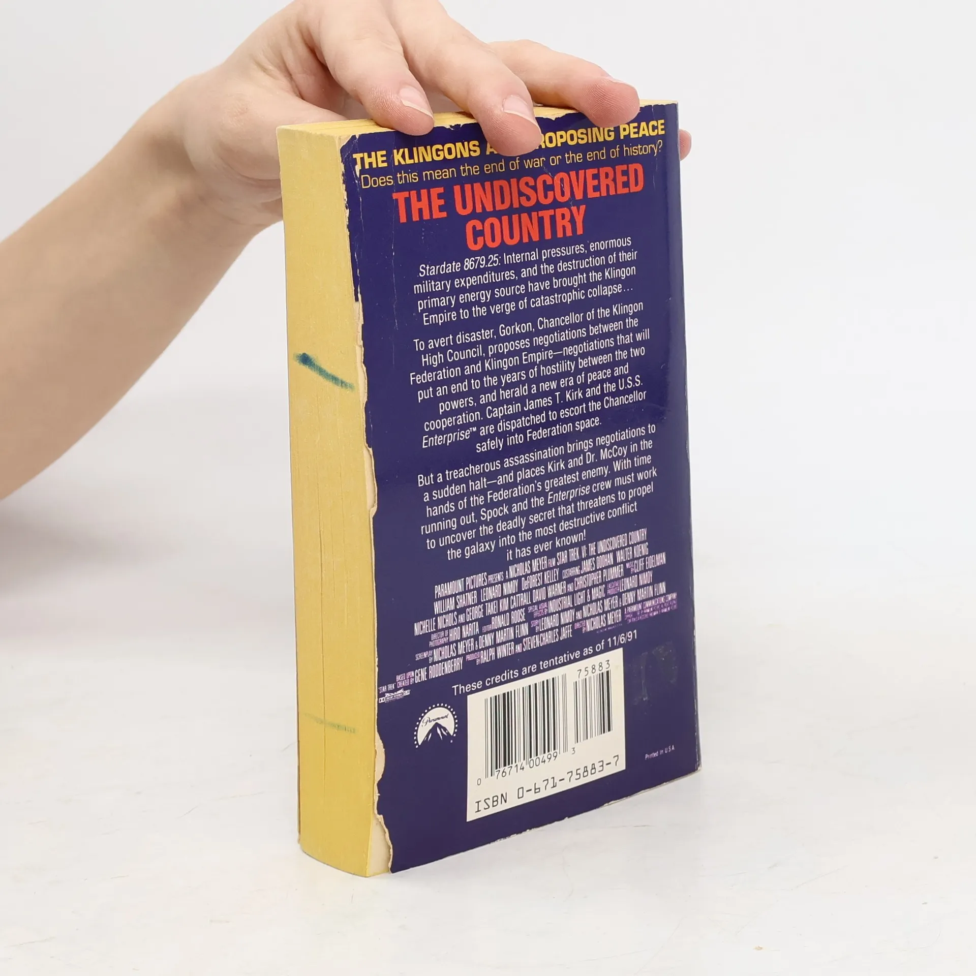 Internal pressures, enormous military expenditures, and the destruction of their primary energy source have brought the Klingon Empire to the verge of catastrophic collapse. To avert disaster, Gorkon, Chancellor of the Klingon High Council, proposes negotiations between the Federation and Klingon Empire, negotiations that will put an end to the years of hostility between the two powers, and herald a new era of peace and cooperation. Captain James T. Kirk and the U.S.S. EnterpriseTM are dispatched to escort the Chancellor safely into Federation space. But a treacherous assassination brings negotiations to a sudden halt and places Kirk and Dr. McCoy in the hands of the Federation's greatest enemy. With time running out, Spock and the Enterprise crew work to uncover the deadly secret that threatens to propel the galaxy into the most destructive conflict it has ever known.