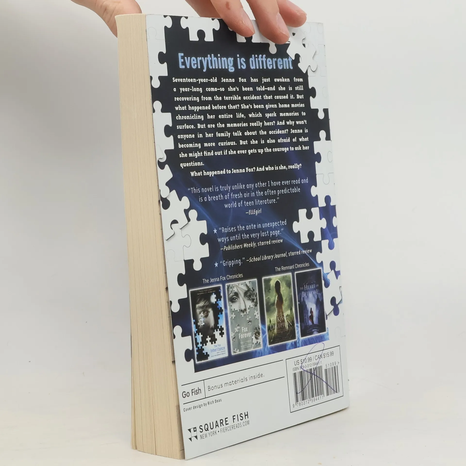 Everything is different Seventeen-year-old Jenna Fox has just awoken from a year-long coma - so she's been told - and she is still recovering from the terrible accident that caused it. But what happened before that? She's been given home movies chronicling her entire life, which spark memories to surface. But are the memories really hers? And why won't anyone in her family talk about the accident? Jenna is becoming more curious. But she is also afraid of what she might find out if she ever gets up the courage to ask her questions. What happened to Jenna Fox? And who is she really?