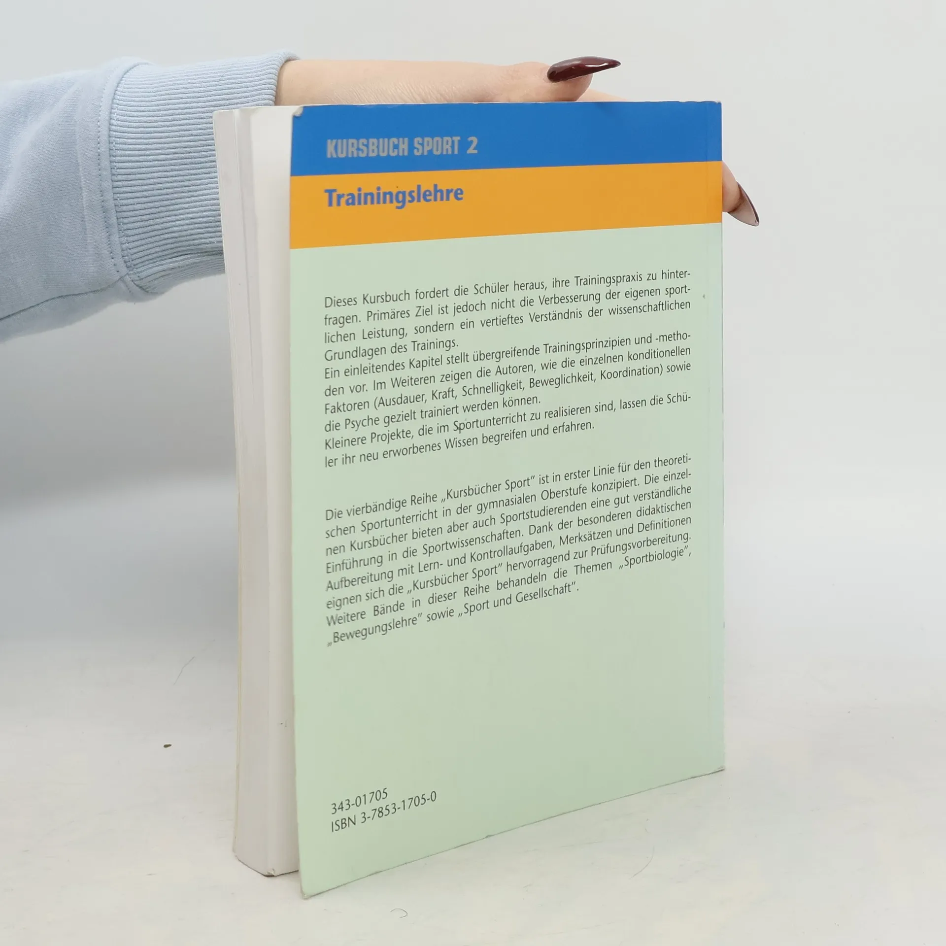Dieses Kursbuch fordert die Schüler heraus, ihre Trainingspraxis zu hinterfragen. Primäres Ziel ist jedoch nicht die Verbesserung der eigenen sportlichen Leistung, sondern ein vertieftes Verständnis der wissenschaftlichen Grundlagen des Trainings. Ein einleitendes Kapitel stellt übergreifende Trainingsprinzipien und -methoden vor. Im Weiteren zeigen die Autoren, wie die einzelnen konditionellen Faktoren (Ausdauer, Kraft, Schnelligkeit, Beweglichkeit, Koordination) sowie die Psyche gezielt trainiert werden können. Kleinere Projekte, die im Sportunterricht zu realisieren sind, lassen die Schüler ihr neu erworbenes Wissen begreifen und erfahren.