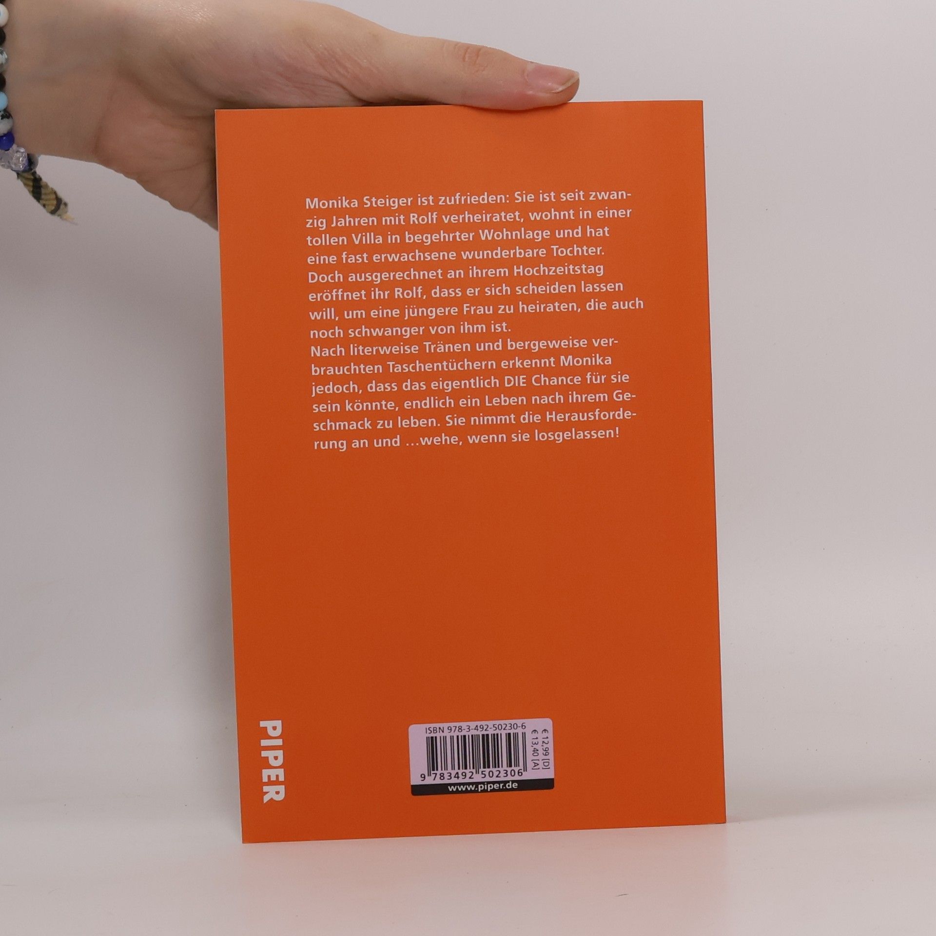 Monika Steiger ist zufrieden: Sie ist seit zwanzig Jahren mit Rolf verheiratet, wohnt in einer tollen Villa in begehrter Wohnlage und hat eine fast erwachsene wunderbare Tochter. Doch ausgerechnet an ihrem Hochzeitstag eröffnet ihr Rolf, dass er sich scheiden lassen will, um eine jüngere Frau zu heiraten, die auch noch schwanger von ihm ist. Nach literweise Tränen und bergeweise verbrauchten Taschentüchern erkennt Monika jedoch, dass das eigentlich DIE Chance für sie sein könnte, endlich ein Leben nach ihrem Geschmack zu leben. Sie nimmt die Herausforderung an und ...wehe, wenn sie losgelassen!