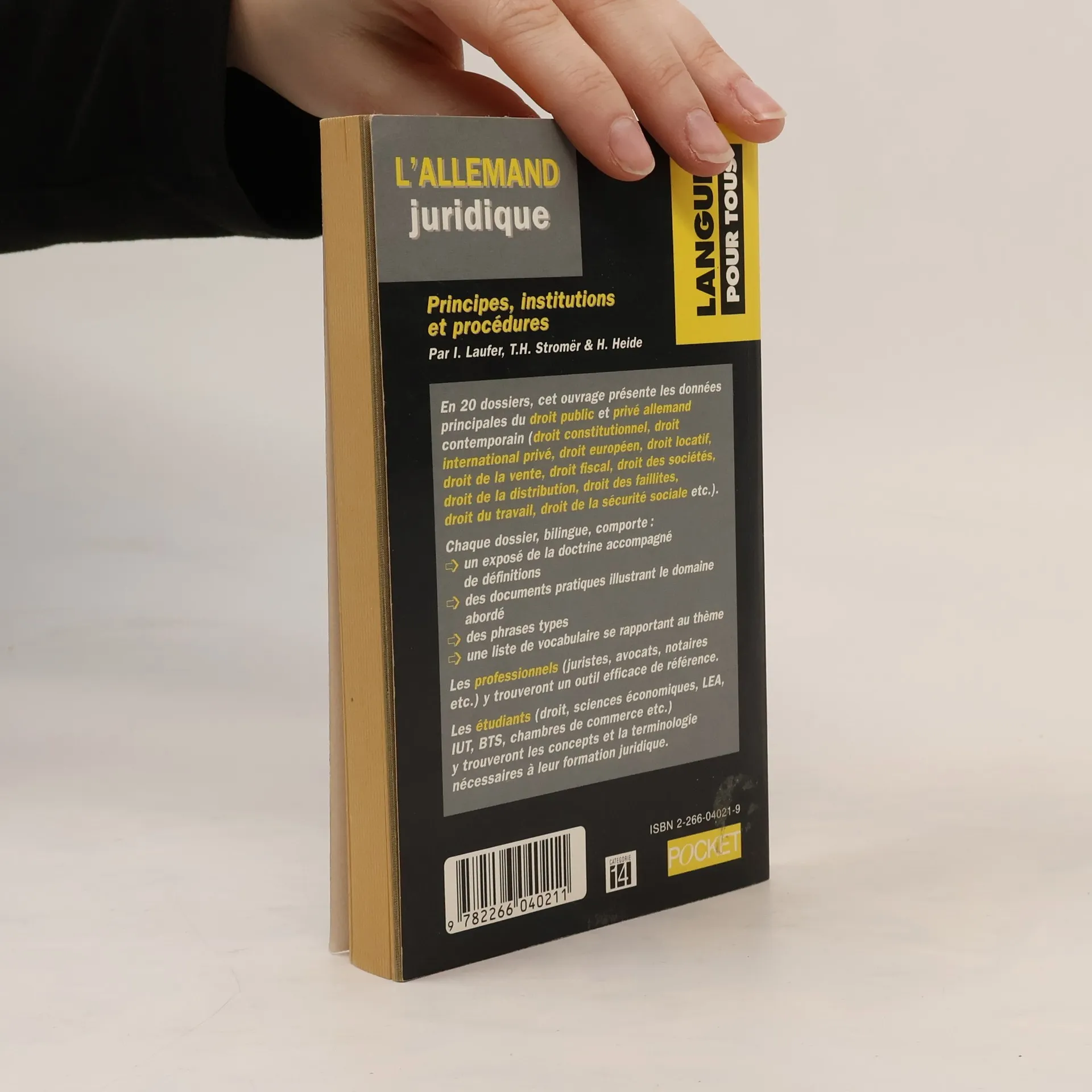 Principes, institutions et procéduresEn 20 dossiers, cet ouvrage présente les données principales du droit public et privé allemand contemporain (droit constitutionnel, droit international privé, droit européen, droit locatif, droit de la vente, droit fiscal, droit des sociétés, droit de la distribution, droit des faillites, droit du travail, droit de la sécurité sociale etc.).Chaque dossier, bilingue, comporte :=> un exposé de la doctrine accompagné de définitions=> des documents pratiques illustrant le domaine abordé=> des phrases types=> une liste de vocabulaire se rapportant au thèmeLes professionnels (juriste, avocats, notaires, etc.) y trouveront un outil efficace de référence.Les étudiants (droit, sciences économiques, LEA, IUT, BTS, chambres de commerce etc.) y trouveront les concepts et la terminologie nécessaires à leur formation juridique.