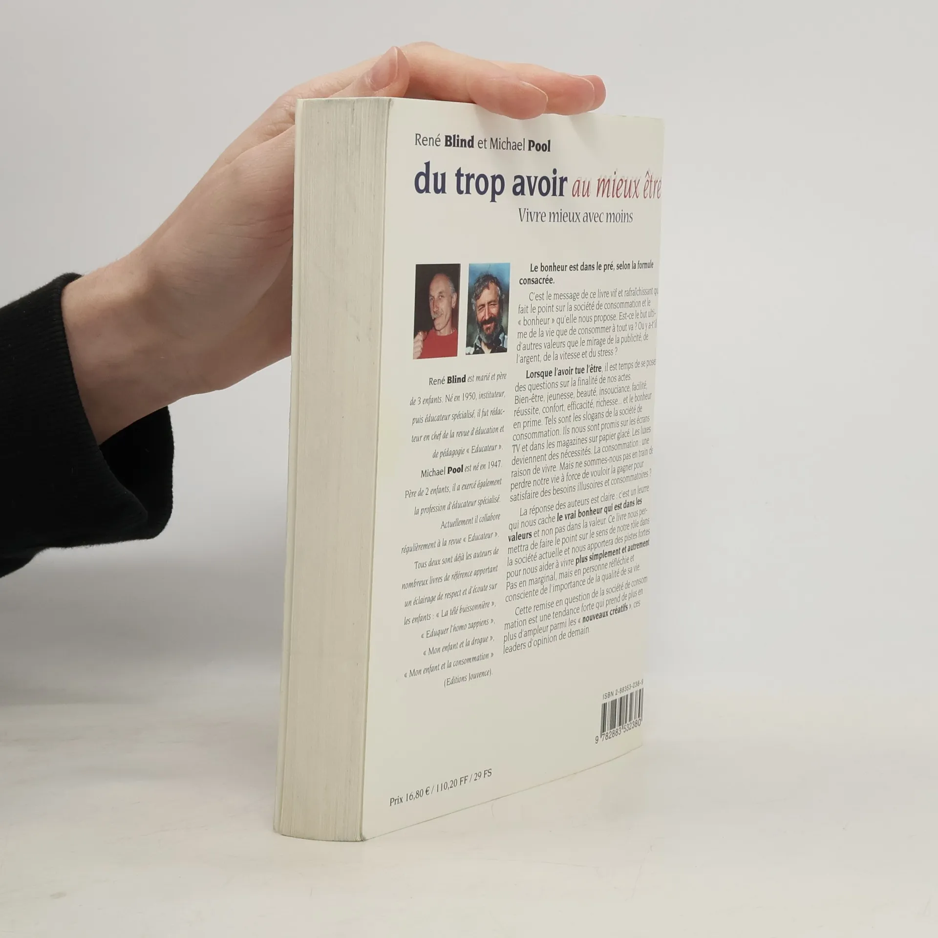Le bonheur est dans le pré, selon la formule consacrée. C'est le message de ce livre vif et rafraîchissant qui fait le point sur la société de consommation et le " bonheur " qu'elle nous propose. Est-ce le but ultime de la vie que de consommer à tout va ? Ou y a-t-il d'autres valeurs que le mirage de la publicité, de l'argent, de la vitesse et du stress ? Lorsque l'avoir tue l'être, il est temps de se poser des questions sur la finalité de nos actes. Bien-être, jeunesse, beauté, insouciance, facilité, réussite, confort, efficacité, richesse... et le bonheur en prime. Tels sont les slogans de la société de consommation. Ils nous sont promis sur les écrans TV et dans les magazines sur papier glacé. Les luxes deviennent des nécessités. La consommation : une raison de vivre. Mais ne sommes-nous pas en train de perdre notre vie à force de vouloir la gagner pour satisfaire des besoins illusoires et consommatoires ? La réponse des auteurs est claire : c'est un leurre qui nous cache le vrai bonheur qui est dans les valeurs et non pas dans la valeur. Ce livre nous permettra de faire le point sur le sens de notre rôle dans la société actuelle et nous apportera des pistes fortes pour nous aider à vivre plus simplement et autrement. Pas en marginal, mais en personne réfléchie et consciente de l'importance de la qualité de sa vie. Cette remise en question de la société de consommation est une tendance forte qui prend de plus en plus d'ampleur parmi les " nouveaux créatifs ", ces leaders d'opinion de demain.