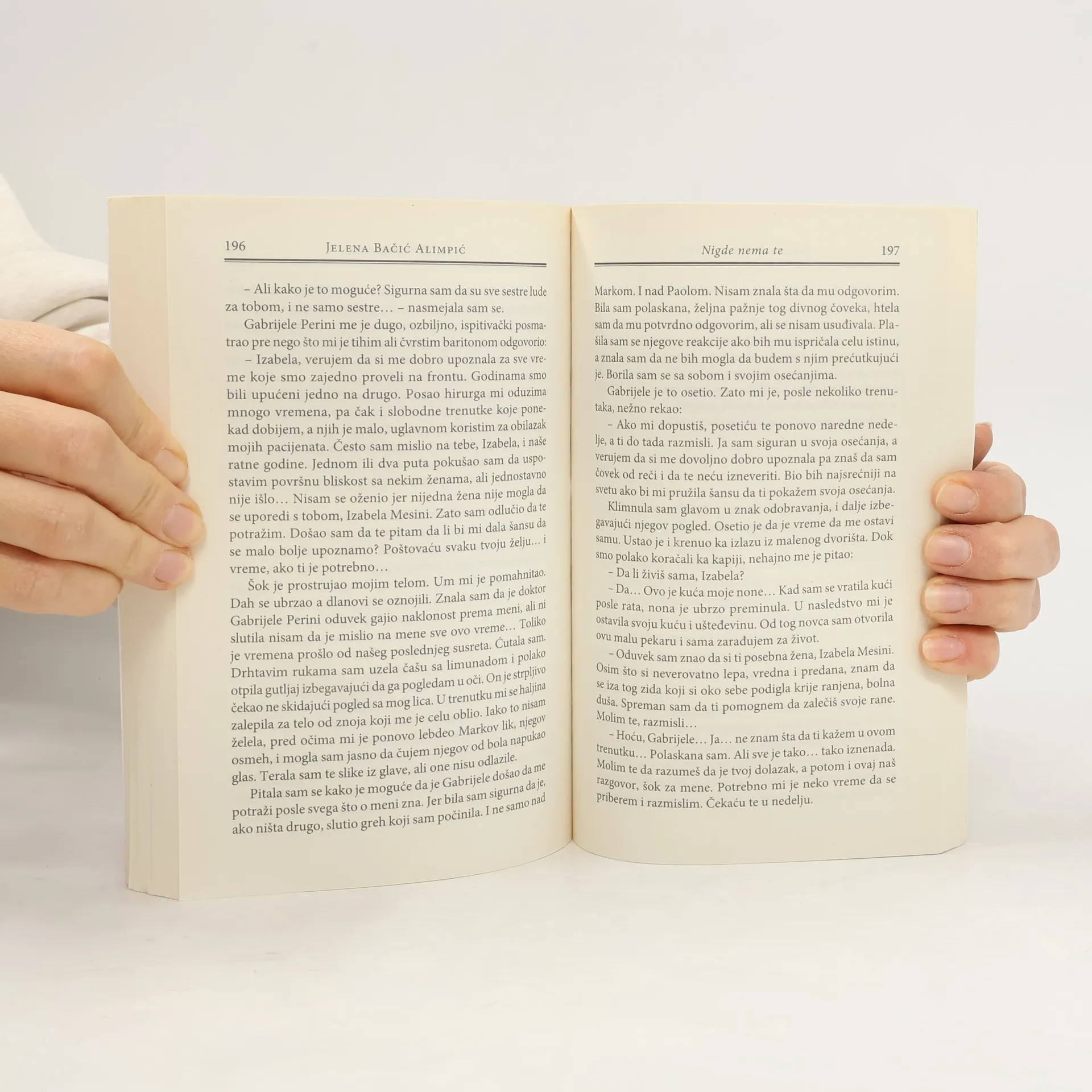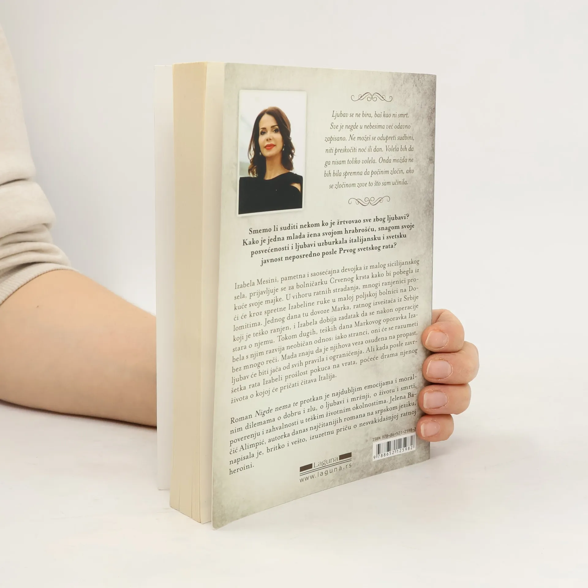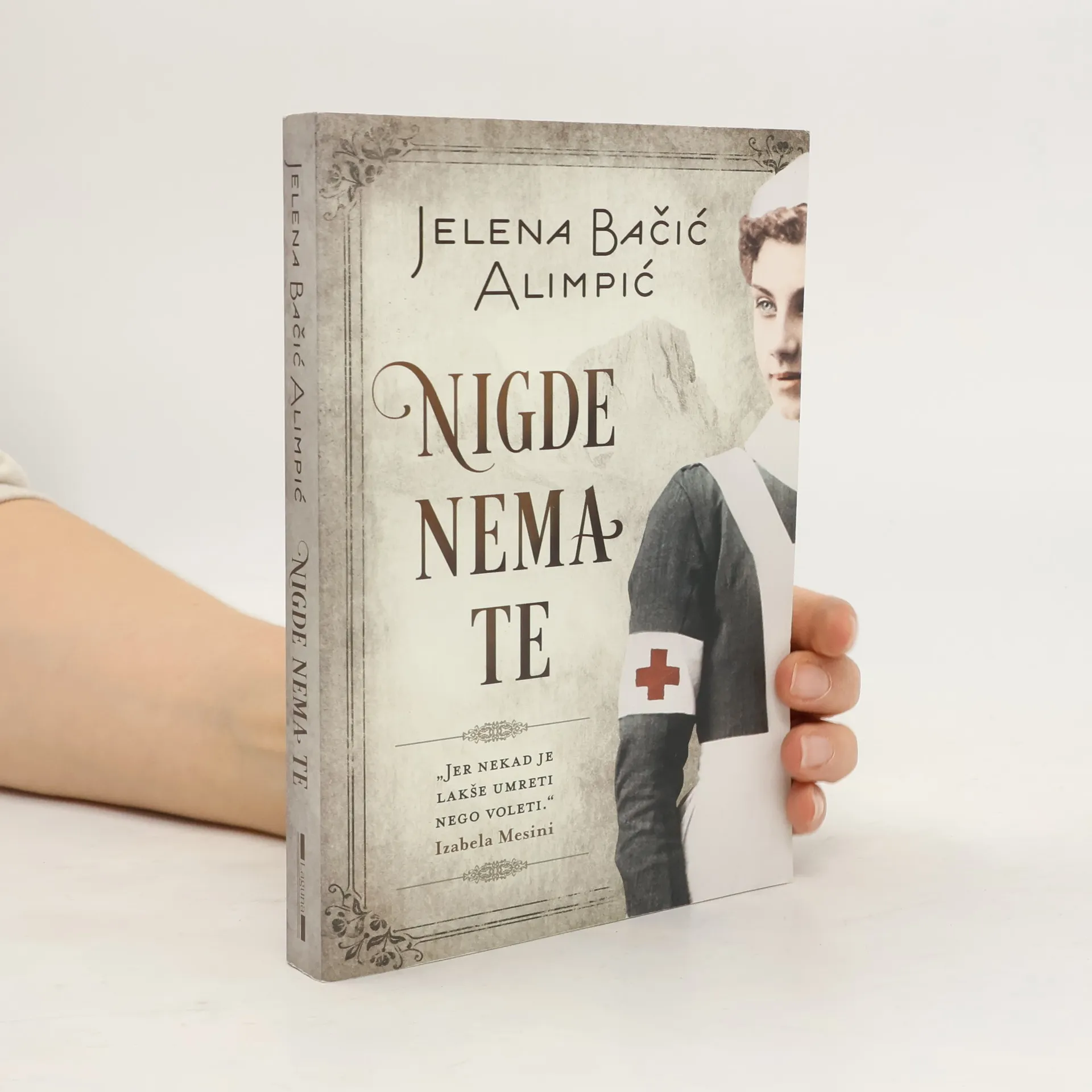 „Jer nekad je lakše umreti nego voleti.“ Izabela Mesini Ljubav se ne bira, baš kao ni smrt. Sve je negde u nebesima već odavno zapisano. Ne možeš se odupreti sudbini, niti preskočiti noć ili dan. Volela bih da ga nisam toliko volela. Onda možda ne bih bila spremna da počinim zločin, ako se zločinom zove to što sam učinila. Smemo li suditi nekom ko je žrtvovao sve zbog ljubavi? Kako je jedna mlada žena svojom hrabrošću, snagom svoje posvećenosti i ljubavi uzburkala italijansku i svetsku javnost neposredno posle Prvog svetskog rata? Izabela Mesini, pametna i saosećajna devojka iz malog sicilijanskog sela, prijavljuje se za bolničarku Crvenog krsta kako bi pobegla iz kuće svoje majke. U vihoru ratnih stradanja, mnogi ranjenici proći će kroz spretne Izabeline ruke u maloj poljskoj bolnici na Dolomitima. Jednog dana tu dovoze Marka, ratnog izveštača iz Srbije koji je teško ranjen, i Izabela dobija zadatak da se nakon operacije stara o njemu. Tokom dugih, teških dana Markovog oporavka Izabela sa njim razvija neobičan iako stranci, oni će se razumeti bez mnogo reči. Mada znaju da njihova veza osuđena na propast, ljubav će biti jača od svih pravila i ograničenja. Ali, kada posle završetka rata Izabeli prošlost pokuca na vrata, počeće drama njenog života o kojoj će pričati čitava Italija. Roman Nigde nema te protkan je najdubljim emocijama i moralnim dilemama o dobru i zlu, o ljubavi i mržnji, o životu i smrti, poverenju i zahvalnosti u teškim životnim okolnostima. Jelena Bačić Alimpić, autorka danas najčitanijih romana na srpskom jeziku, napisala je britko i vešto, izuzetnu priču o nesvakidašnjoj ratnoj heroini.