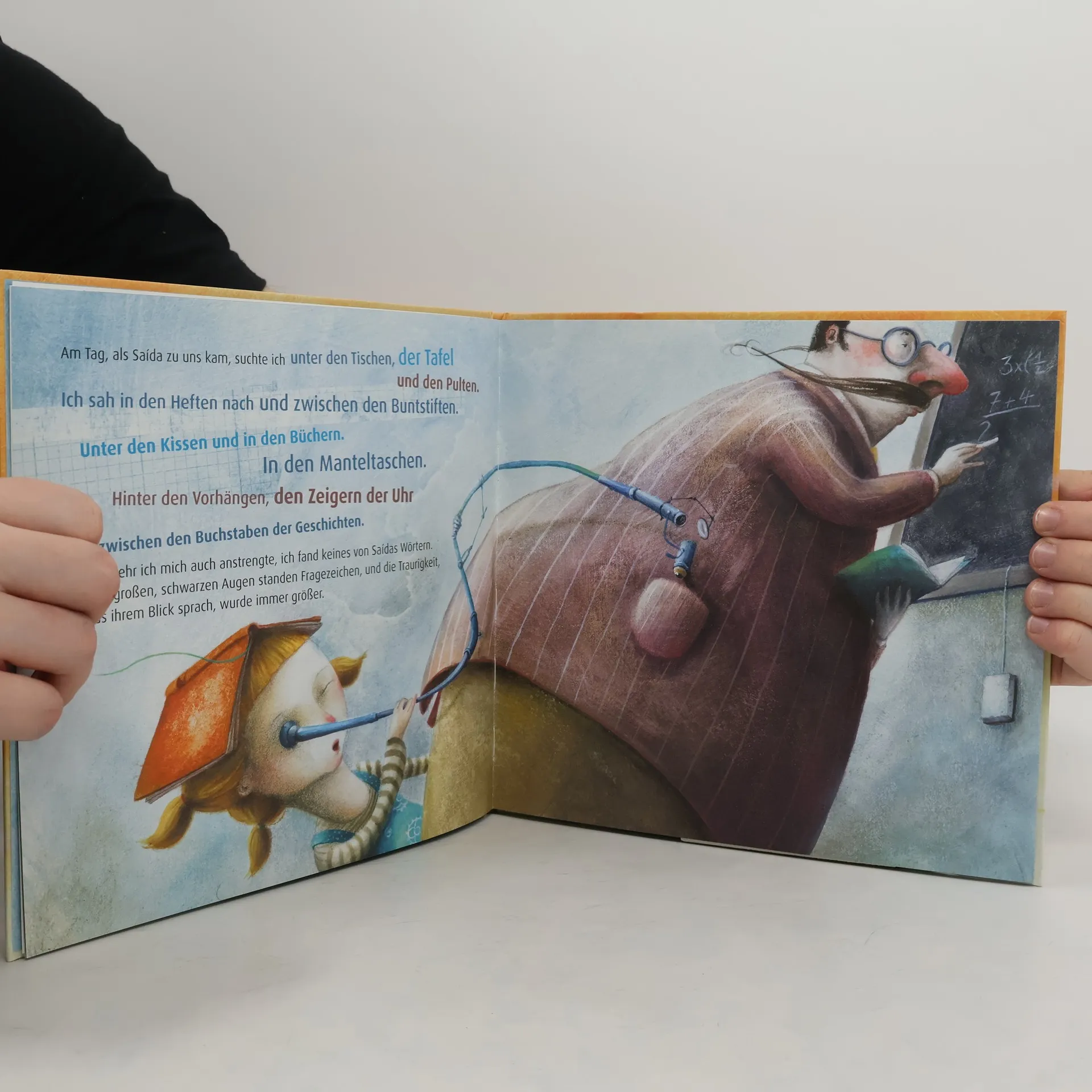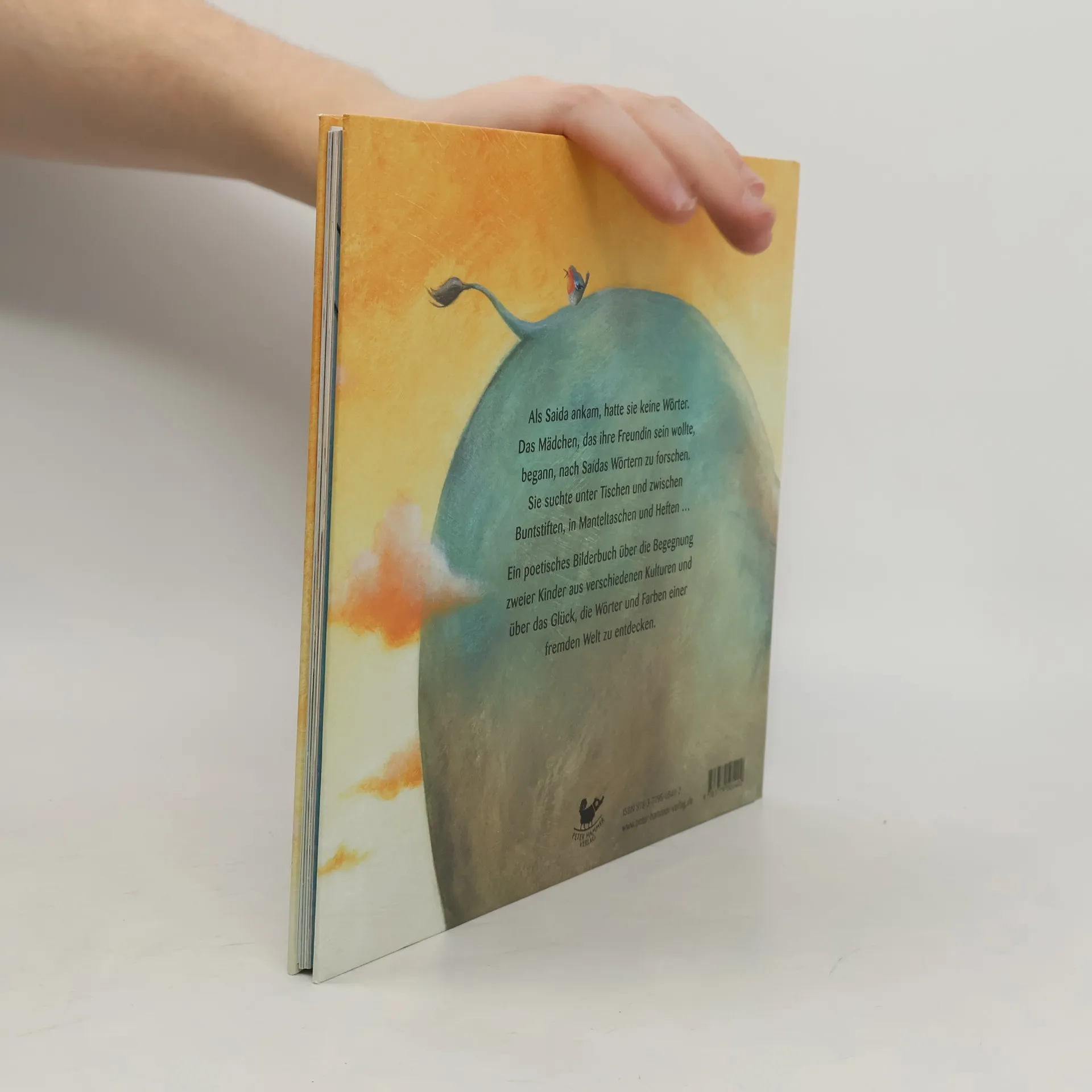 Es ist Winter, als Saída ankommt. Sie kommt mit ihrem Koffer und ohne ein Wort. Das Mädchen, das ihre Freundin werden will, beginnt zu suchen. Überall forscht sie nach Saídas Wörtern, sie sucht unter Tischen und zwischen Buntstiften, in Manteltaschen und Heften. Erst als sie versteht, dass Saída ihre Sprache nicht verloren hat, sondern mit ihren Wörtern in diesem frenden Land nichts anfangen kann, beginnen die Mädchen mit dem Tauschen: fremde Wörter gegen eigene, neue Laute gegen vertraute, Schriftzeichen, die wie Blumen aussehen, gegen Buchstaben aus Balken und Kreisen. Über diesem Hin und Her vergeht der Winter und als die Mandelbäume blühen, sind sie Freundinnen, jede reicher durch die Welt der anderen. Dieses Bilderbuch erzählt poetisch und mit Bildern wie aus einer Traumwelt von der Begegnung zweier Kinder aus verschiedenen Kulturen, die forschend und spielend Fremdes zu Eigenem machen.