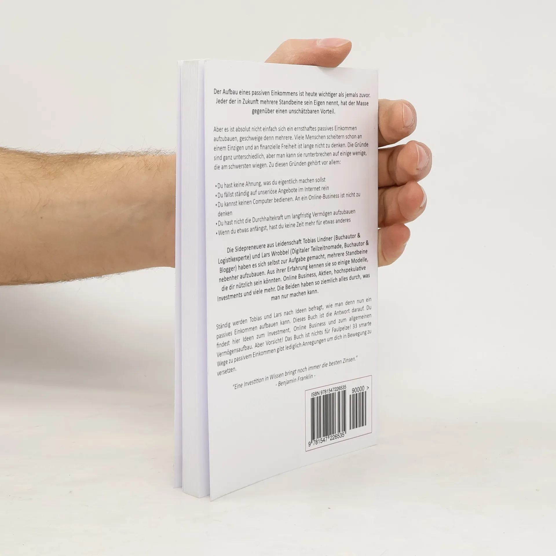 Aber es ist absolut nicht einfach sich ein ernsthaftes passives Einkommen aufzubauen, geschweige denn mehrere. Viele Menschen scheitern schon an einem Einzigen und an finanzielle Freiheit ist lange nicht zu denken. Die Gründe sind ganz unterschiedlich, aber man kann sie runterbrechen auf einige wenige, die am schwersten wiegen. Zu diesen Gründen gehört vor Aber es hat auch niemand gesagt, dass es einfach ist, denn einfach kann ja jeder!Die Sidepreneuere aus Leidenschaft Tobias Lindner (Buchautor & Logistikexperte) und Lars Wrobbel (Digitaler Teilzeitnomade, Buchautor & Blogger) haben es sich selbst zur Aufgabe gemacht, mehrere Standbeine nebenher aufzubauen. Aus ihrer Erfahrung kennen sie so einige Modelle, die dir nützlich sein könnten. Online Business, Aktien, hochspekulative Investments und viele mehr. Die Beiden haben so ziemlich alles durch, was man nur machen kann.In diesem Buch geben Sie 33 Tipps wie du dir mehr Vermögen aufbauen kannst und deine Finanzen in den Griff bekommst oder vielleicht sogar irgendwann die finanzielle Freiheit erreichst. Geld verdienen und passives Einkommen aufzubauen ist einfacher, als man denkt. Jedoch ist es absolut unabdingbar, dass du genau weißt, welche Möglichkeiten es gibt und du einen Plan hast, wie du es langfristig stabilisieren kannst.Schluss also mit dem Rumgejammere. Hol dir Inspiration, entscheide dich für eine Richtung und leg los!Ständig werden Tobias und Lars nach Ideen befragt, wie man denn nun ein passives Einkommen aufbauen kann. Dieses Buch ist die Antwort darauf. Du findest hier Ideen zum Investment, Online Business und zum allgemeinen Vermögensaufbau. Aber Vorsicht! Das Buch ist nichts für Faulpelze! 33 smart Wege zu passivem Einkommen gibt lediglich Anregungen um dich in Bewegung zu versetzen.