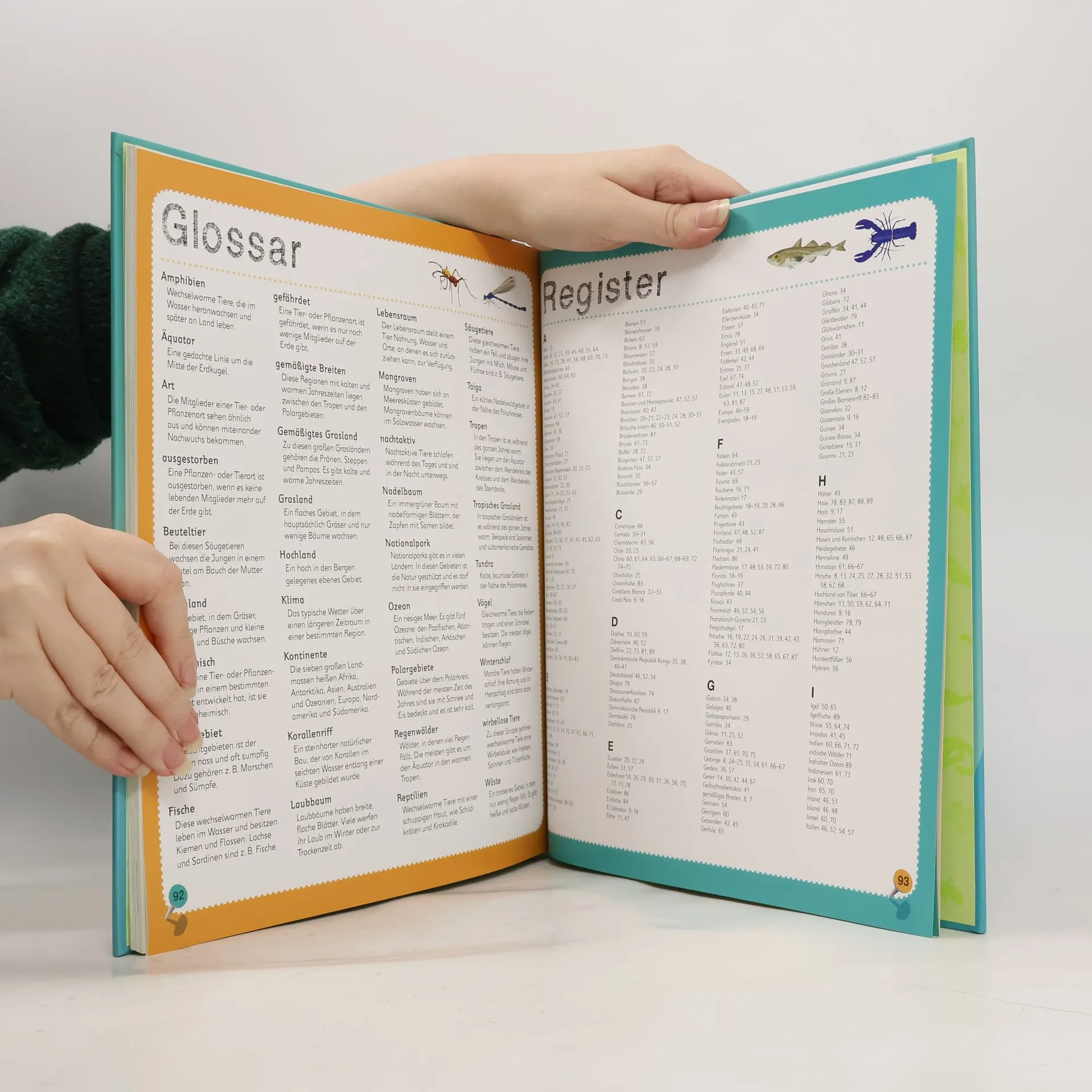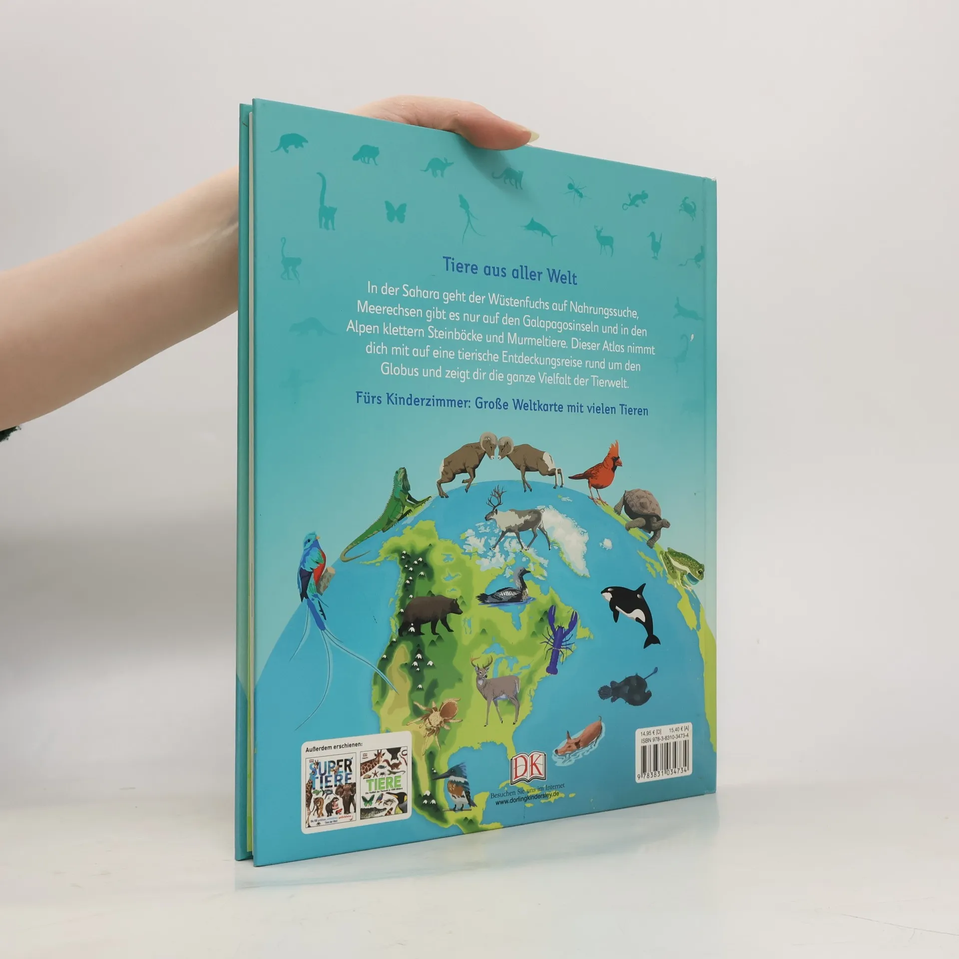 Tierisch gut! In diesem bunten Kinderatlas geht's in über 40 riesigen, eindrucksvoll illustrierten Karten einmal rund um den Globus. Hier lernen Kinder interessante Details über Braunbären oder Flughörnchen kennen, bekommen dadurch gleichzeitig eine Vorstellung von Geografie und erlernen ganz nebenbei auch noch den Umgang mit Atlanten. Natürlich ist der Nachwuchs auf neu erworbenes Wissen sehr stolz und möchte es gleich auf die Probe stellen. Deshalb wartet der Tieratlas für Kinder zusätzlich mit grandiosen Specials auf: Bei coolen Extras, wie Quiz oder Suchspiel auf einem großen Weltkarten- Poster haben die kleinen Leser gigantischen Spaß. Auf den Bahamas sind schwimmende Schweine und im Amazonasfluss pinke Delfine zu Hause. Klingt zu unglaublich, um wahr zu sein? Wollen wir doch mal sehen ...: Der Kinderatlas zeigt auf großformatigen Karten, welche Tiere wo leben. Von der Antarktis bis zum Great Barrier Reef werden alle Lebensräume der animalischen Bewohner ausgekundschaftet, dazu erklären kindgerechte Texte Spannendes über Ochsenfrösche aus der Kalahari-Wüste oder Meerechsen auf den Galápagos-Inseln. Wer kommt mit auf eine tierische Entdeckungsreise?