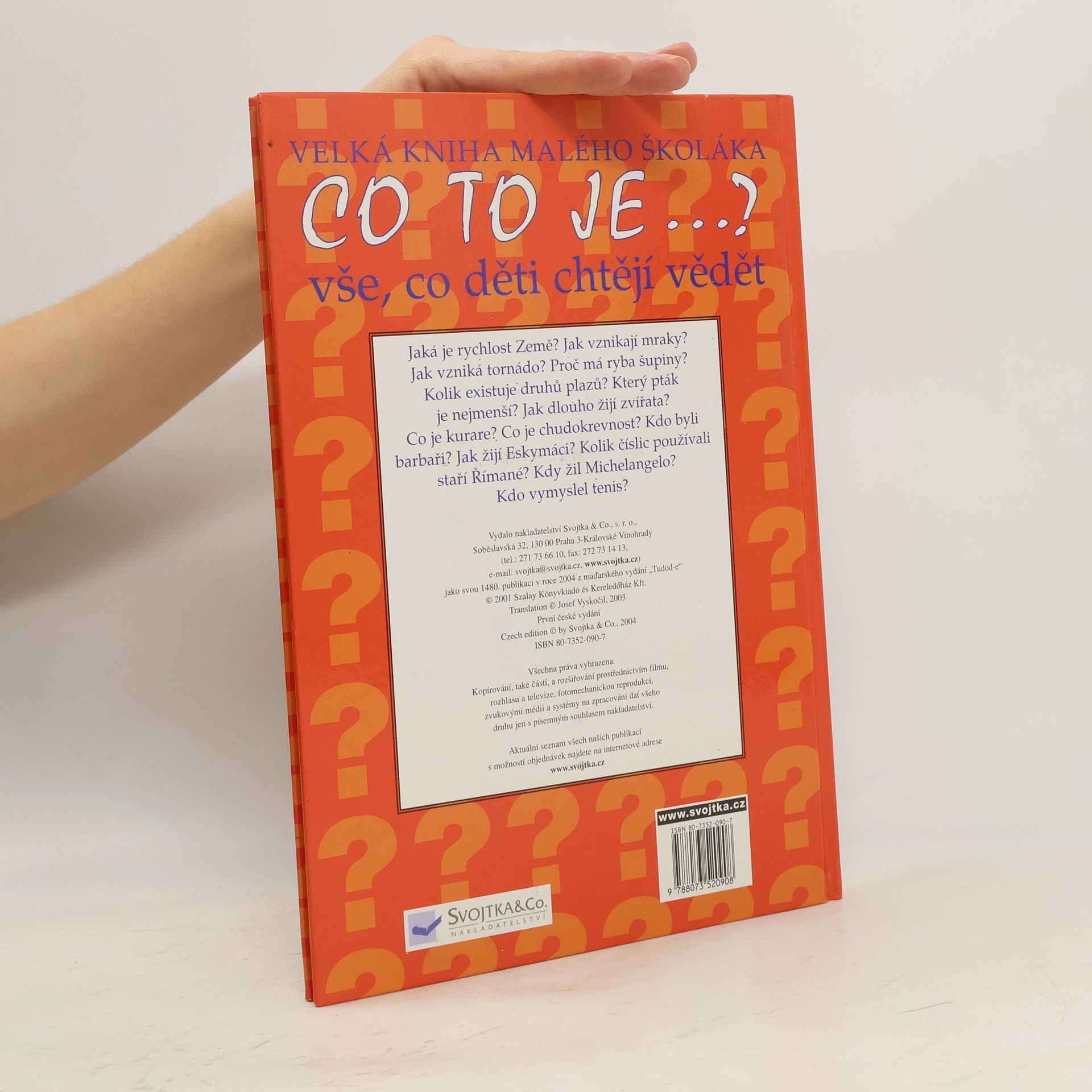 Vše, co děti chtějí vědět Jaká je rychlost Země? Jak vznikají mraky? Proš má ryba šupiny? Jak vzniká tornádo? Jak žijí Eskymáci? Kdo vymyslel tenis? ...... a spousty dalšího