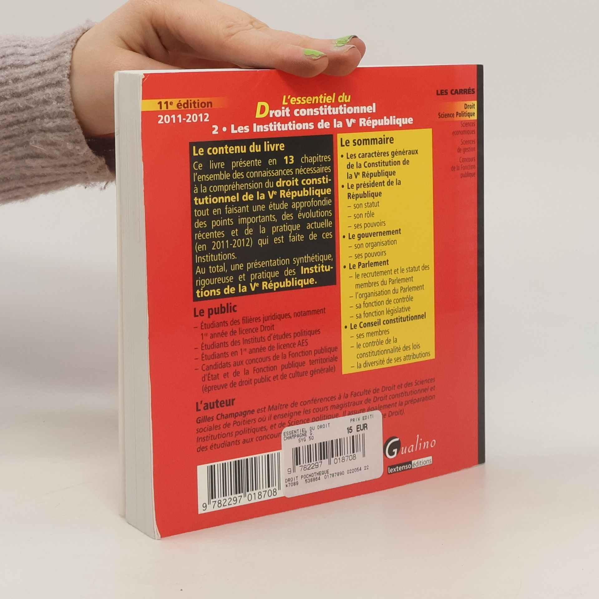 Ce livre présente en 13 chapitres l'ensemble des connaissances nécessaires à la compréhension du droit constitutionnel de la Ve République tout en faisant une étude approfondie des points importants, des évolutions récentes et de la pratique actuelle (en 2011-2012) qui est faite de ces Institutions. Au total, une présentation synthétique, rigoureuse et pratique des Institutions de la Ve République.