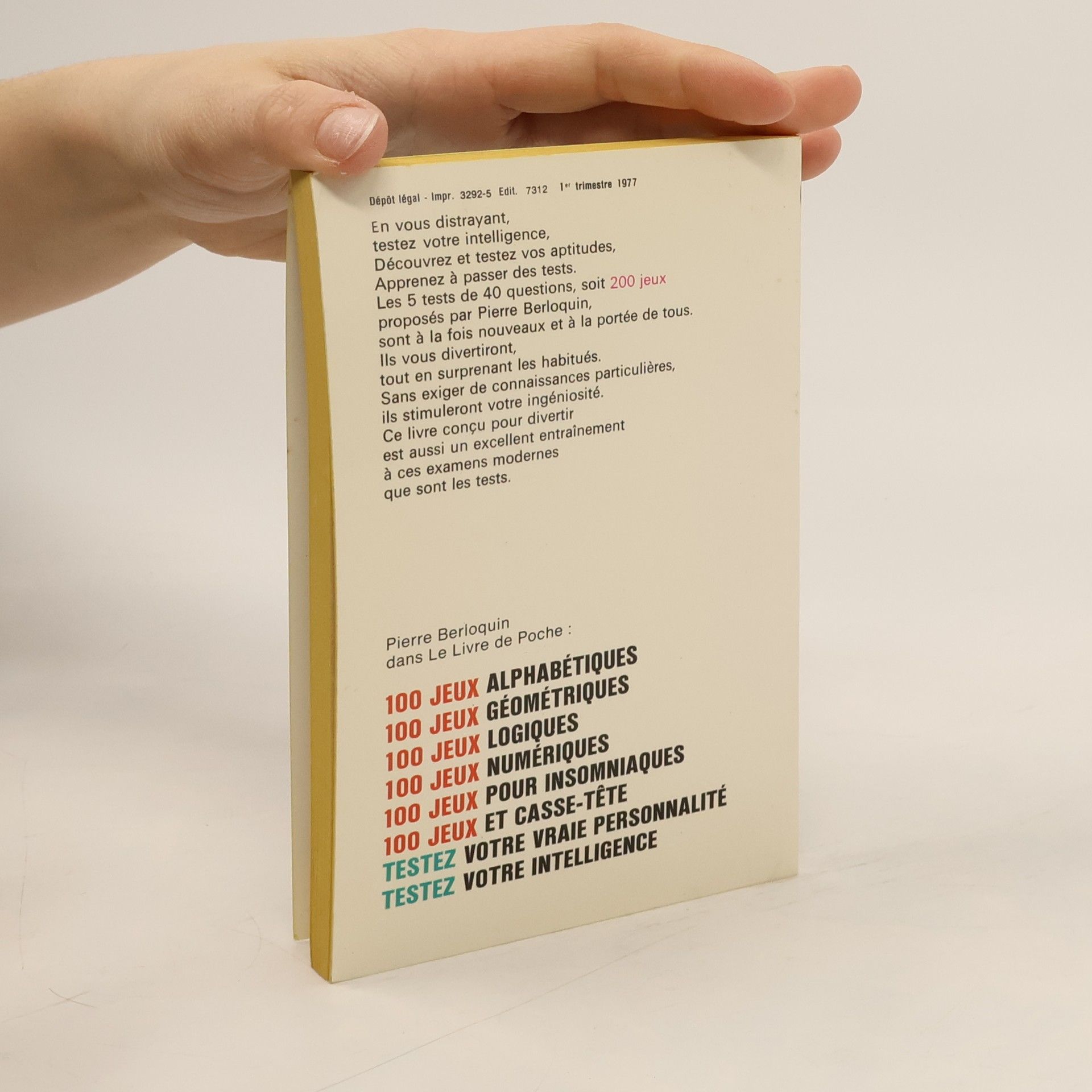 Testez votre intelligence, Découvrez et testez vos aptitudes, Apprenez à passer des tests... tout en vous distrayant. Sans exiger de connaissances particulières, les 5 tests de 40 questions - soit 200 jeux - proposés par Pierre Berloquin stimuleront votre ingéniosité.