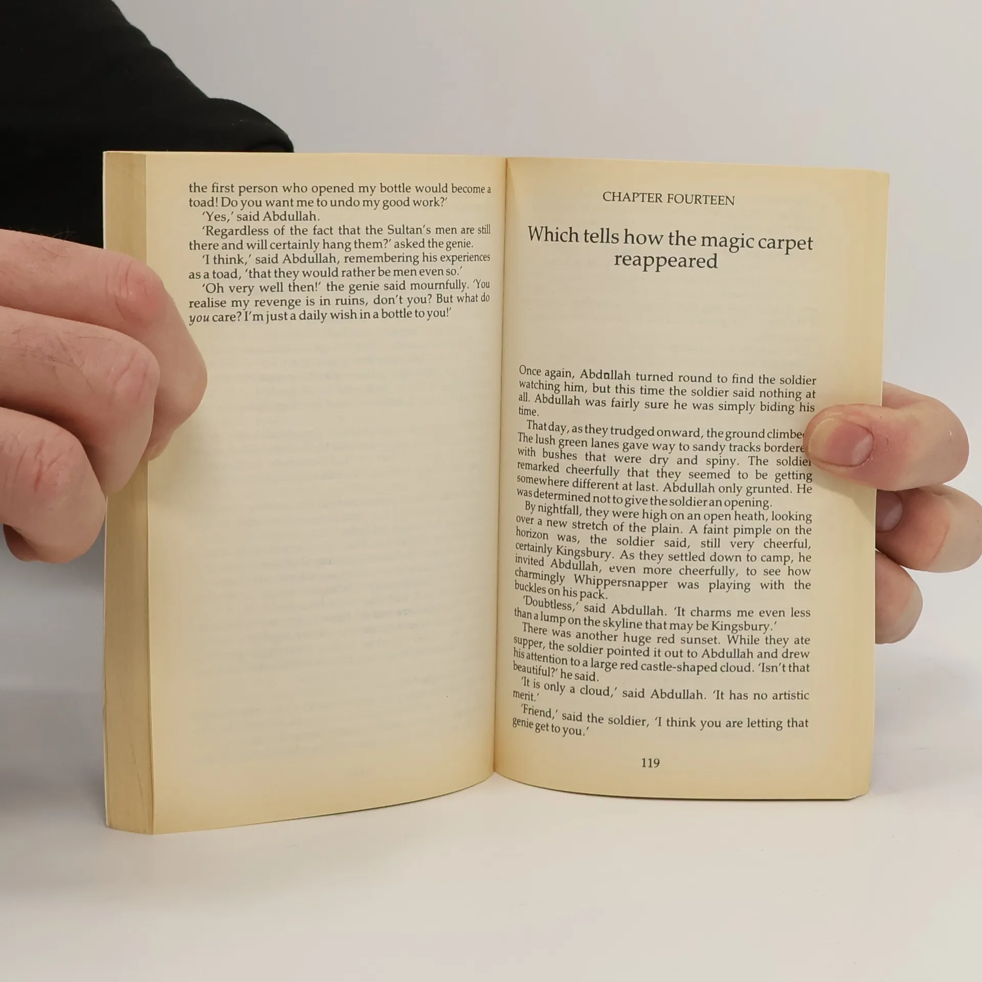 Abdullah dreams of a castle with gardens and a princess, until a threadbare carpet flies him to the Sultan's clever lovely daughter, Flower-in-the-Night and his dreams come true. When a djinn kidnaps her, he sets out to find her, helped by a cranky genie, a clever ex-corporal, and magic black cat Midnight.