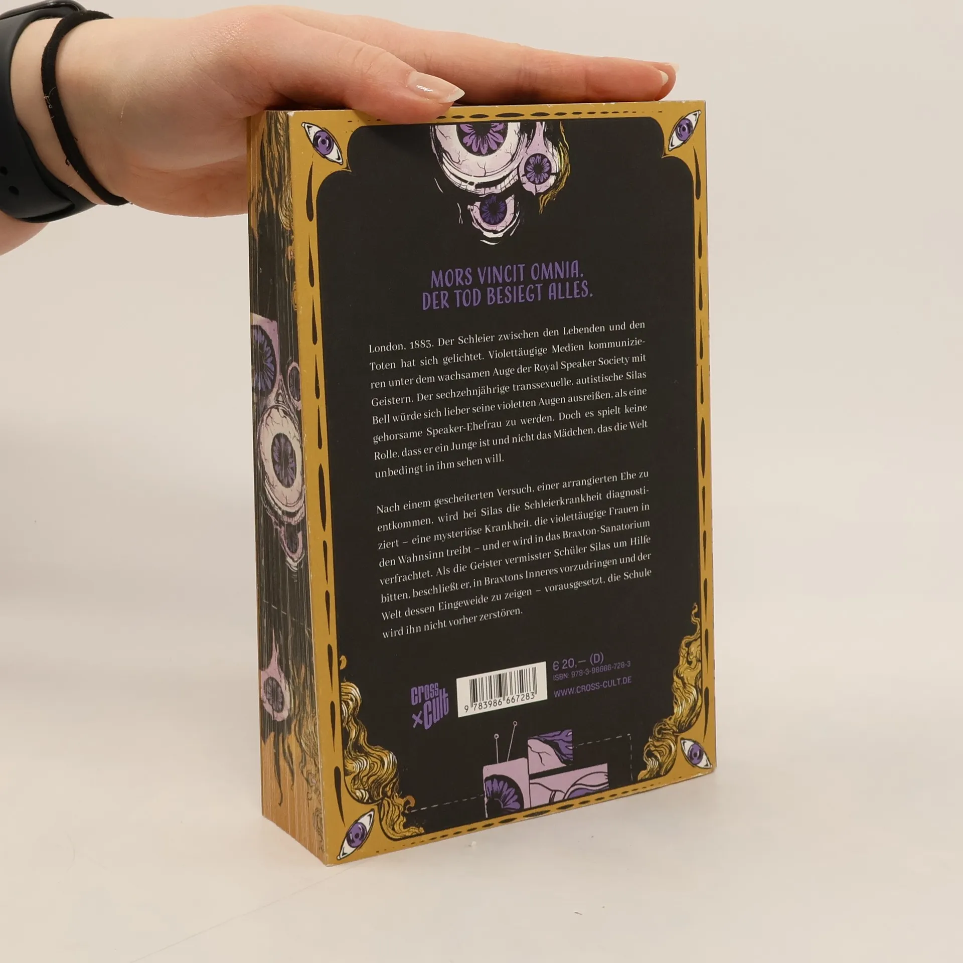 Ein blutgetränkter und ekelerregender Triumph, der wie ein Skalpell schneidet und sich wie dein dunkelster Albtraum liest. Mors vincit omnia. Der Tod besiegt alles. London, 1883. Der Schleier zwischen den Lebenden und den Toten hat sich gelichtet. Violettäugige Medien kommunizieren unter dem wachsamen Auge der Royal Speaker Society mit Geistern. Der sechzehnjährige transsexuelle, autistische Silas Bell würde sich lieber seine violetten Augen ausreißen, als eine gehorsame Speaker-Ehefrau zu werden. Doch es spielt keine Rolle, dass er ein Junge ist und nicht das Mädchen, das die Welt unbedingt in ihm sehen will. Nach einem gescheiterten Versuch, einer arrangierten Ehe zu entkommen, wird bei Silas die Schleierkrankheit diagnostiziert – eine mysteriöse Krankheit, die violettäugige Frauen in den Wahnsinn treibt – und er wird in das Braxton-Sanatorium verfrachtet. Als die Geister vermisster Schüler Silas um Hilfe bitten, beschließt er, in Braxtons Inneres vorzudringen und der Welt dessen Eingeweide zu zeigen – vorausgesetzt, die Schule wird ihn nicht vorher zerstören.