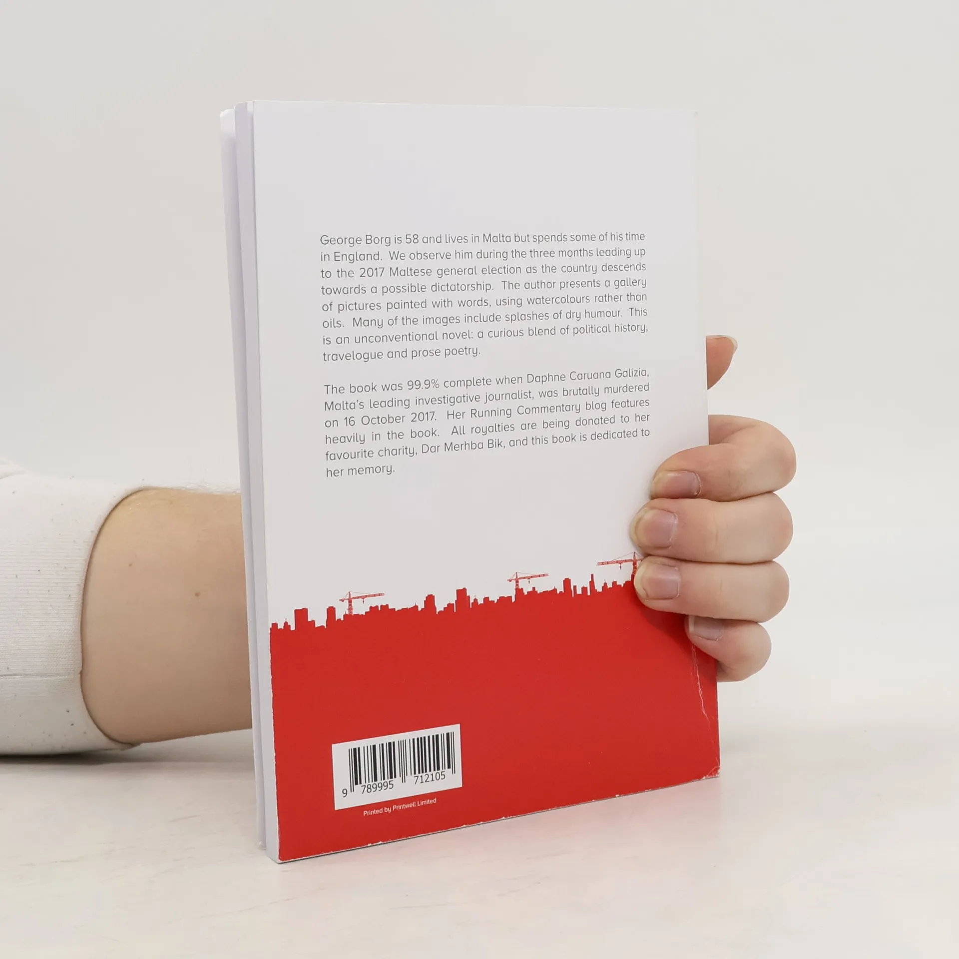 George Borg is 58 and lives in Malta but spends some of his time in England. We observe him during the three months leading up to the 2017 Maltese general election as the country descends towards a possible dictatorship. The author presents a gallery of pictures painted with words, using watercolours rather than oils. Many of the images include splashes of dry humour. This is an unconventional novel: a curious blend of political history, travelogue and prose poetry.The book was 99.9% complete when Daphne Caruana Galizia, Malta’s leading investigative journalist, was brutally murdered on 16 October 2017. Her Running Commentary blog features heavily in the book. All royalties are being donated to her favourite charity, Dar Merħba Bik, and this book is dedicated to her memory.