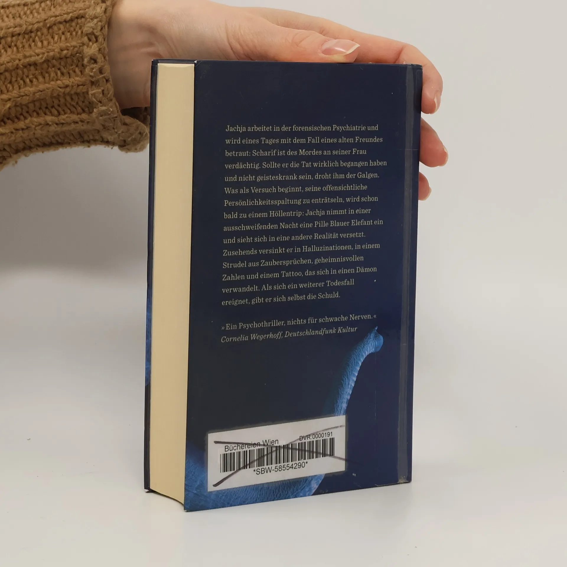 Jachja, Doktor der Psychologie, nimmt nach fünf Jahren selbstgewählter Isolation seine Arbeit in der forensischen Psychiatrie wieder auf. Sein erster Patient ist ein alter Bekannter: Scharîf ist des Mordes an seiner Frau verdächtig. Sollte er die Tat wirklich begangen haben und nicht geisteskrank sein, droht ihm der Galgen. Was als Versuch beginnt, die offensichtliche Persönlichkeitsspaltung seines alten Freundes zu enträtseln, wird schon bald zu einem Höllentrip: Als Jachja, der Drogen jeder Art nicht abgeneigt ist, in einer ausschweifenden Nacht eine Pille mit einem sechsbeinigen Elefanten einnimmt, sieht er sich in eine andere Realität versetzt. Zusehends versinkt er in Halluzinationen, in einem Strudel aus Zaubersprüchen, geheimnisvollen Zahlen und einem Tattoo, das sich in einen Dämon verwandelt. Als sich schließlich ein weiterer Todesfall ereignet, gibt er sich selbst die Schuld. Der packende, surrealistische Psychothriller ist nach "Vertigo" und "Diamantenstaub" der dritte Roman des ägyptischen Bestsellerautors. Er war 2014 für den International Prize for Arabic Fiction (Shortlist) nominiert, wurde im selben Jahr von Marwan Hamed verfilmt und 2015 von der Egyptian Modern Dance Theatre Company auf die Bühne gebracht.