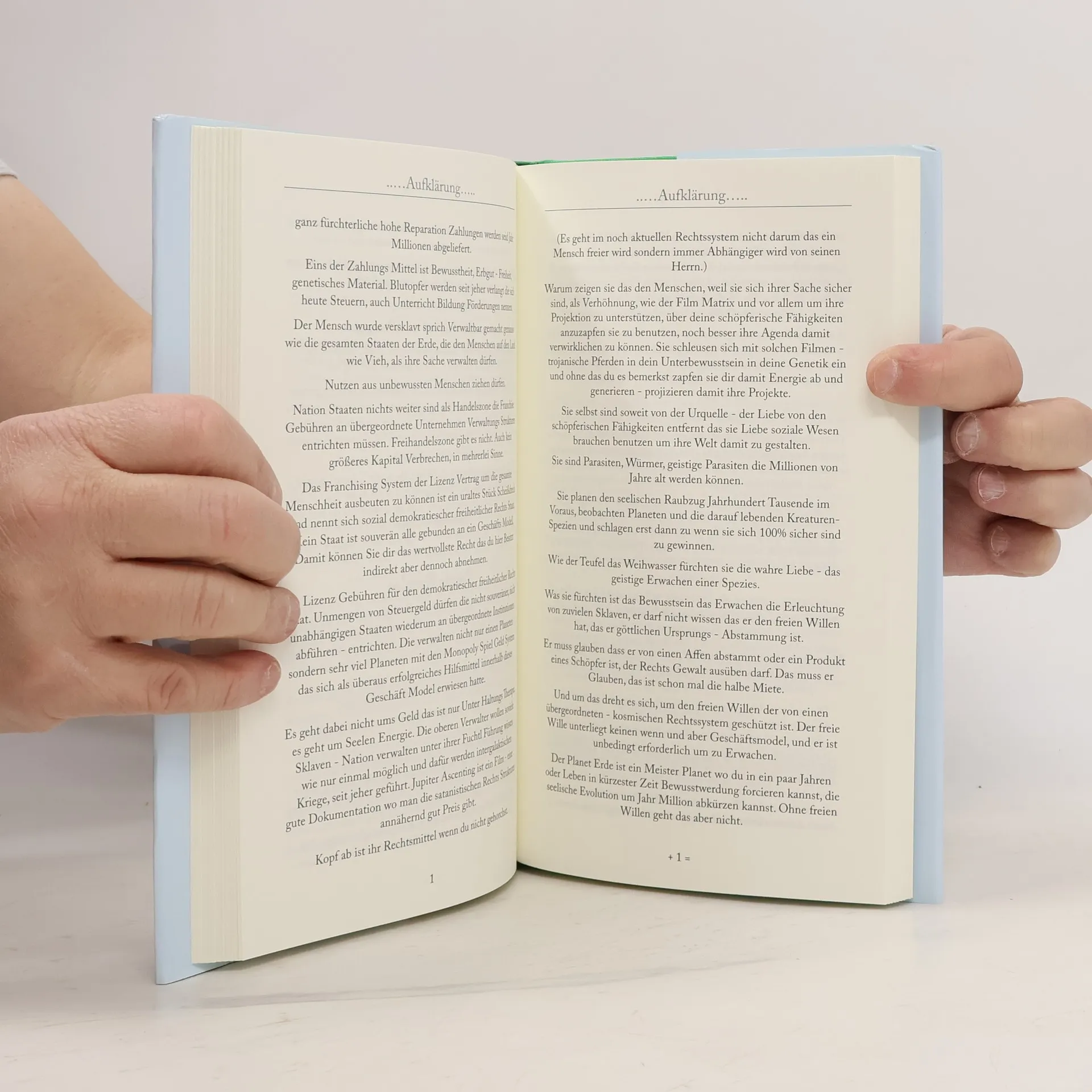 In "Klartext" wird die Gesellschaft als hypnotisiert und verlogen dargestellt, während der Autor zur Selbstreflexion und zum Erkennen der eigenen göttlichen Natur aufruft. Er kritisiert Politik und Religion als Trennendes und fordert die Leser auf, Verantwortung zu übernehmen und die Wahrheit zu suchen, um zur Erleuchtung zu gelangen.