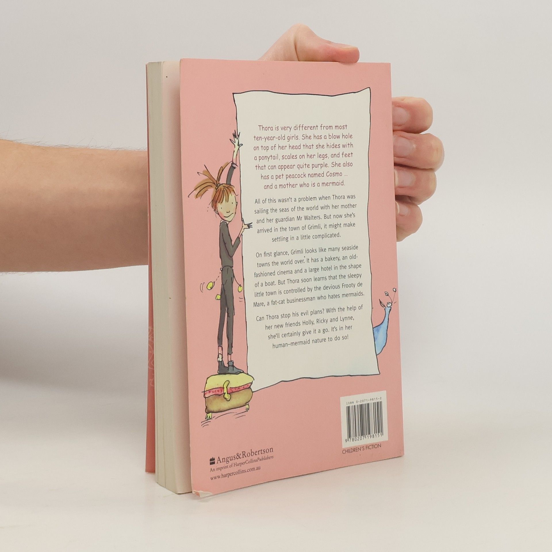 Thora's no ordinary girl. She's got scales on her legs, purple feet, and a blowhole that squirts water from the top of her head. Thora's a half-mermaid. And as mermaid law commands, Thora must spend ten years at sea and ten years on land. In a houseboat called the Loki, Thora sails the seas with her mermaid mother, Halla, and guard ian, Mr. Walters. But following her tenth birthday, Thora heads to the seaside town of Grimli, where her father grew up.<p>In Grimli, fat-cat tycoon Frooty de Mare will stop at nothing to expand his Tooty Frooty Enterprises. With the help of new friends and her pet peacock, Thora has her work cut out thwarting Frooty's evil plans -- not to mention doing a bit of exploring into her own Grimli roots.</p><p>Gillian Johnson's fanciful tale captures the unflappable spirit of an exceptional young heroine who, despite being half-mermaid, somehow always manages to land on her feet.</p>
