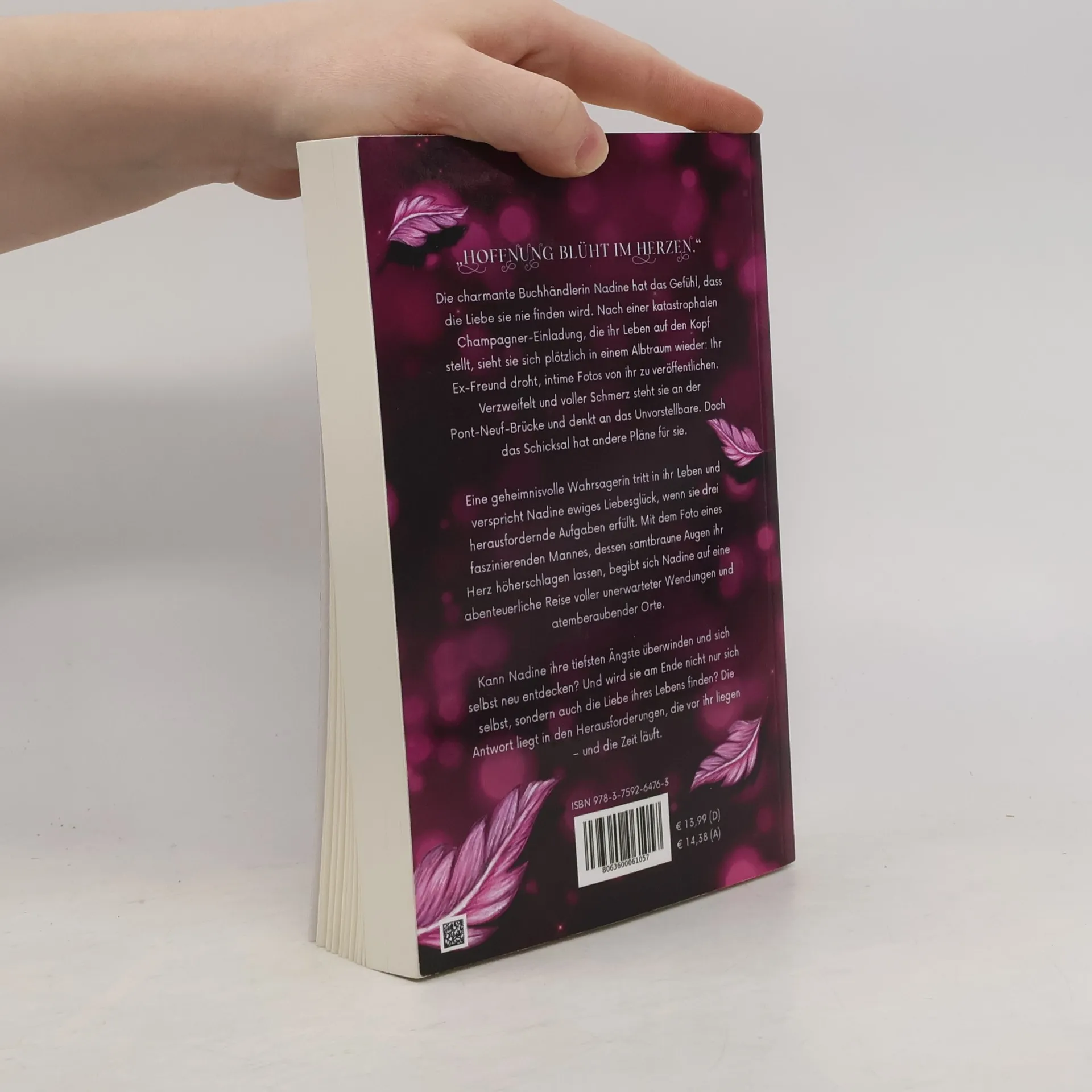 „Hoffnung blüht im Herzen.“ Die charmante Buchhändlerin Nadine hat das Gefühl, dass die Liebe sie nie finden wird. Nach einer katastrophalen Champagner-Einladung, die ihr Leben auf den Kopf stellt, sieht sie sich plötzlich in einem Albtraum wieder: Ihr Ex-Freund droht, intime Fotos von ihr zu veröffentlichen. Verzweifelt und voller Schmerz steht sie an der Pont-Neuf-Brücke und denkt an das Unvorstellbare. Doch das Schicksal hat andere Pläne für sie. Eine geheimnisvolle Wahrsagerin tritt in ihr Leben und verspricht Nadine ewiges Liebesglück, wenn sie drei herausfordernde Aufgaben erfüllt. Mit dem Foto eines faszinierenden Mannes, dessen samtbraune Augen ihr Herz höherschlagen lassen, begibt sich Nadine auf eine abenteuerliche Reise voller unerwarteter Wendungen und atemberaubender Orte. Kann Nadine ihre tiefsten Ängste überwinden und sich selbst neu entdecken? Und wird sie am Ende nicht nur sich selbst, sondern auch die Liebe ihres Lebens finden? Die Antwort liegt in den Herausforderungen, die vor ihr liegen – und die Zeit läuft.