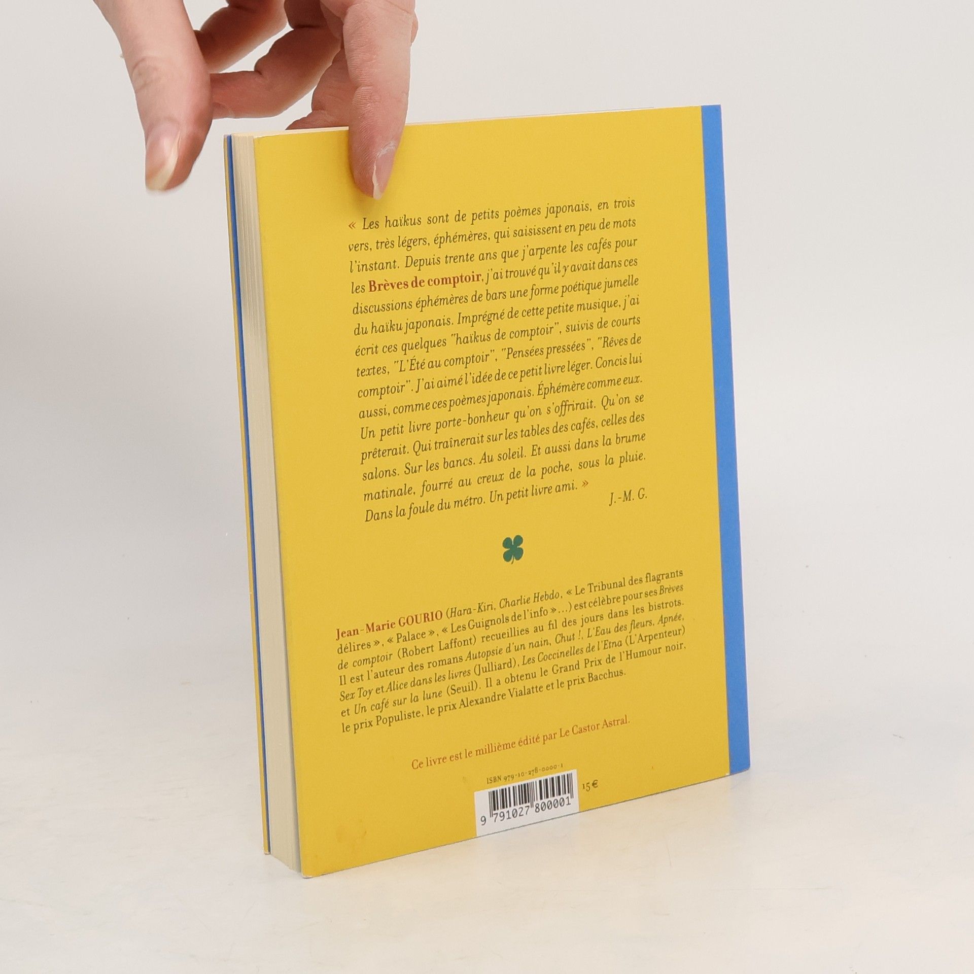 "Les haïkus sont de petits poèmes japonais, en trois vers, très légers, éphémères, qui saisissent en peu de mots l'instant. Depuis trente ans que j'arpente les cafés pour les Brèves de comptoir, j'ai trouvé qu'il y avait dans ces discussions éphémères de bars une forme poétique jumelle du haïku japonais, le "haïku de comptoir". Imprégné de cette petite musique, j'ai écrit ces quelques "haïkus de comptoir" que je vous donne à lire, suivis de courts textes, "L'Eté au comptoir", "Pensées pressées", "Rêves de comptoir". J'ai aimé l'idée de ce petit livre léger. Concis lui aussi comme ces poèmes japonais. Ephémère comme eux. Un petit livre porte-bonheur qu'on s'offrirait. Qu'on se prêterait. Qui traînerait sur les tables des cafés. Sur les bancs. Au soleil. Et aussi dans la brume matinale, fourré au creux de la poche, sous la pluie. Dans la foule du métro. Un petit livre ami." J.-M. G.