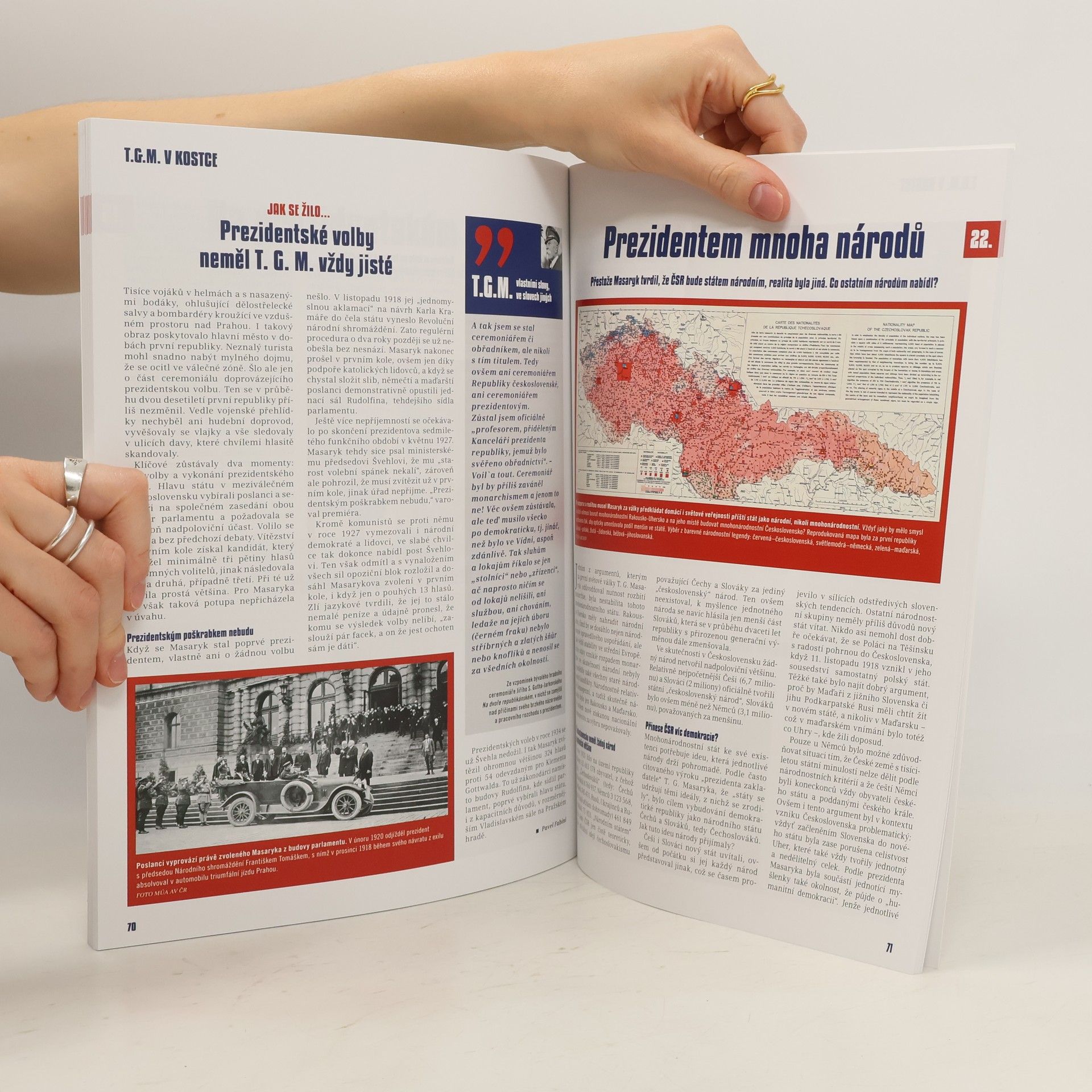 Kniha vychází z úspěšného seriálu publikovaného na stránkách deníku Lidové noviny. Kniha T. G. M. v kostce se přehlednou a čtivou formou zaměřuje na významné aspekty života prvního československého prezidenta Tomáše Garrigua Masaryka a nabízí základní orientaci v tématu. Zabývá se jeho dětstvím, studijními léty, rodinou, akademickými přemi i politickým angažmá. Představuje profilující osobnost české společnosti, aktéra mnoha kauz, jenž získal věhlas i v zahraničí. Masaryk je ukázán jako syn, otec, politik, vědec, profesor i státník, jako muž, který překročil svou dobu veřejným působením i soukromým životem. Každá kapitola je doplněna rubrikou Jak se žilo, přibližující atmosféru doby, a medailonem osobnosti. Na knize se podílela řada odborníků, kteří ve svých tématech zohlednili nejnovější poznatky historiografie. Širší autorský tým nabízí různé náhledy na T. G. Masaryka a interpretačně rozmanitý výklad. Bohatě ilustrovaná publikace obsahuje dobové fotografie, karikatury, mapy a faksimile dokumentů. Kniha vychází ze seriálu, který se na stránkách Lidových noviny objevil na podzim roku 2017.