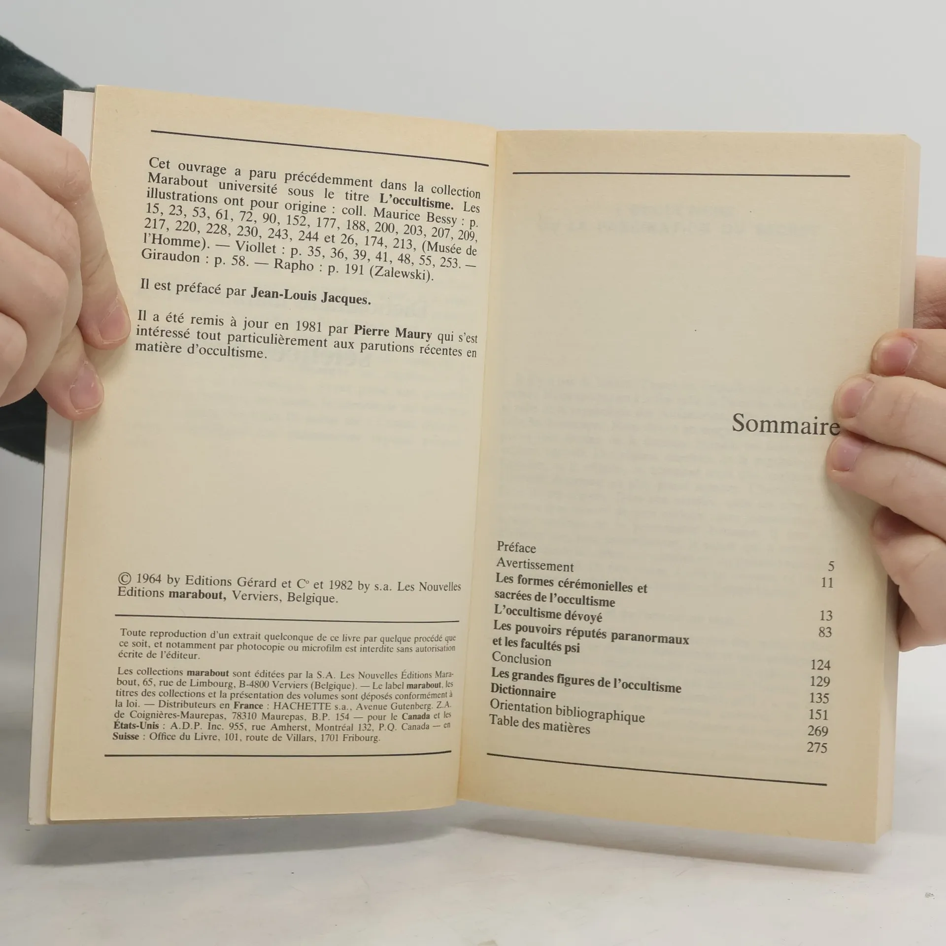 Maurepas. 18 cm. 264 p. Précédemment paru sous le titre : L'Occultisme Bibliogr. 6 p. Encuadernación en tapa blanda de editorial ilustrada. Idioma Francés. Texte imprimé. préface de Jean-Louis Jacques . Nouvelle éd. . mise Áa jour par Pierre Maury . impr. en Belgique. ill. , couv. en coul. Collection Marabout service. 491 .. Este libro es de segunda mano y tiene o puede tener marcas y señales de su anterior propietario. ISBN: 2501001540