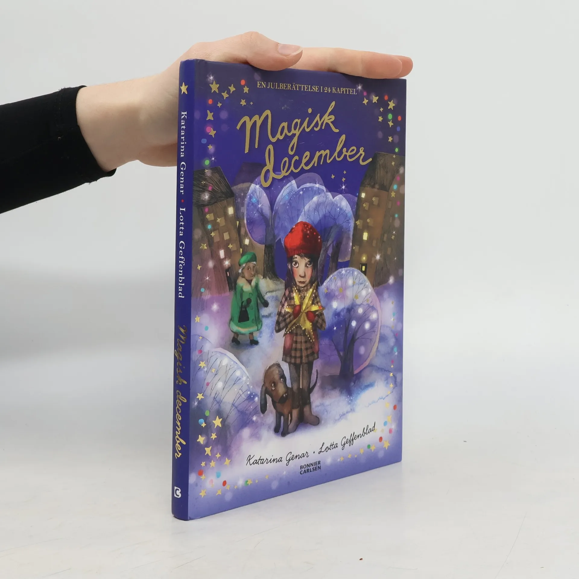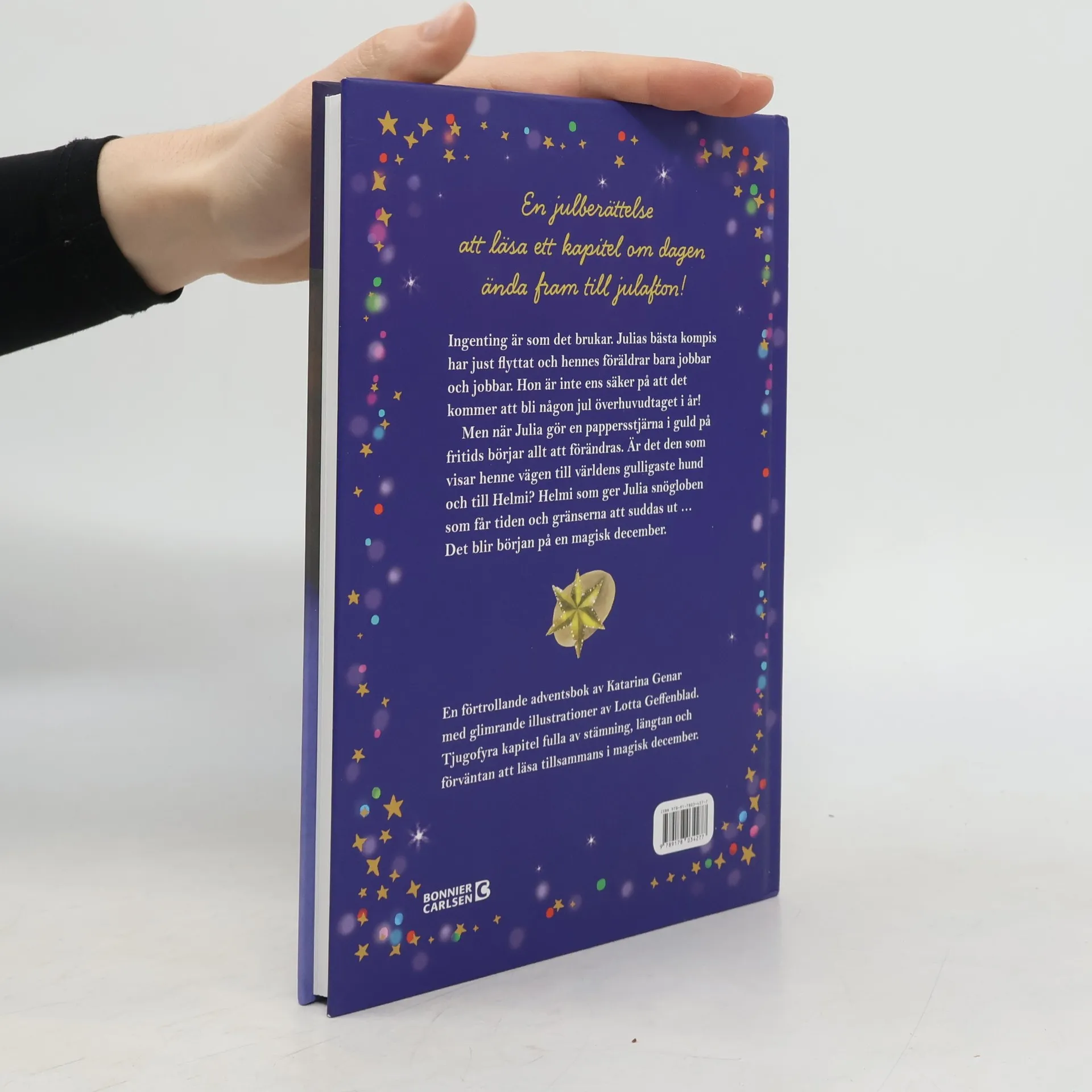 En gnistrande julberättelse att läsa ett kapitel om dagen ända fram till julafton! Ingenting är som det brukar. Julias bästa kompis har just flyttat och hennes föräldrar bara jobbar och jobbar. Hon är inte ens säker på att det kommer att bli någon jul överhuvudtaget i år! Men när Julia gör en pappersstjärna i guld på fritids börjar allt förändras. Är det den som visar henne vägen till världens gulligaste hund och till Helmi? Helmi som ger Julia den magiska globen som får tiden och gränserna att suddas ut … Det blir starten på en magisk december.En förtrollande adventsbok av Katarina Genar med glimrande illustrationer av Lotta Geffenblad. Tjugofyra kapitel fulla av stämning, längtan och förväntan att läsa tillsammans i magisk december.