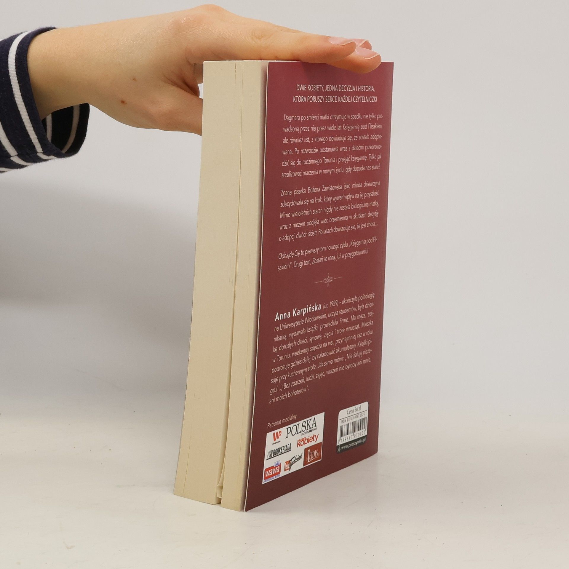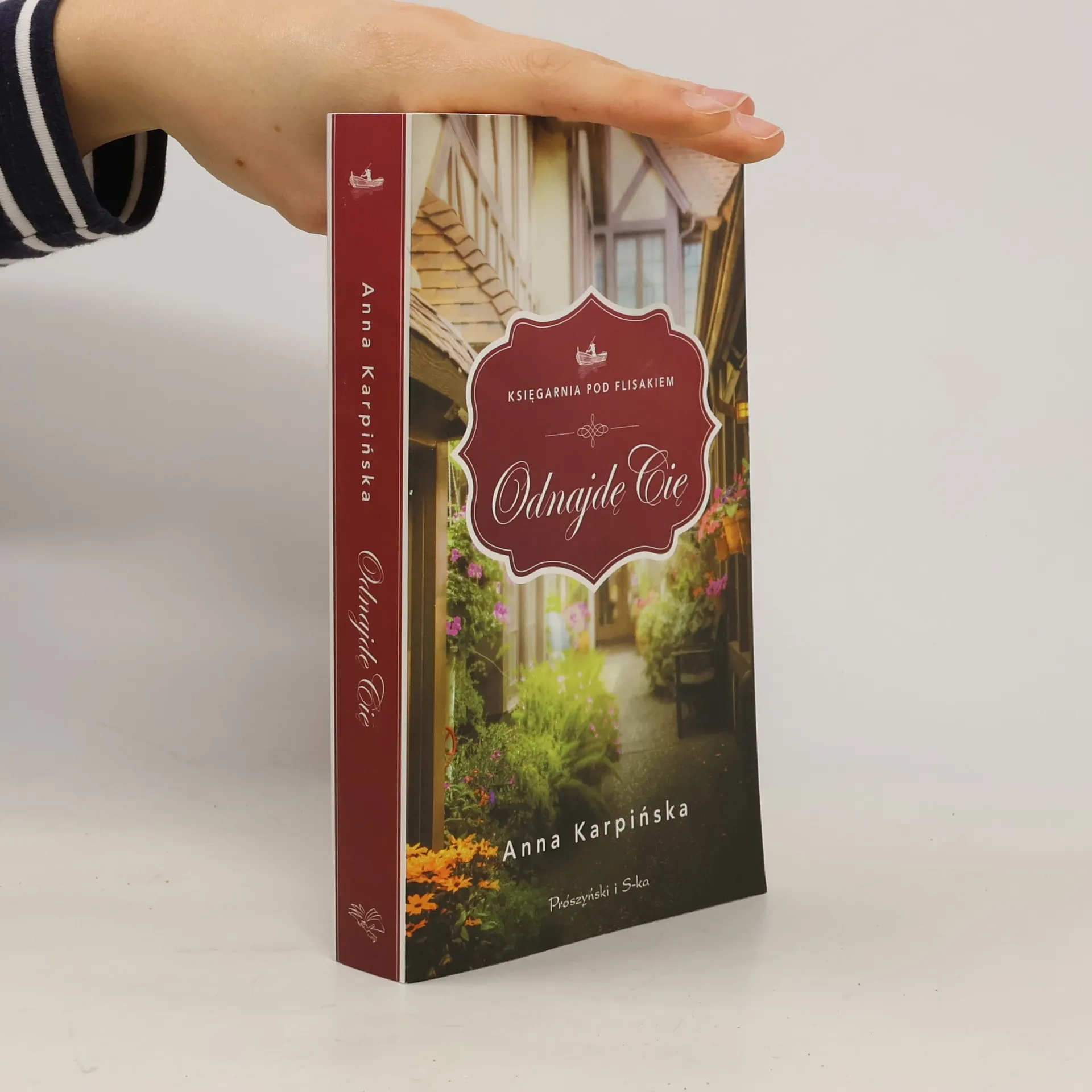 Dwie kobiety, jedna decyzja i historia, kt�ra poruszy serce każdej czytelniczki. Dagmara po śmierci matki otrzymuje w spadku nie tylko prowadzoną przez nią przez wiele lat Księgarnię pod Flisakiem, ale r�wnież list, z kt�rego dowiaduje się, że została adoptowana. Po rozwodzie postanawia wraz z dziećmi przeprowadzić się do rodzinnego Torunia i przejąć księgarnię. Tylko jak zrealizować marzenia w nowym życiu, gdy dopada nas stare? Znana pisarka Bożena Zawistowska jako młoda dziewczyna zdecydowała się na krok, kt�ry wywarł wpływ na jej przyszłość. Mimo wieloletnich starań nigdy nie została biologiczną matką, wraz z mężem podjęła więc brzemienną w skutkach decyzję o adopcji dw�ch si�str. Po latach dowiaduje się, że jest chora? ?Odnajdę Cię? to pierwszy tom nowego cyklu ?Księgarnia pod Flisakiem?. Drugi tom, ?Zostań ze mną?, już w przygotowaniu! Anna Karpińska (ur. 1959) ? ukończyła politologię na Uniwersytecie Wrocławskim, uczyła student�w, była dziennikarką, wydawała książki, prowadziła firmę. Ma męża, tr�jkę dorosłych dzieci, synową, zięcia i troje wnucząt ? Krzysia, Adasia i Weronikę. Mieszka w Toruniu, weekendy spędza na wsi, przynajmniej raz w roku podr�żuje gdzieś dalej, by naładować akumulatory. Książki pisuje przy kuchennym stole. Jak sama m�wi: ?Nie żałuję niczego.(?) Bez zdarzeń, ludzi, zajęć, wrażeń nie byłoby ani mnie, ani moich bohater�w?.