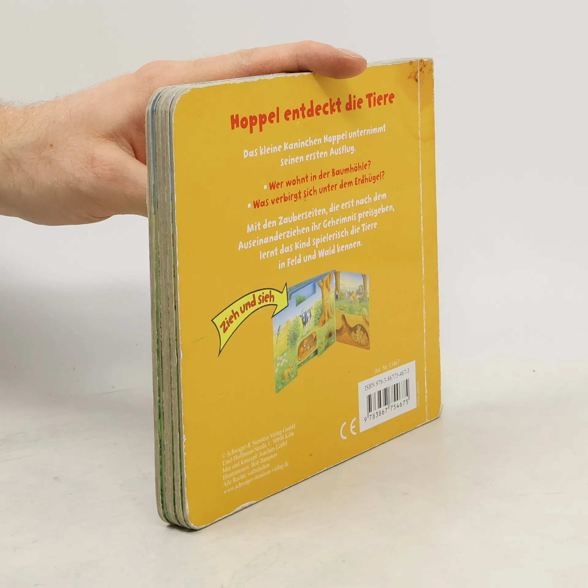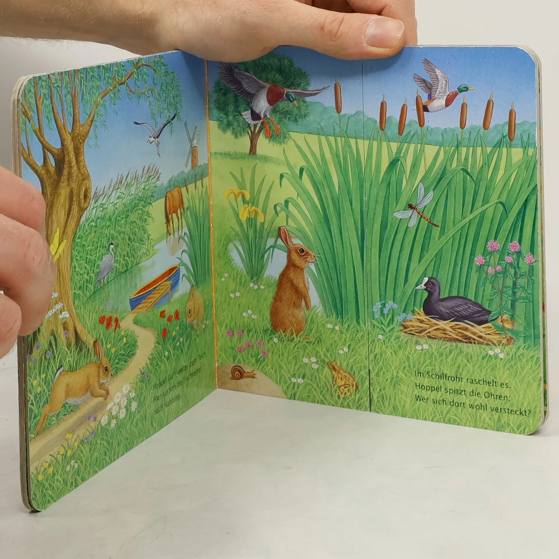 Der kleine Hase Hoppel entdeckt die Tiere auf der Wiese, im Wald und am See. Diese Entdeckungstour ist für das Kind besonders spannend, weil das Buch seine Geheimnisse nicht auf den ersten Blick freigibt. Erst wenn das Kind bestimmte Buchseiten auseinanderzieht, kommt so manche Überraschung zum Vorschein.
