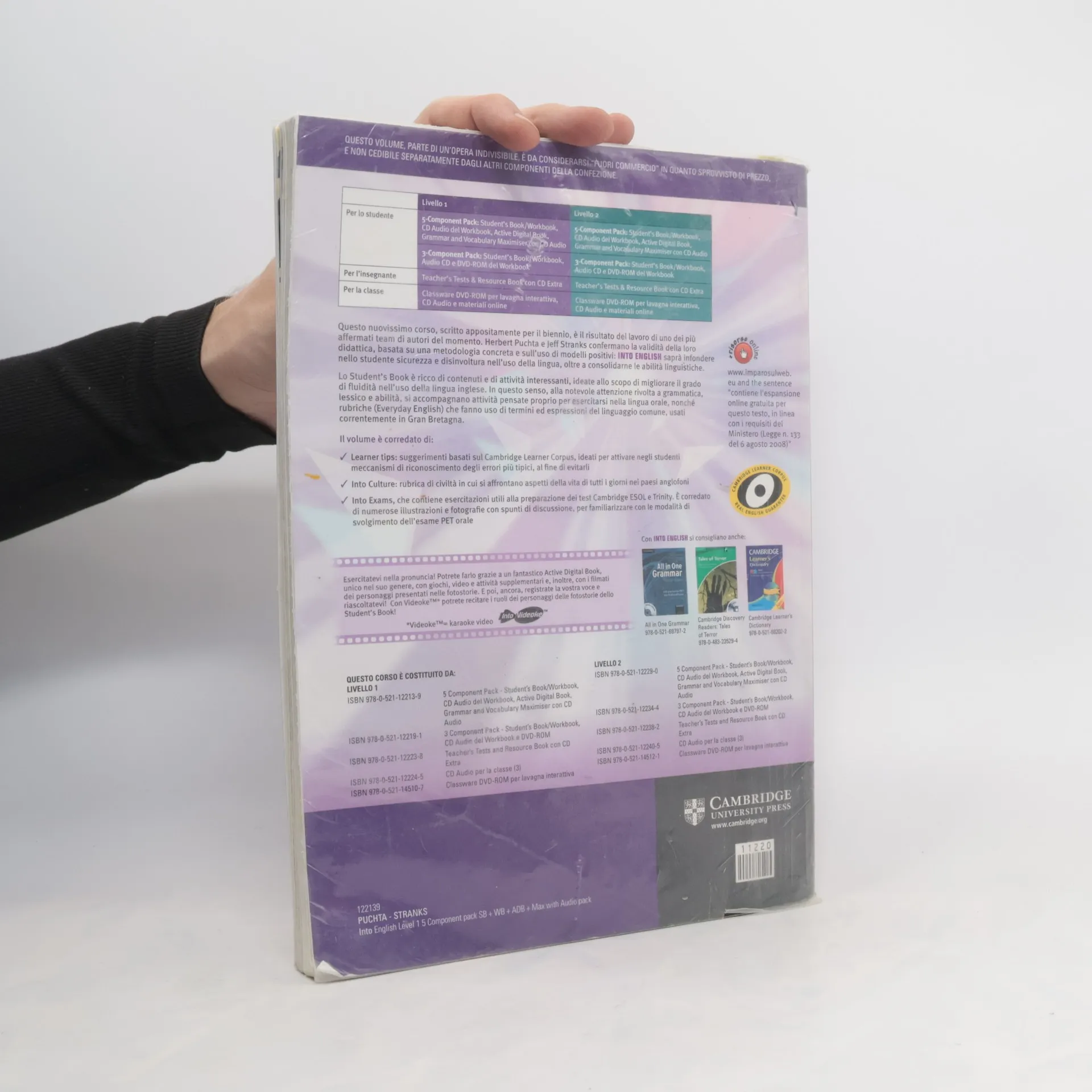 A new course for the scuola superiore. Into English is a three-level course for teenagers. Each level of the course provides 80-90 hours of class work. The course can be used with mixed-ability classes. This pack contains a Student's Book and Workbook with an Audio CD and a DVD-ROM, as well as a Grammar and Vocabulary Maximiser booklet with an Audio CD.