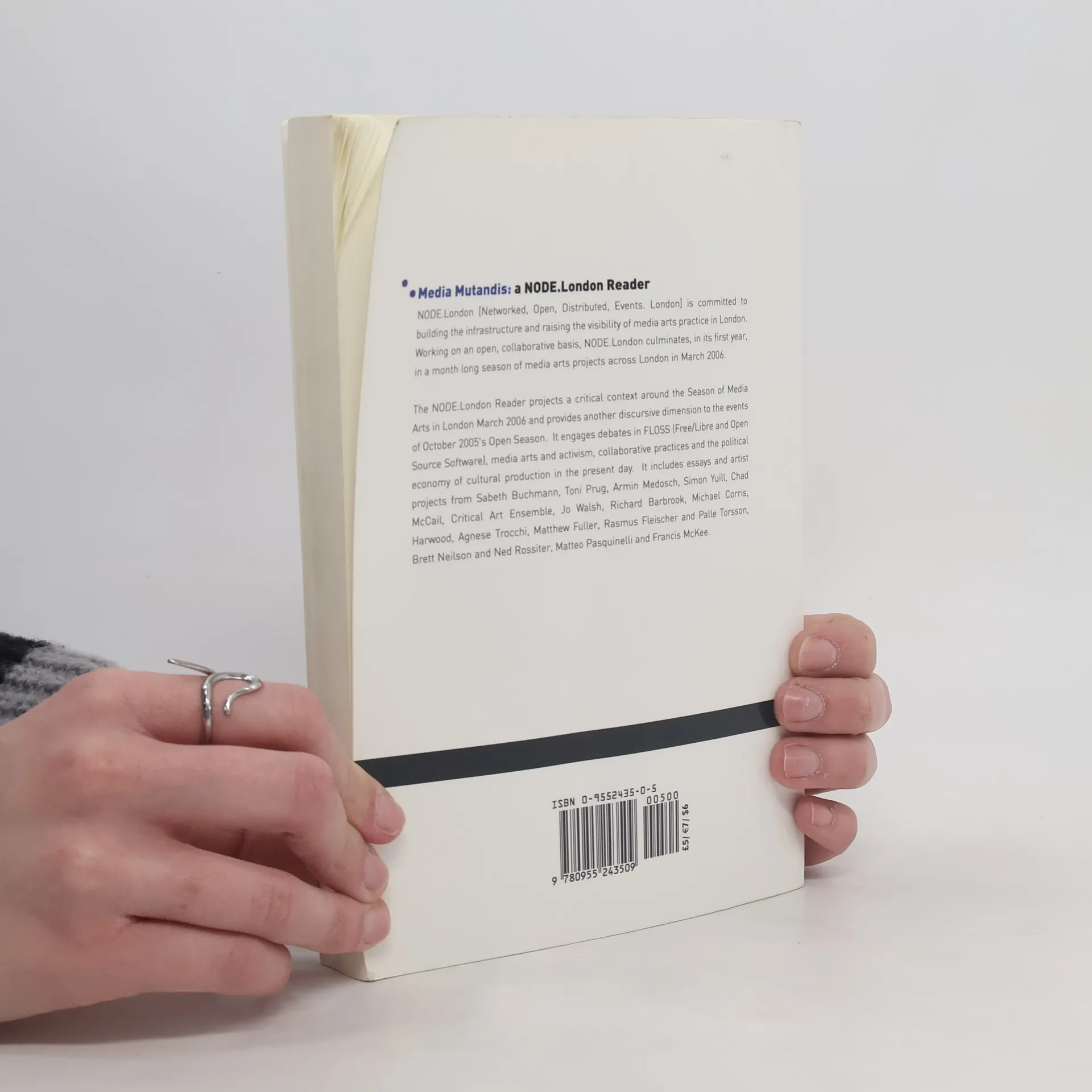 The NODE.London Reader projects a critical context around the Season of Media Arts in London March 2006 and provides another discursive dimension to the events of October 2005's Open Season. It engages debates in FLOSS (Free/Libre and Open Source Software), media arts and activism, collaborative practices and the political economy of cultural production in the present day. It includes essays and artist projects from Sabeth Buchmann, Toni Prug, Armin Medosch, Simon Yuill, Chad McCail, Critical Art Ensemble, Jo Walsh, Richard Barbrook, Michael Corris, Harwood, Kate Rich, Agnese Trocchi, Matthew Fuller, Rasmus Fleischer and Palle Torsson, Brett Neilson and Ned Rossiter, Matteo Pasquinelli and Francis McKee.